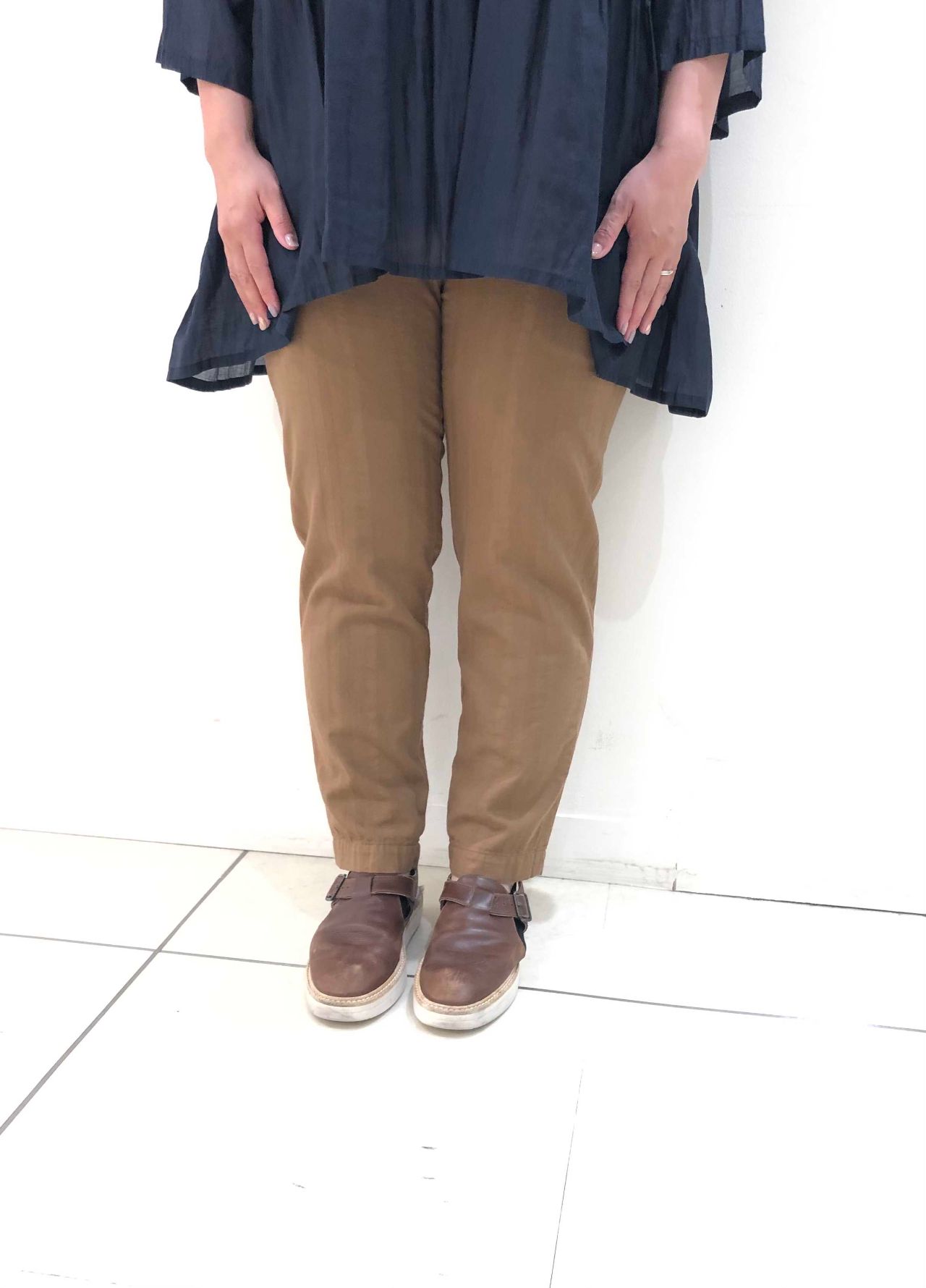 ヒップが隠れる長さで、スッキリめの細いパンツと相性抜群です。