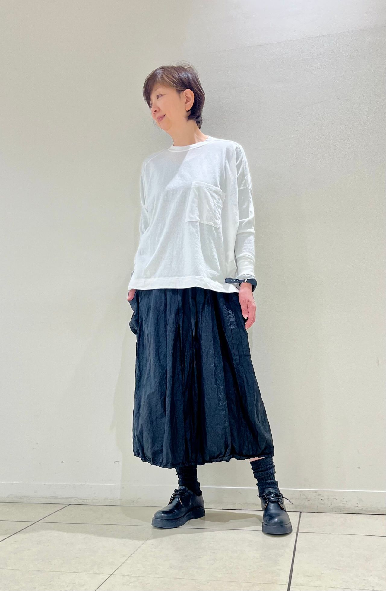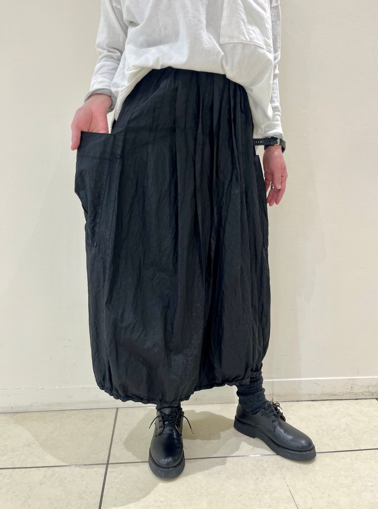 裾にゴムが通ってるのでバルーンシルエットになっております。