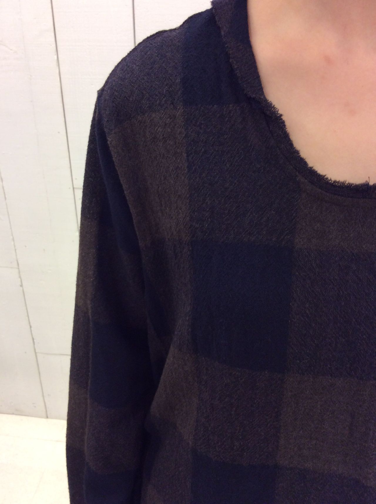 動きを出すため、衿を折り返しても立てても着れる裁ち切り衿にしています。