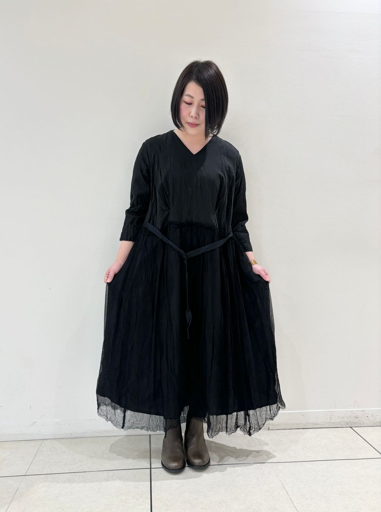 Vカットが美しいマテリアルミックスのドレス。