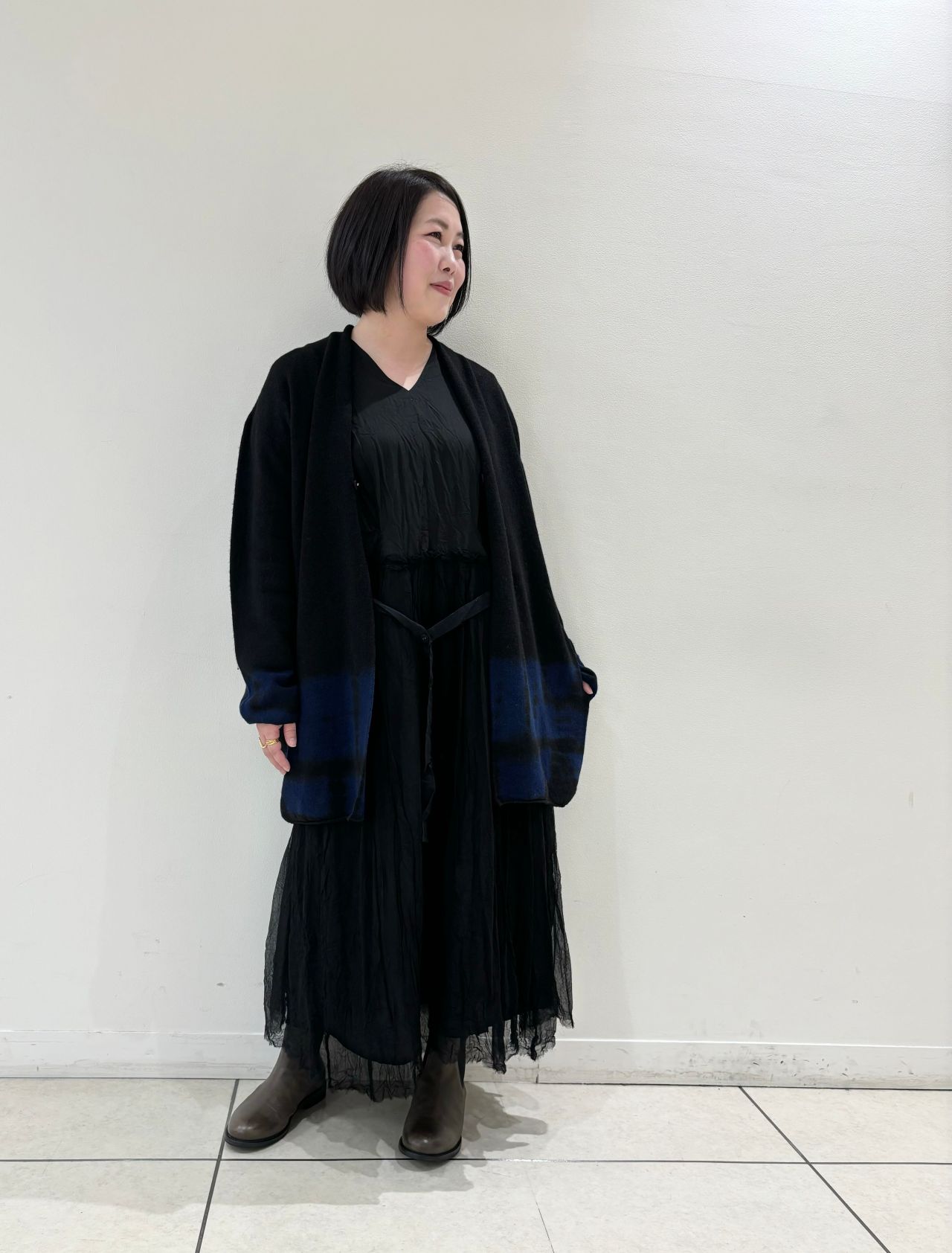 ロングニットカーディガンやジャケットで、落ち着いた大人の着こなしを。
