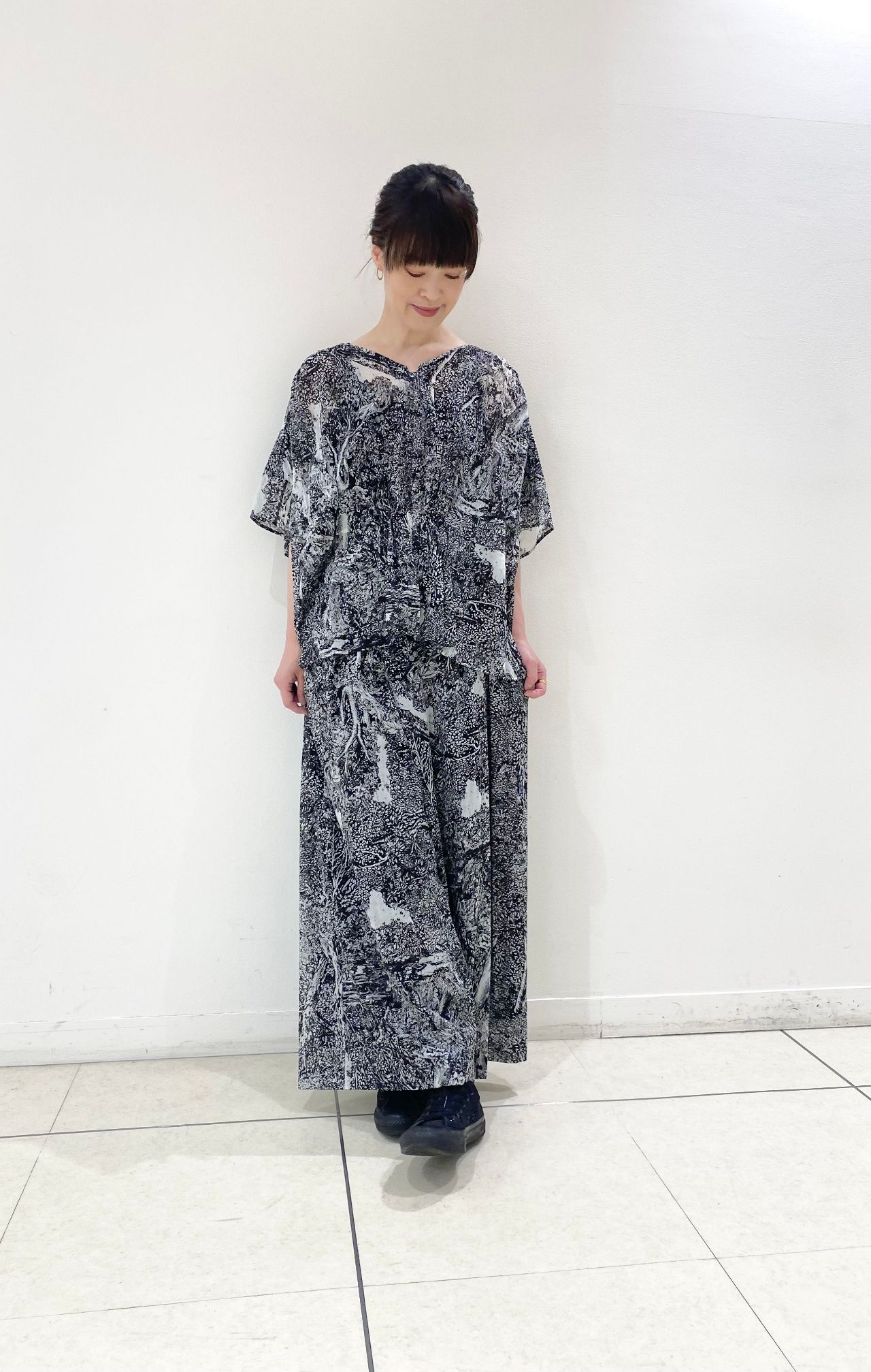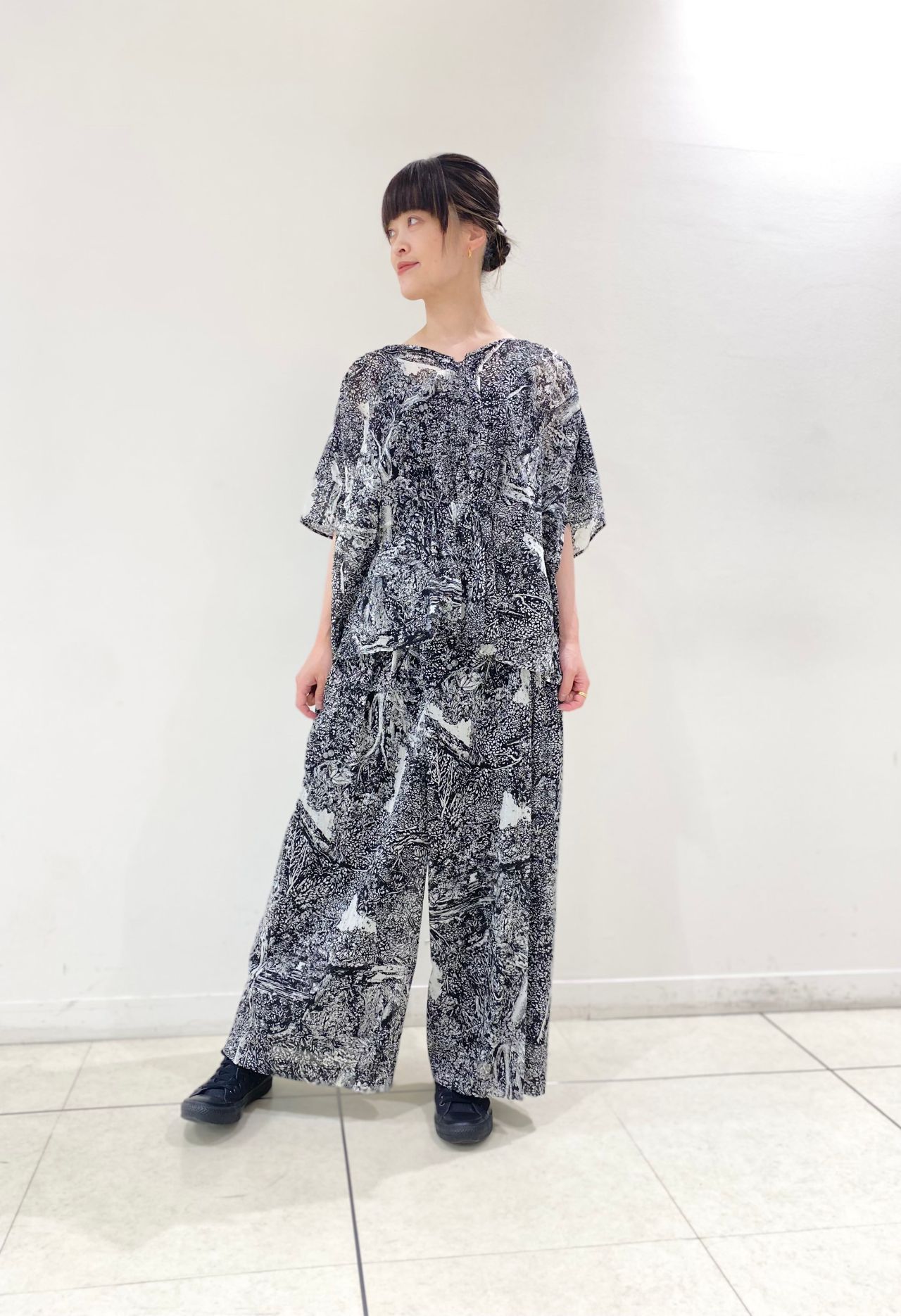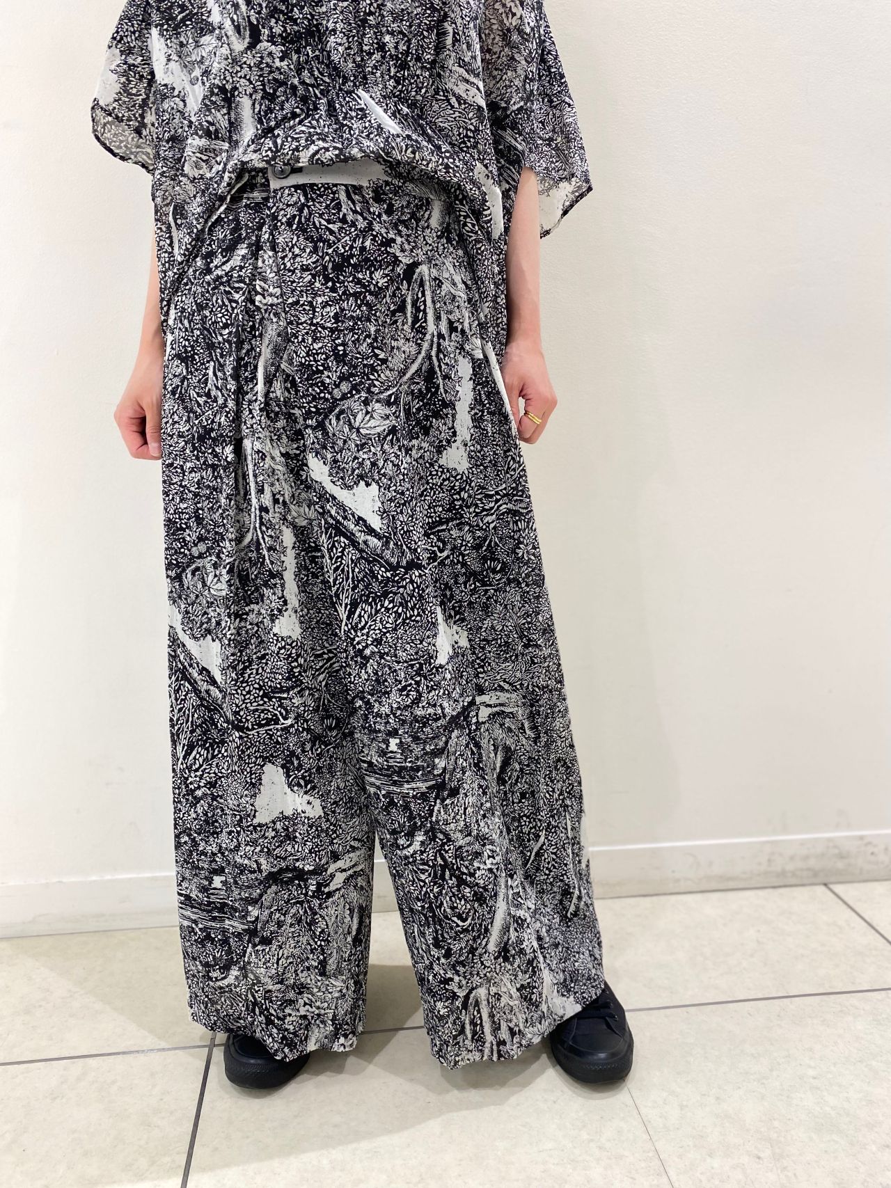 パンツはフロントタックなワイドパンツ。