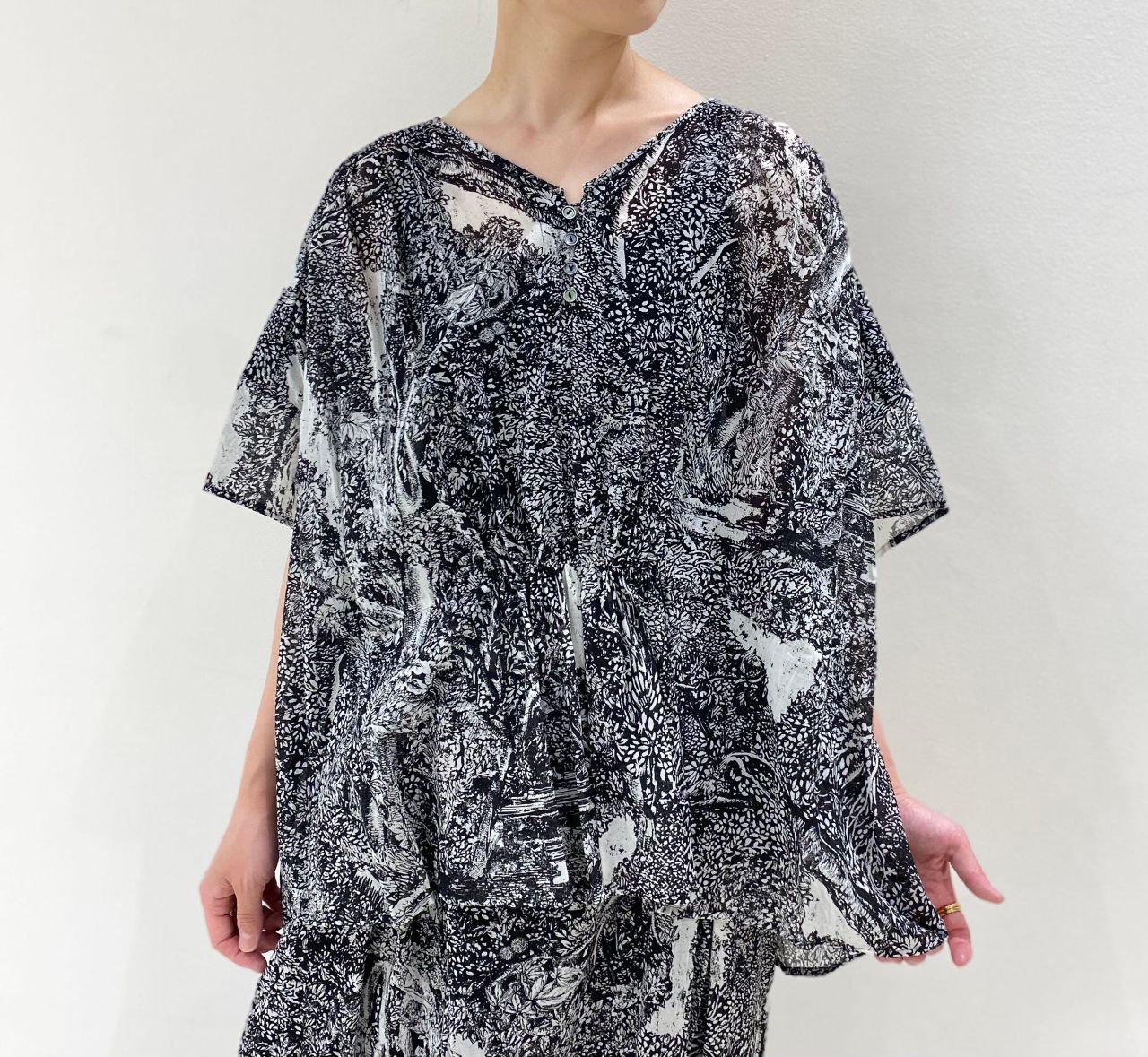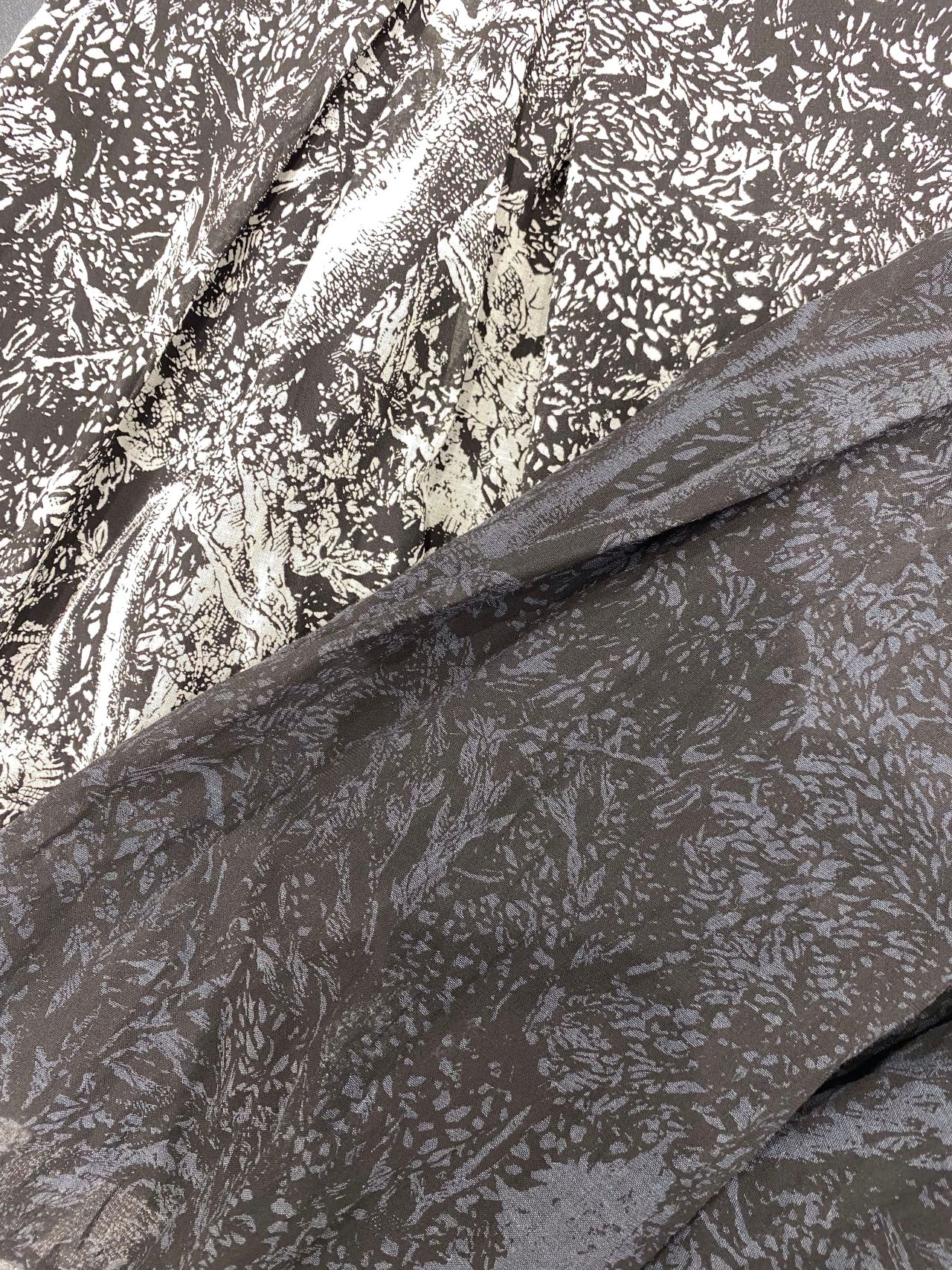 キュプラの滑らかな肌ざわりとコットンのナチュラル感を加えたボイル素材にプリントしております。