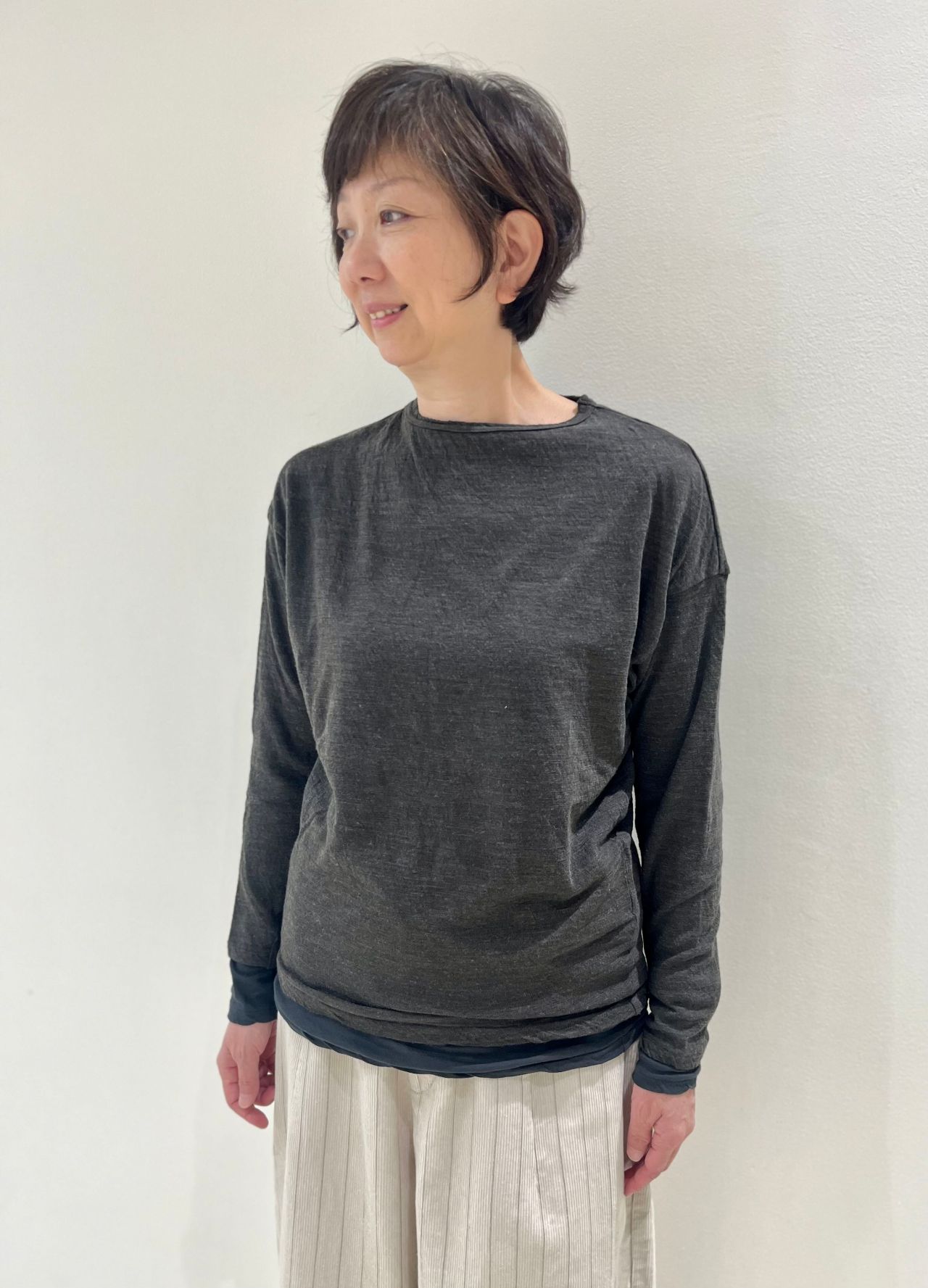インナーはコットン100%でシンプルな長袖Tシャツです。落ち着いたカッコ良いコンビ使い衿 袖口 裾から微妙なレングス差がチラ見せできおしゃれな装いになります。