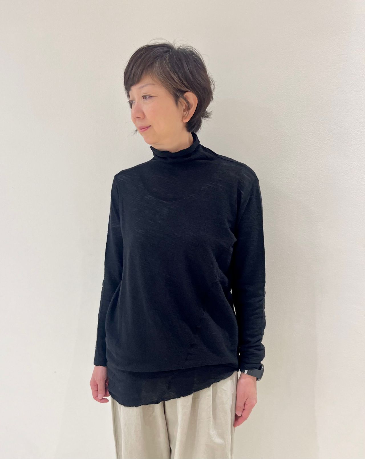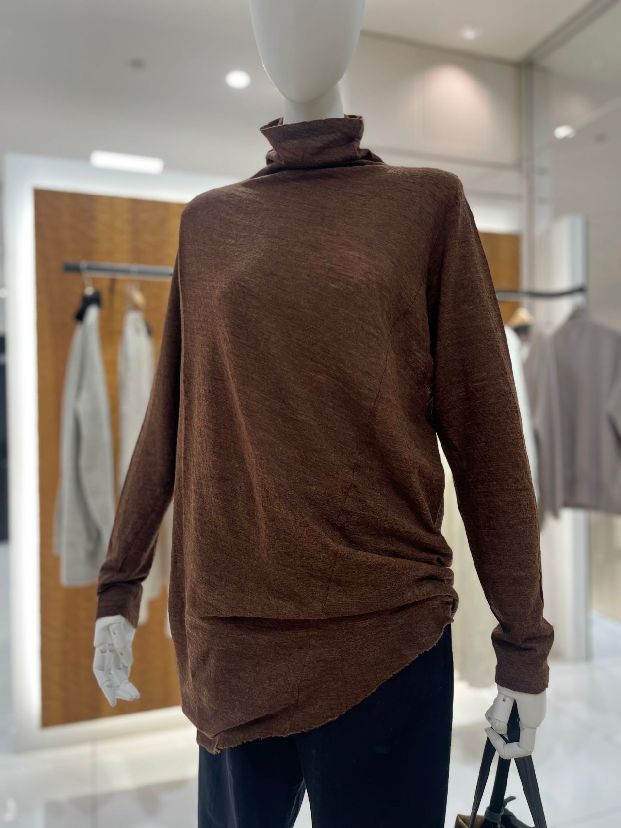 全体的なシルエットはスッキリシンプルで、やや長めの着丈になります。贅沢に生地を使いアシンメトリーなフォルム感を存分に楽しめるアイテムです。