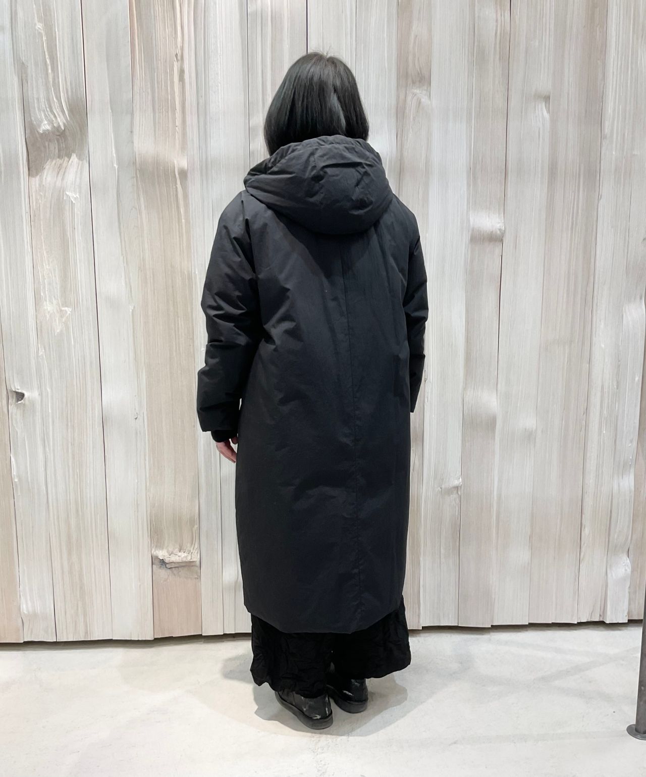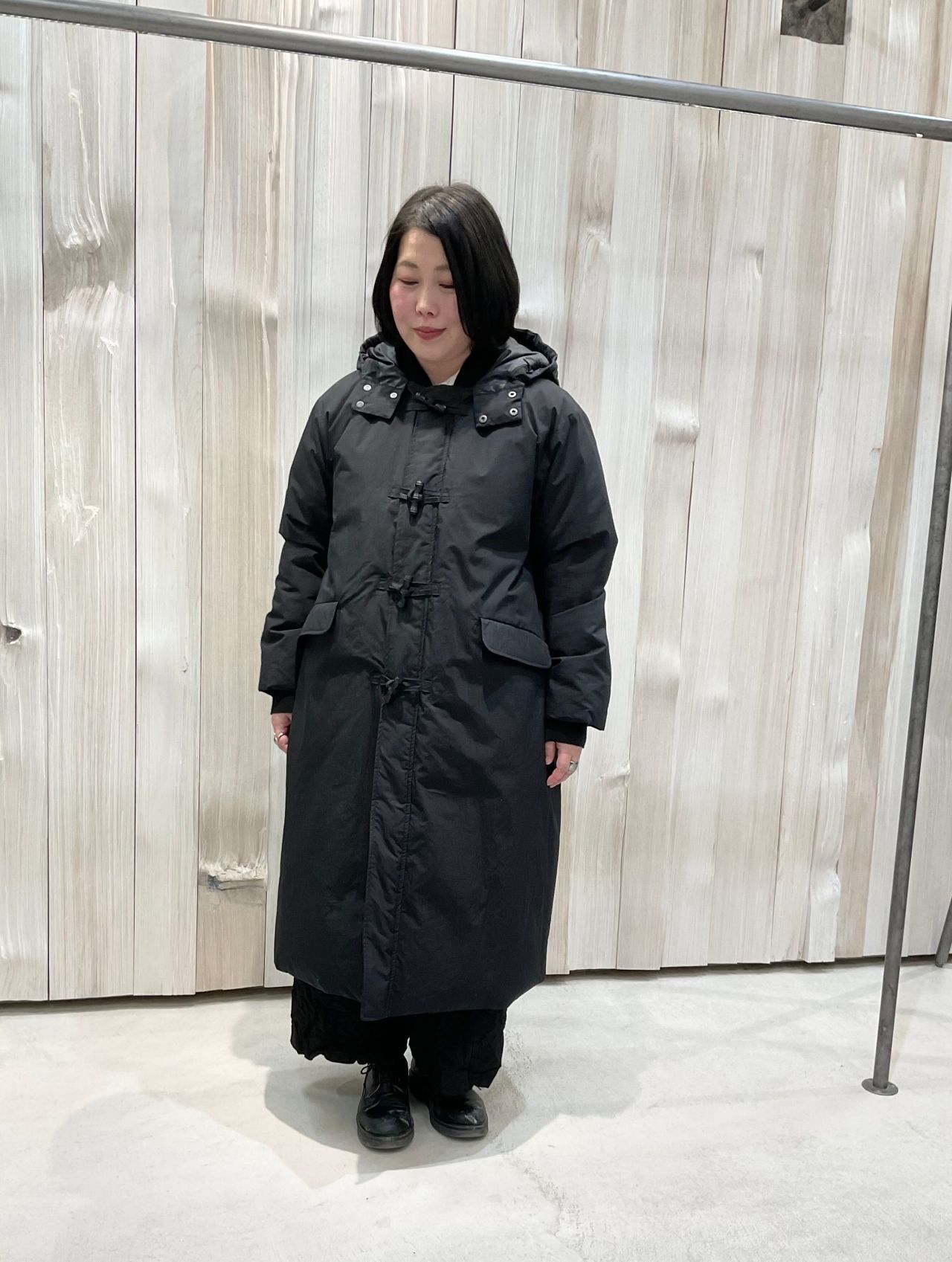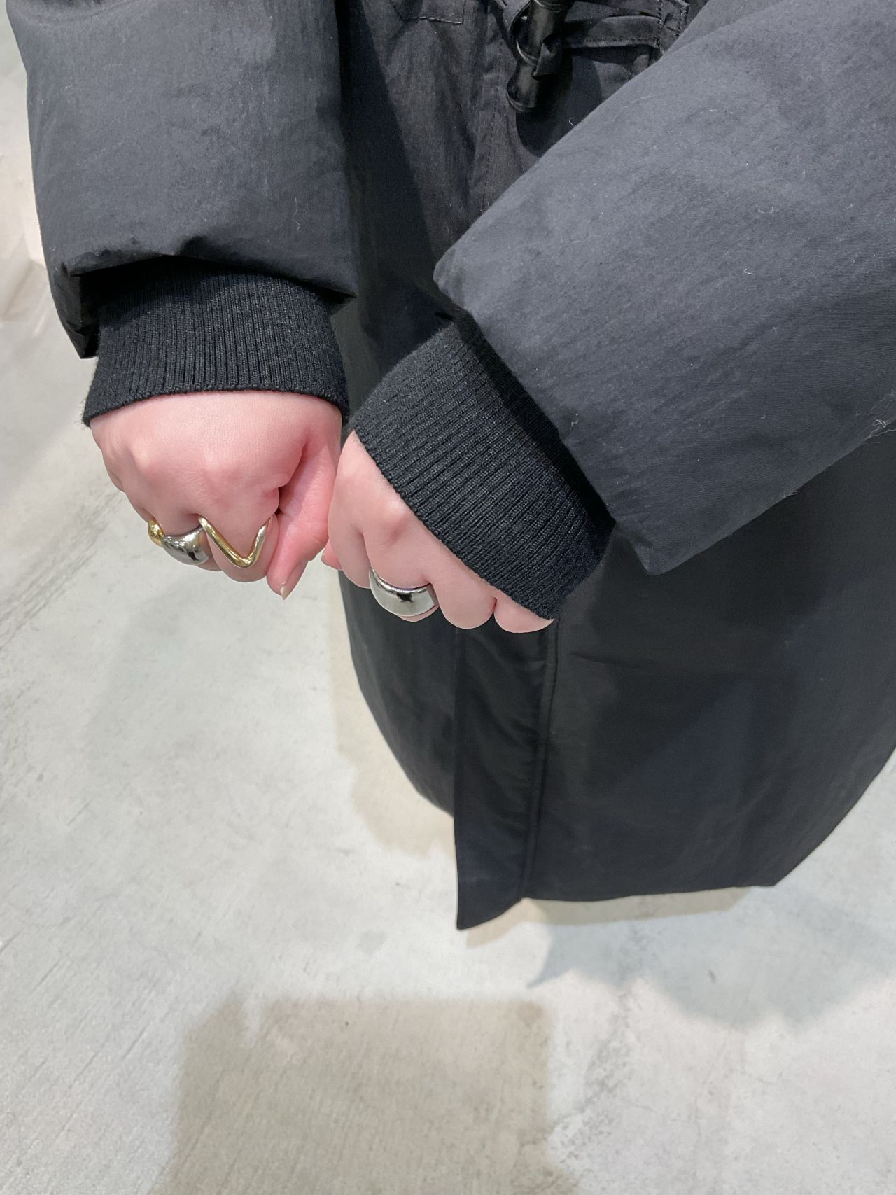 ダッフルコートは袖口とフードの内側にリブ付き。