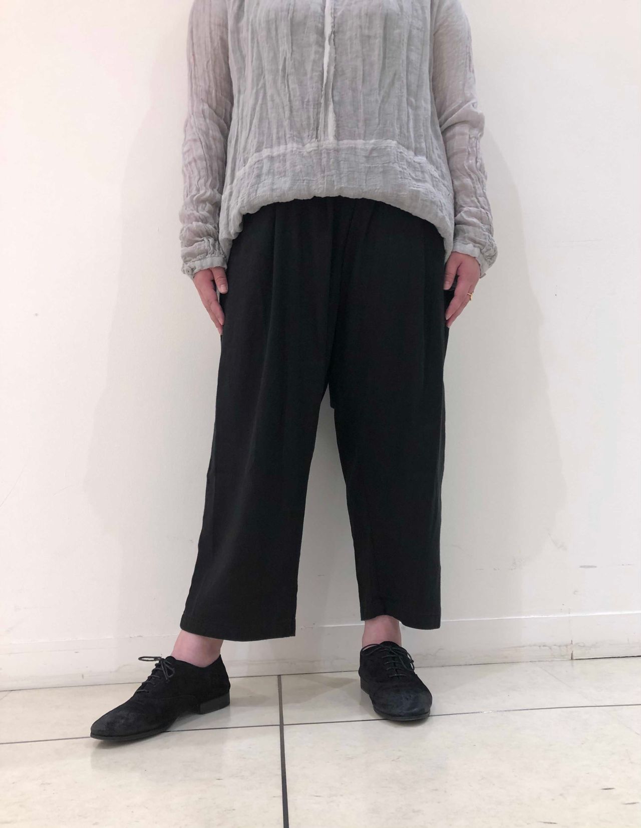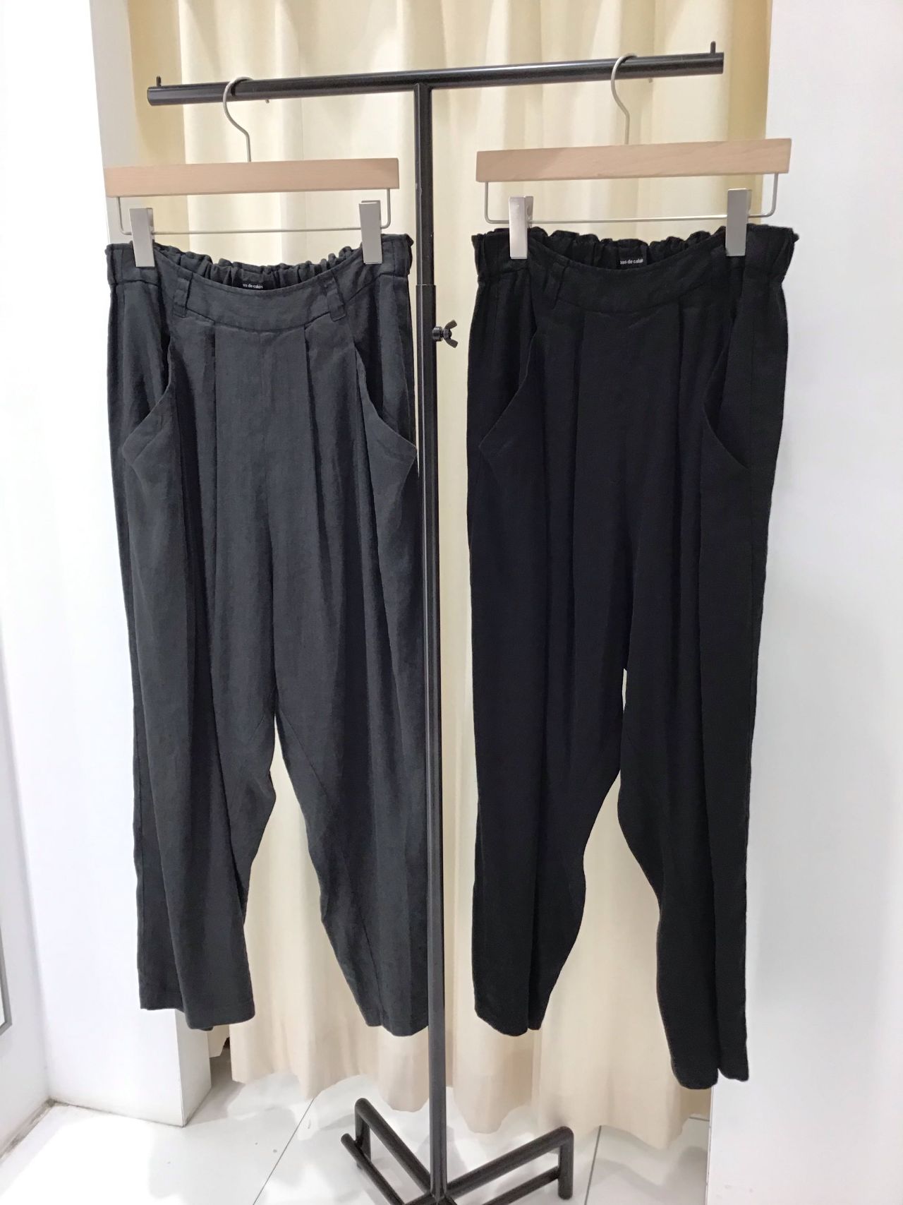 2タックが入ってゆったりした腰周りに、裾に向けて細くなったシルエットのサルエルパンツ。