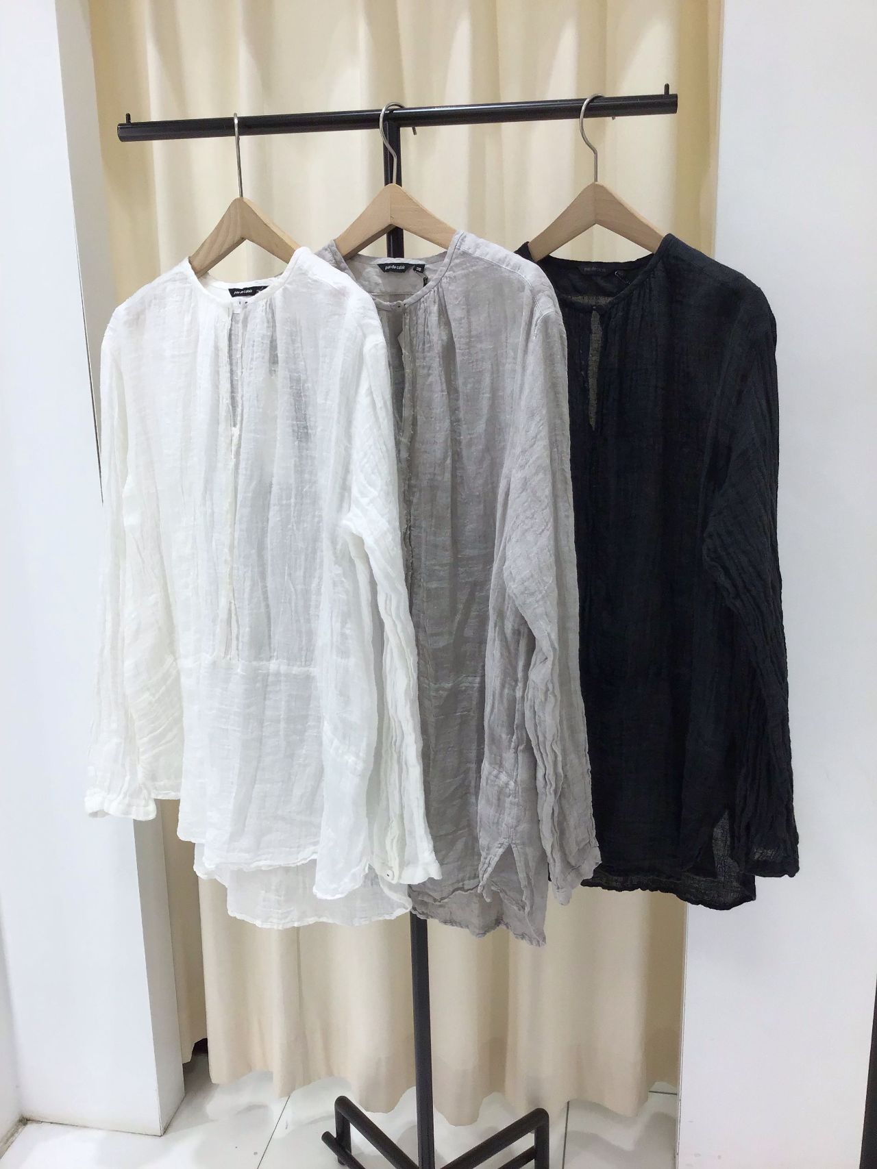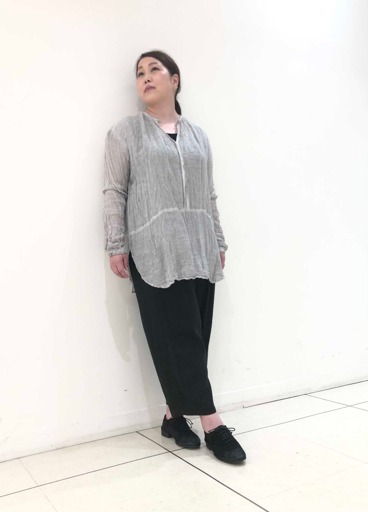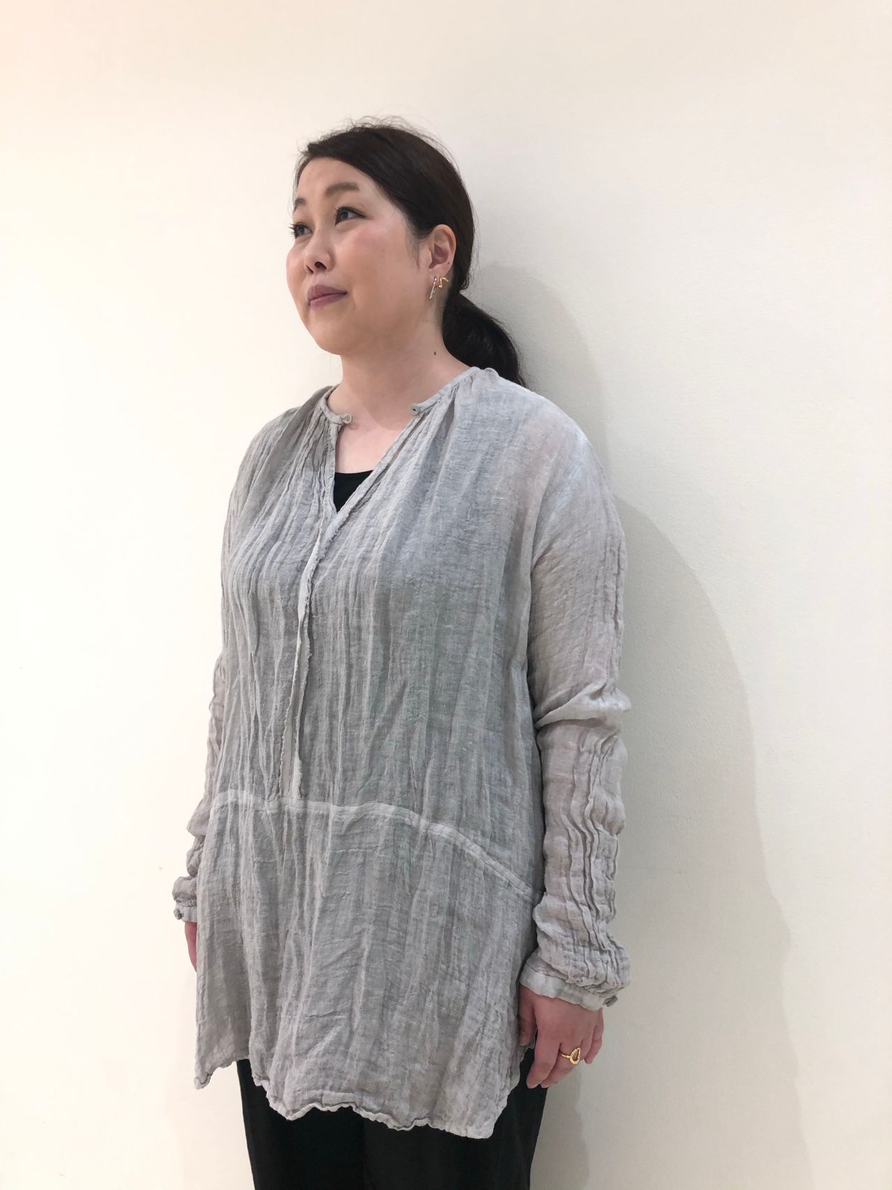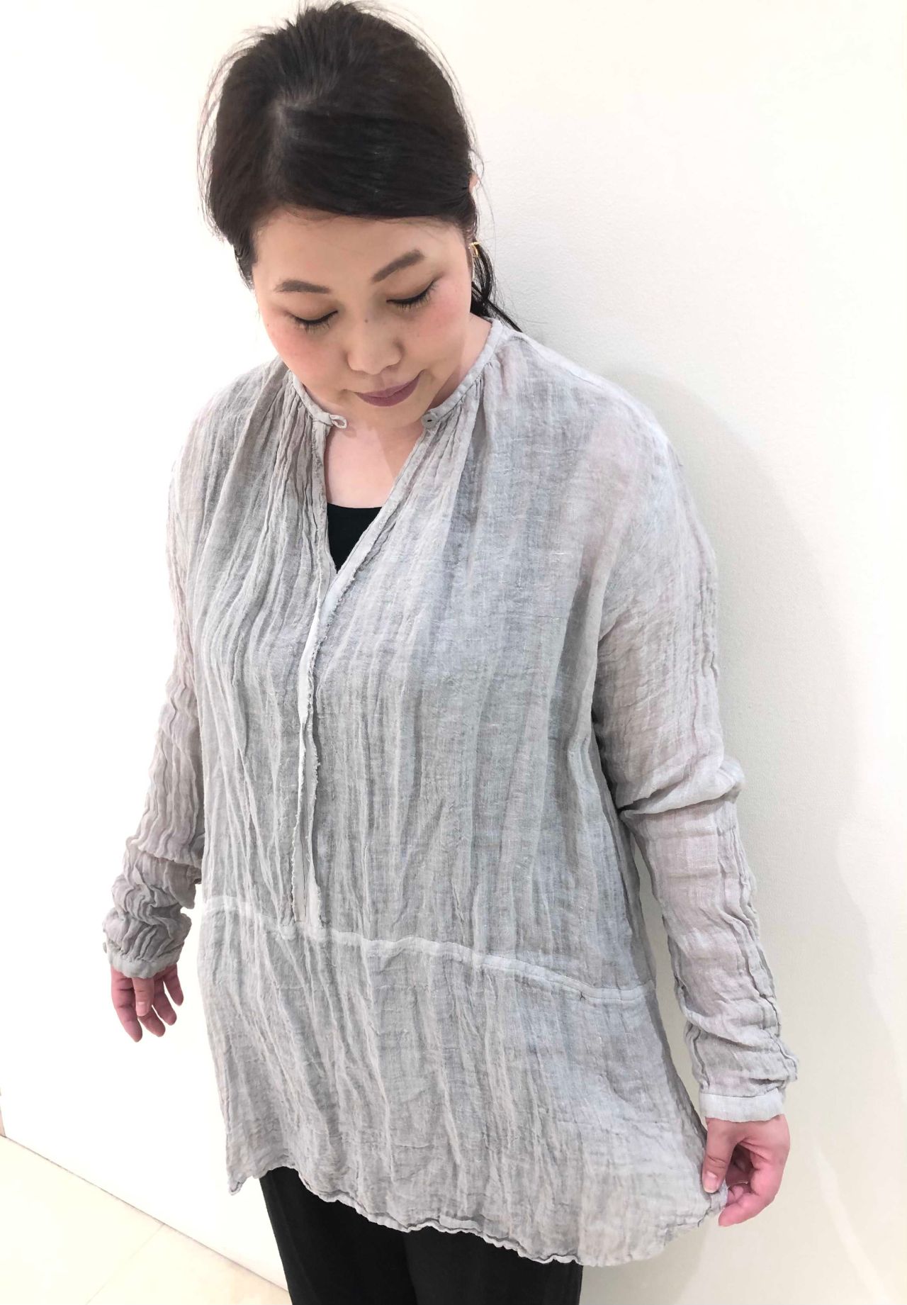 柔らかなリネンガーゼ素材で心地いいクルーネックのシャツブラウスです。