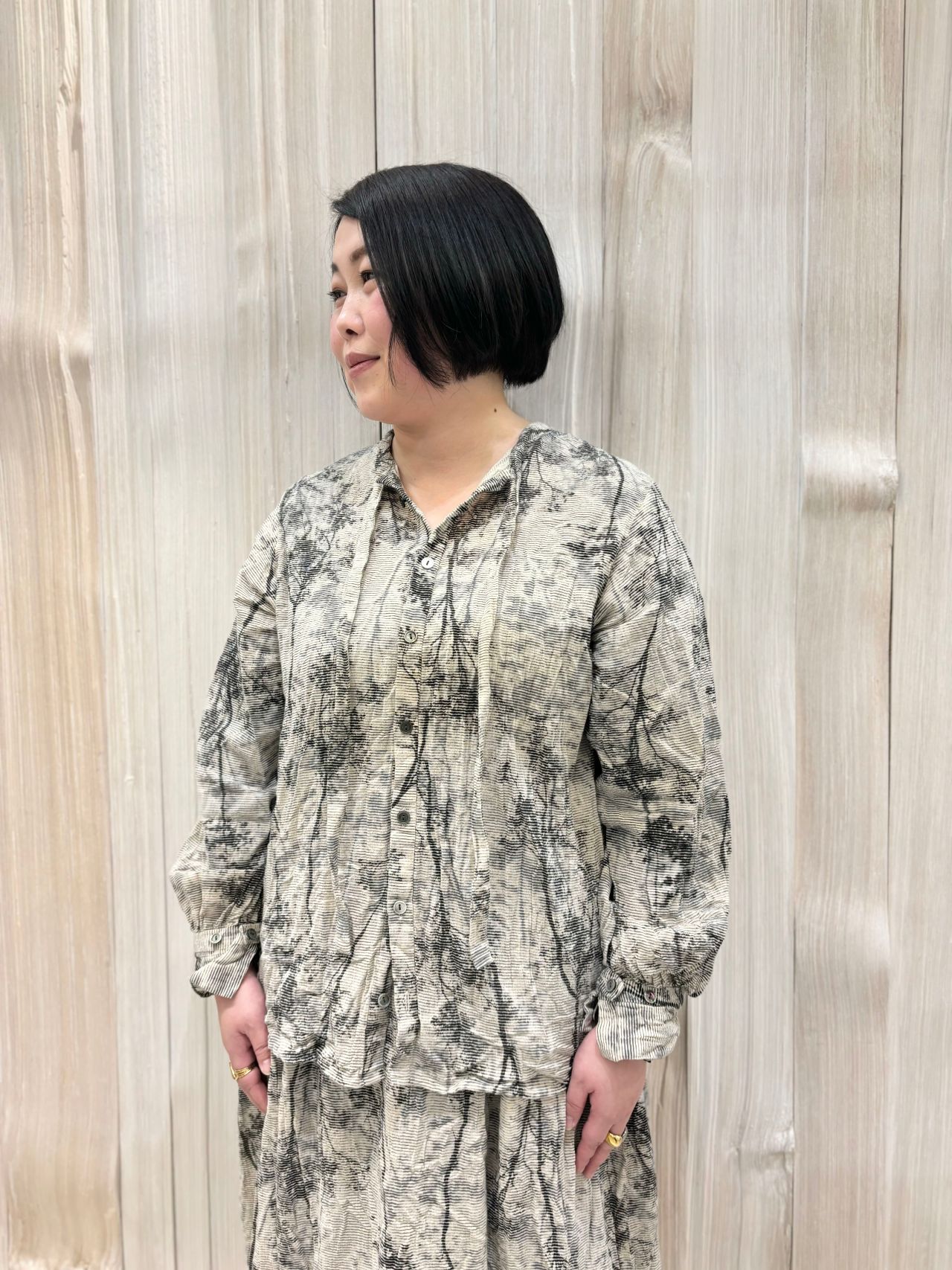 スタンド襟、反対側に着用するとボウタイタイプのブラウスで1枚で違うタイプに着て頂けます。