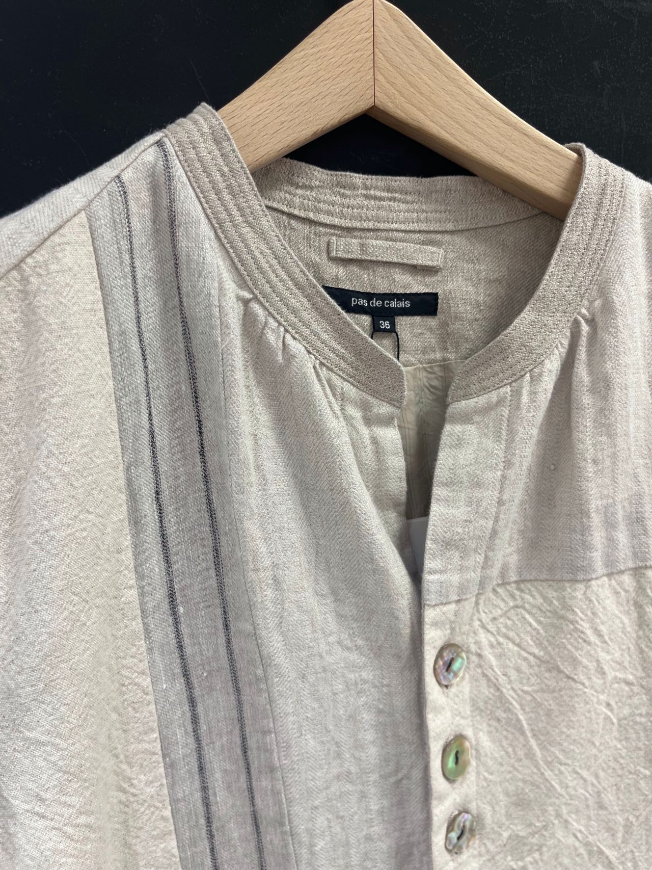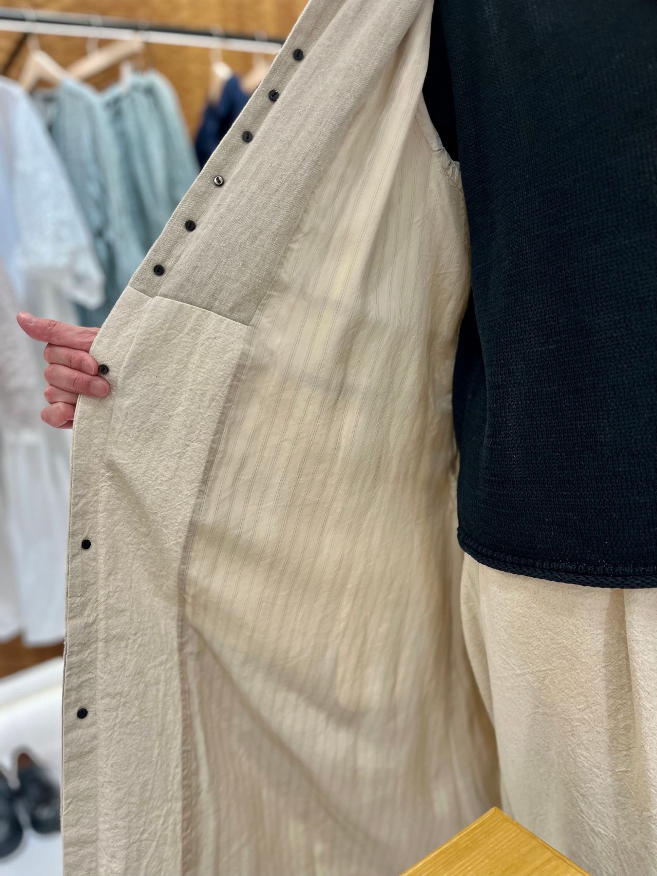 ナチュラルな貝ボタンがポイントで、こちらもコートと同じく袖、見頃にストライプ柄のキュプラ裏地付きです。