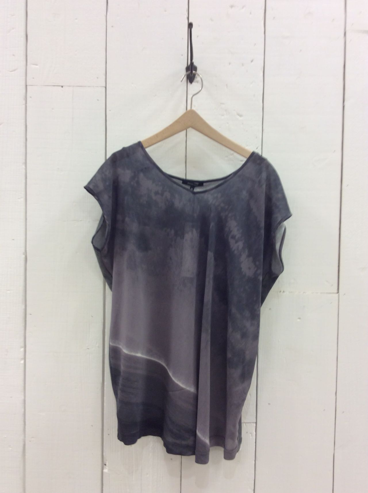 水平線を表現したプリントは独特の色彩で雰囲気のある生地に前身頃がシフォンでさらっとし、後ろ身頃はカットソー生地でとても着やすくなっております。