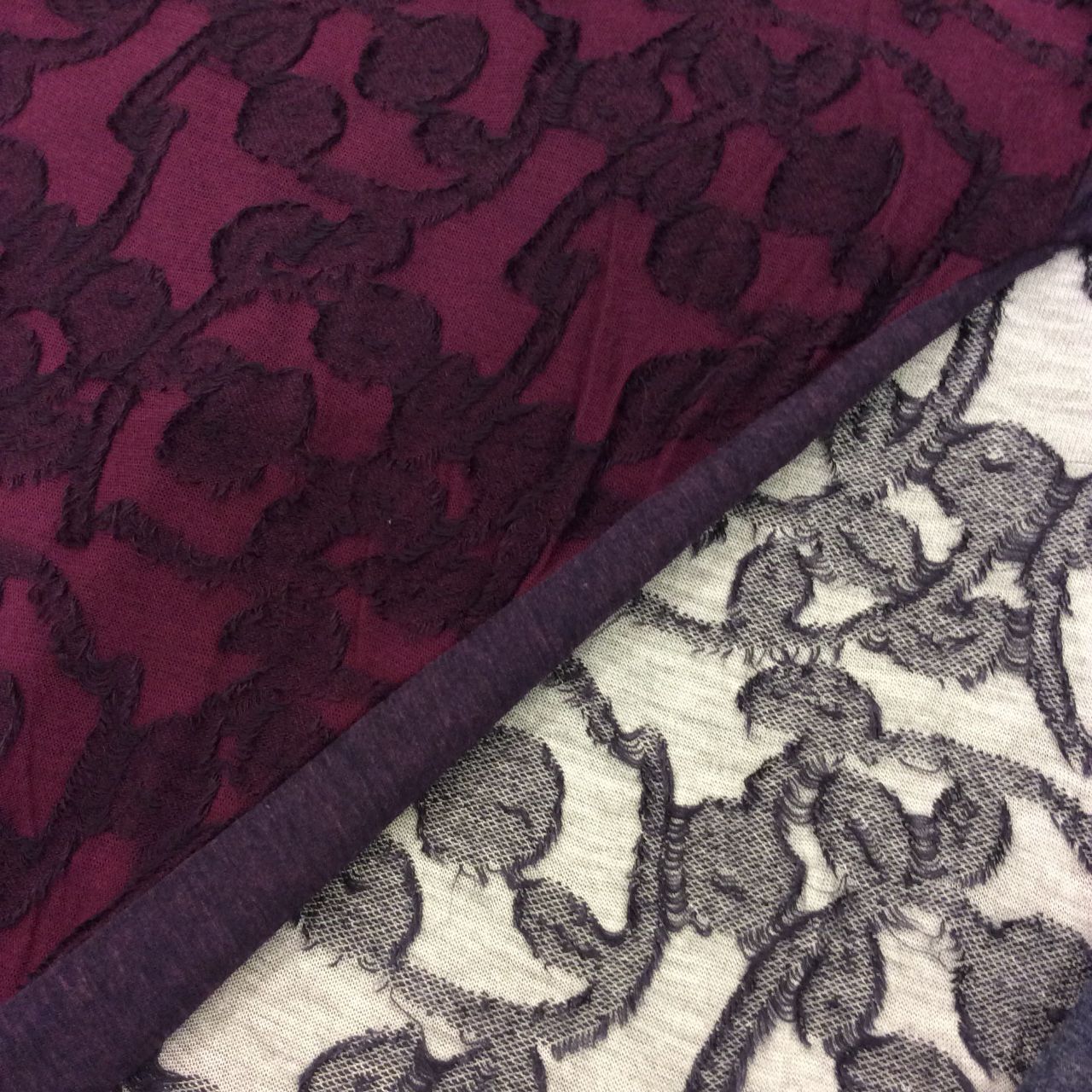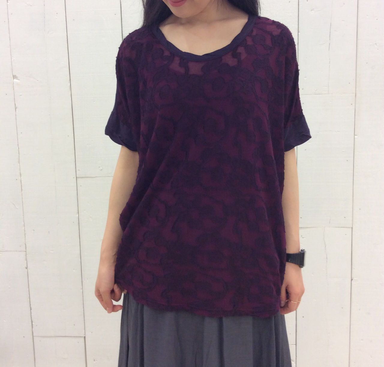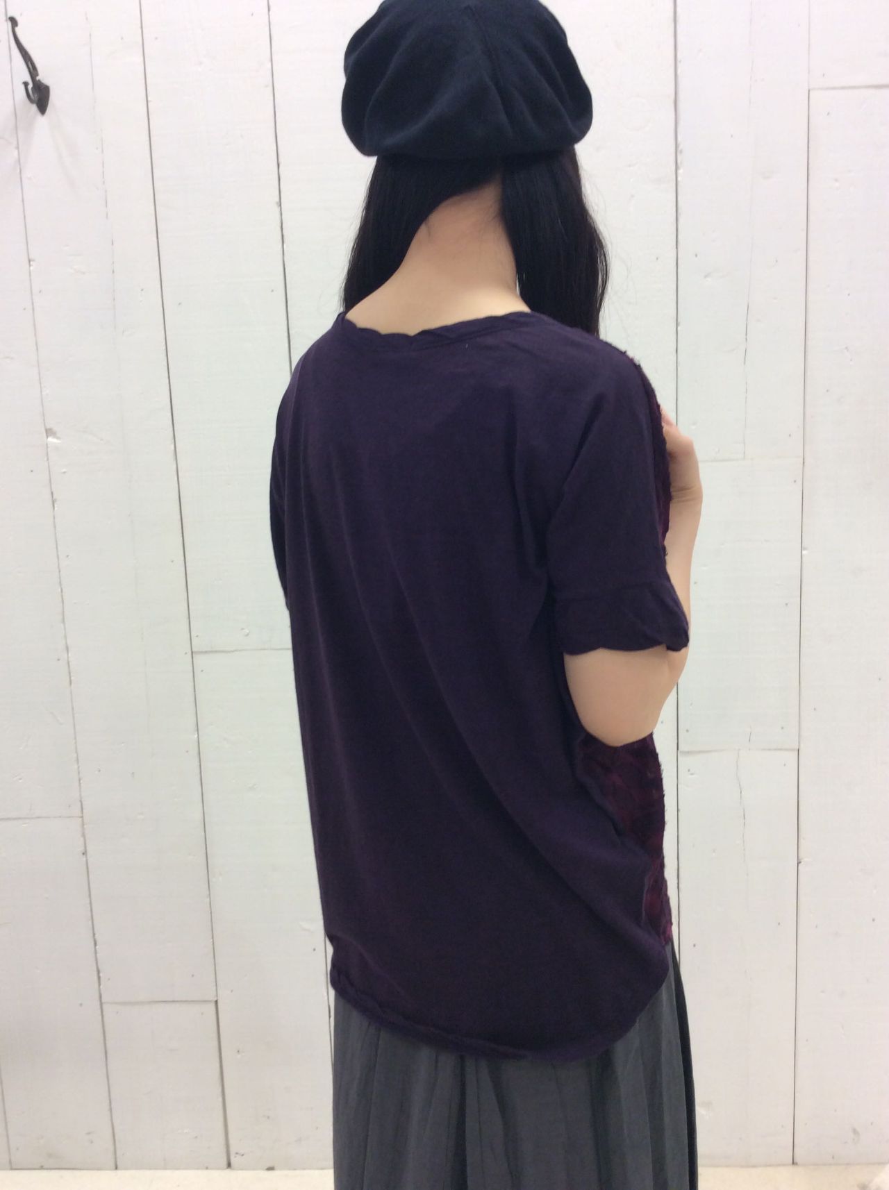 ビスコースレーヨン素材のカットジャガードと、TOP天竺の組み合わせを製品染めして、異素材の色差を楽しめるプルオーバー。