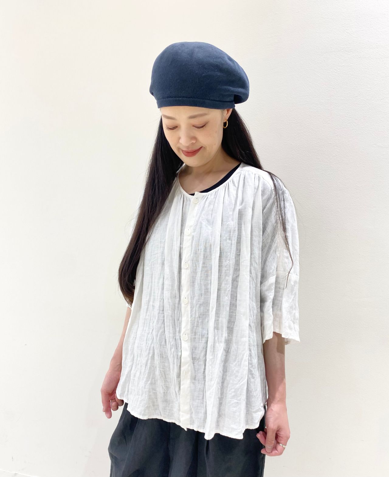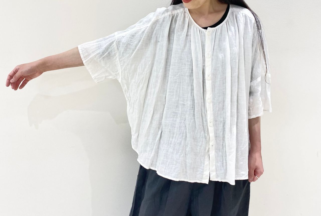 襟周りとヨーク下にギャザーを入れた柔らかな印象の、フルオープンデザインになります。