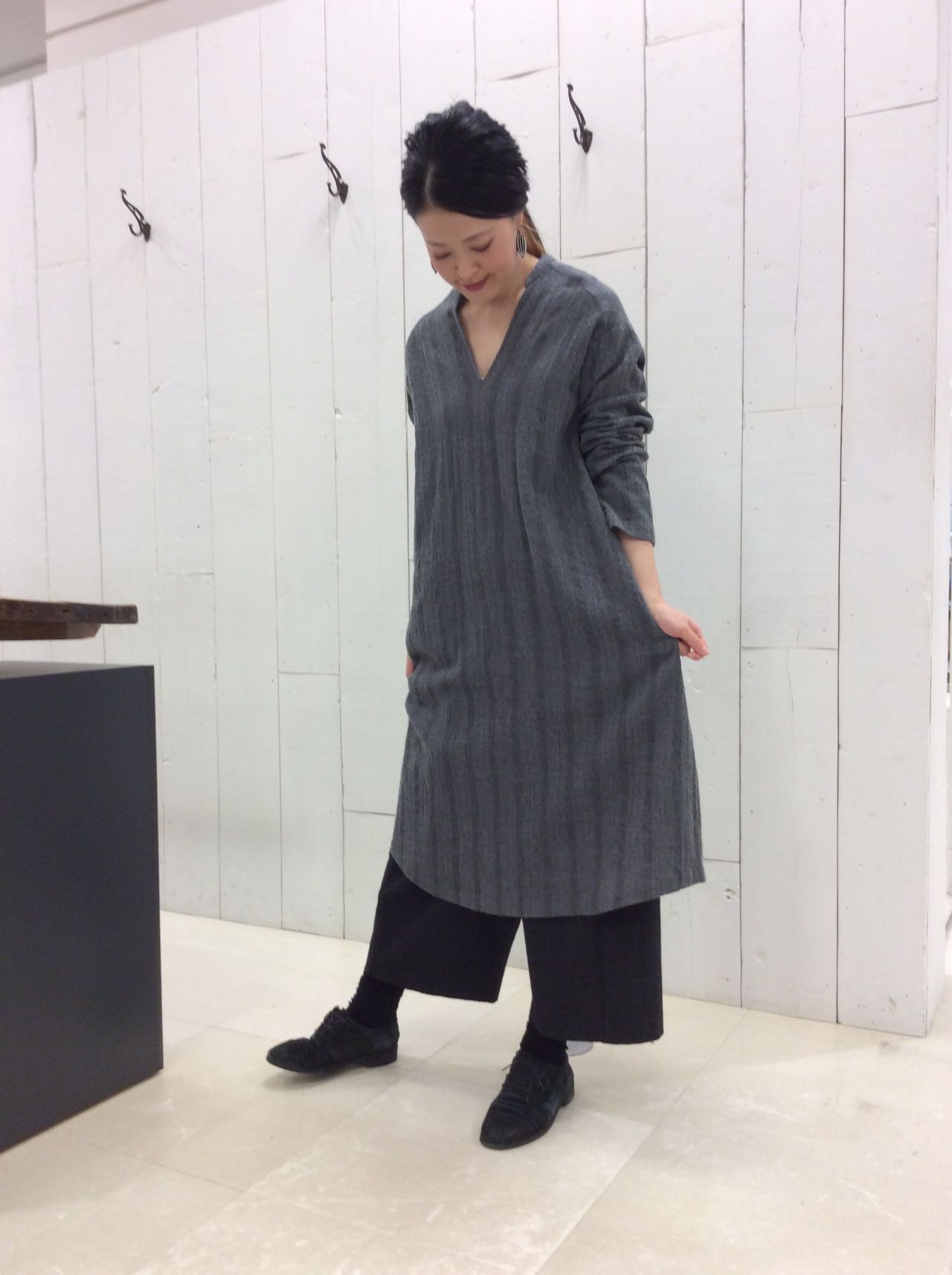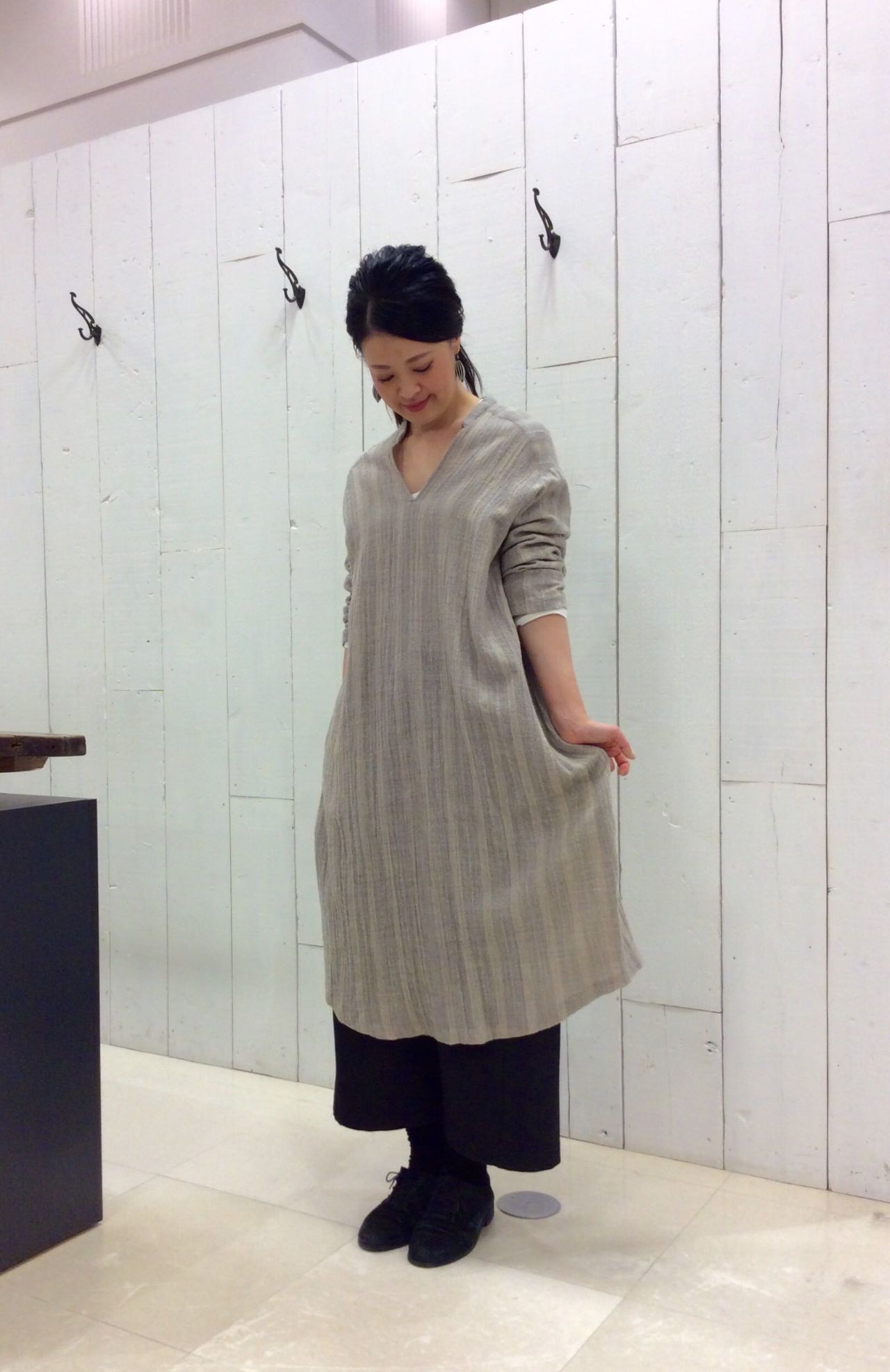 裏地がないカジュアルワンピースなので、下にパンツを合わせたチュニックスタイルや、ペチコートを履いていただければワンピースとしても。
