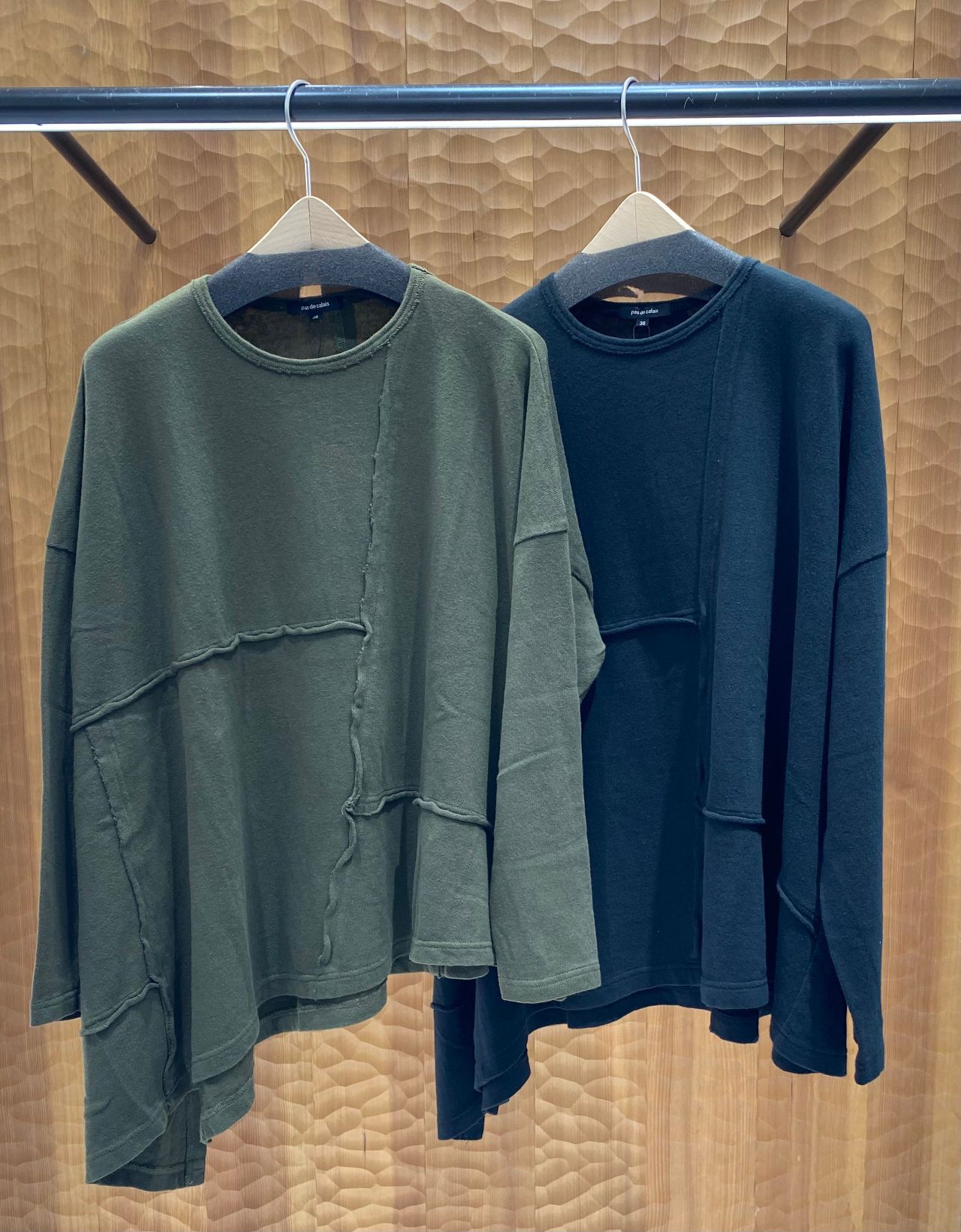 アシンメトリーな接ぎラインやポケット付きのデザインが特性。