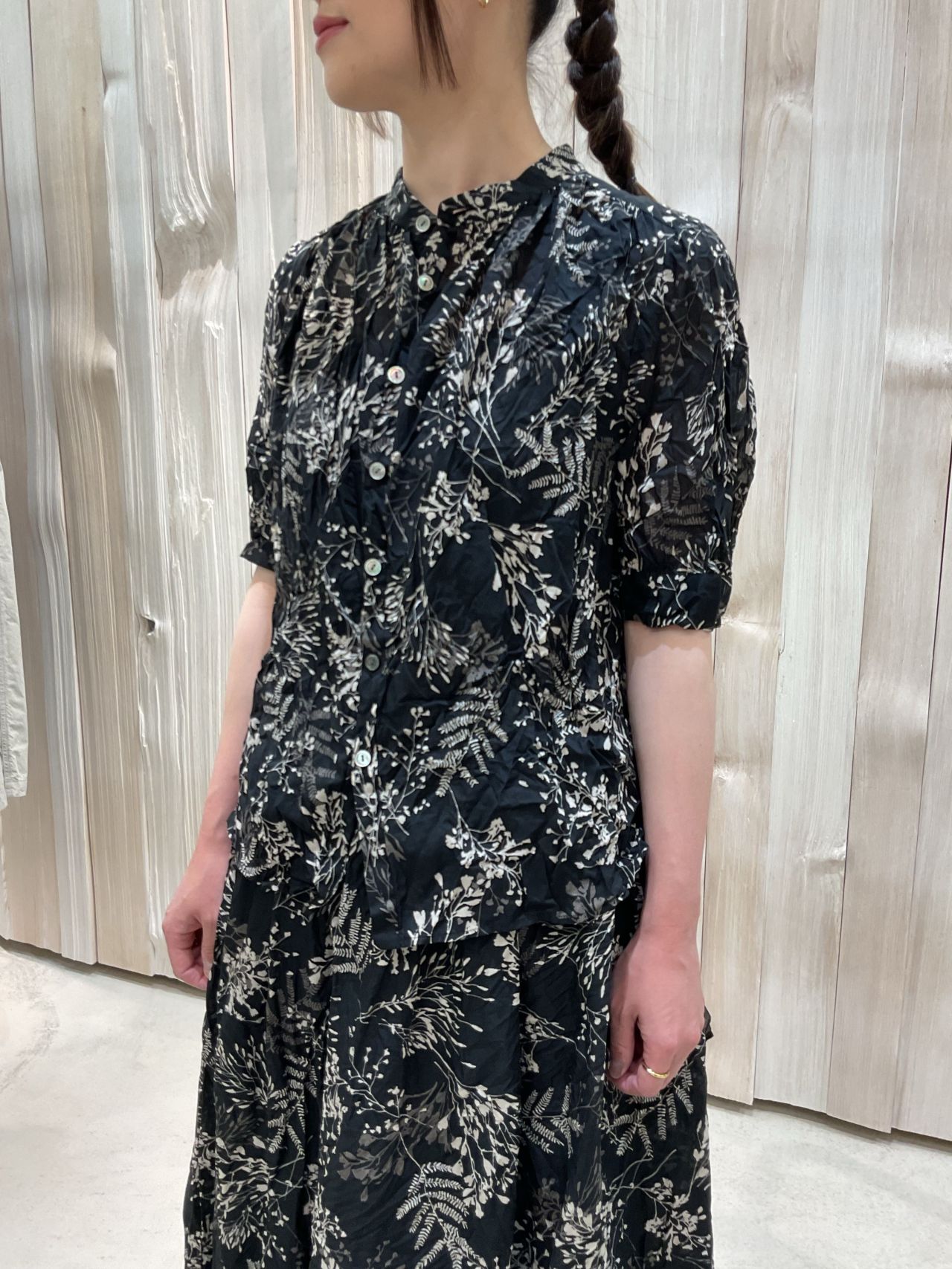 夏から秋にかけて咲く"露草"をプリントした、コンパクトなサイズ感のスタンドカラーブラウスと