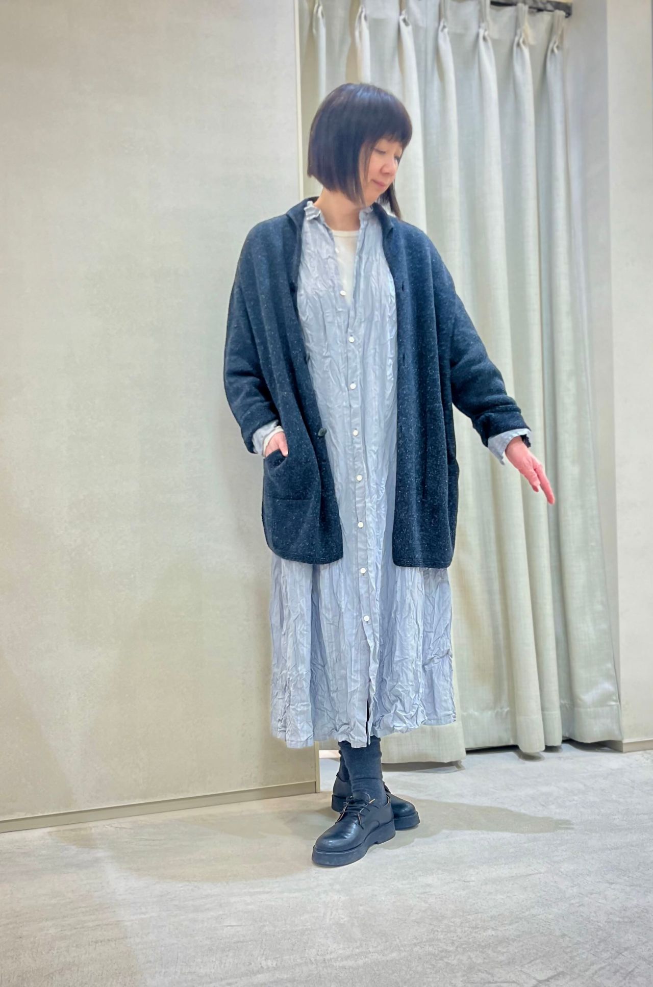 ロングカーディガンのように羽織りでも着ていただけます。