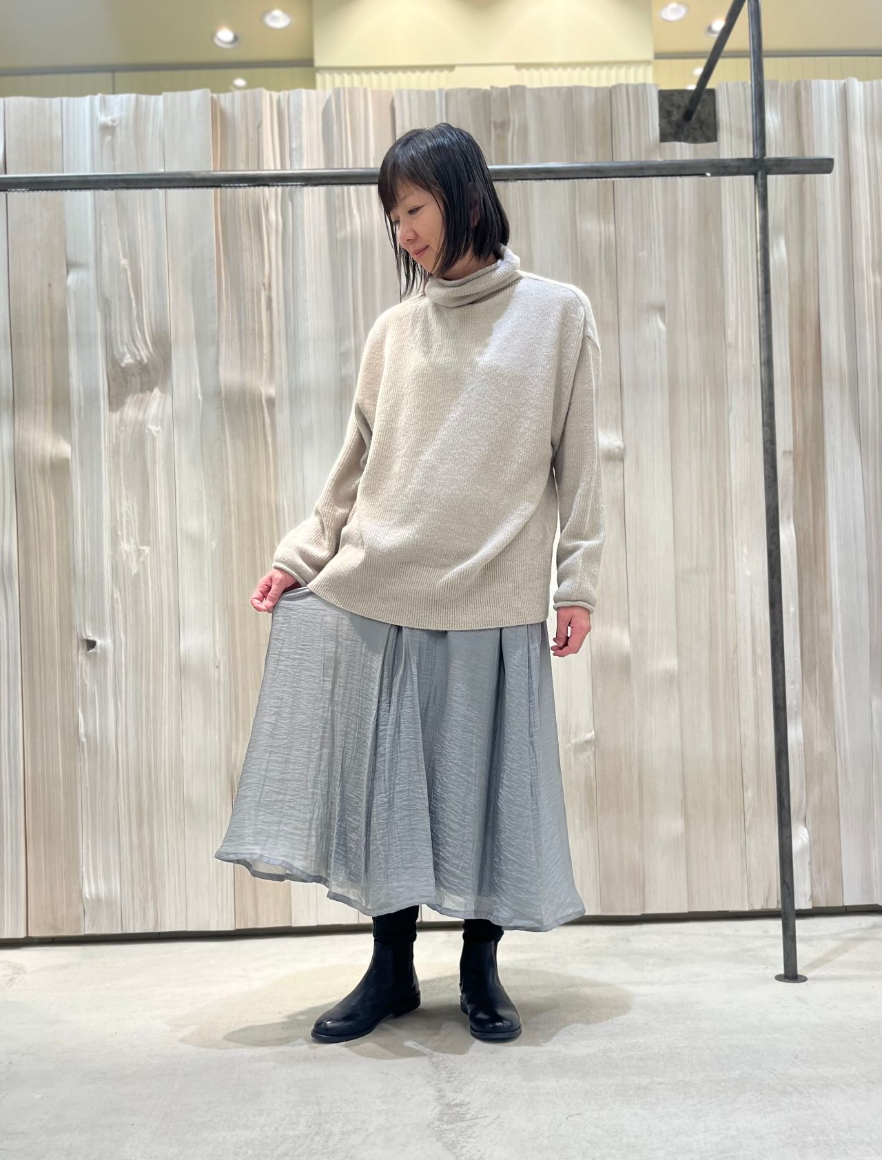 グレージュのセットアップは柔らかい優しい雰囲気ですが、ボトムのカラーで印象が変わり着回しがしやすいです。