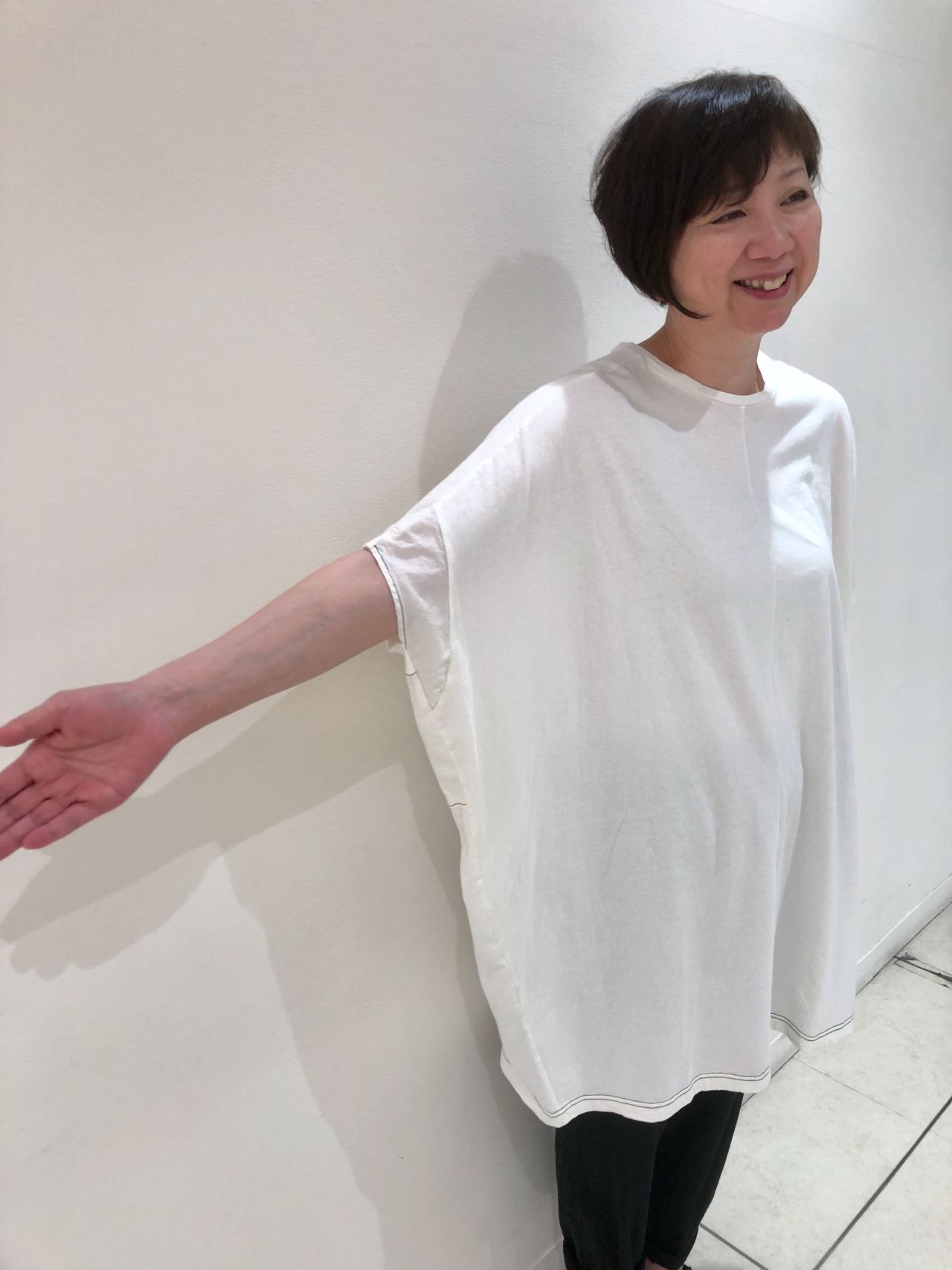 ワイドチュニックシルエットになっていて、二の腕が隠れる袖丈です。