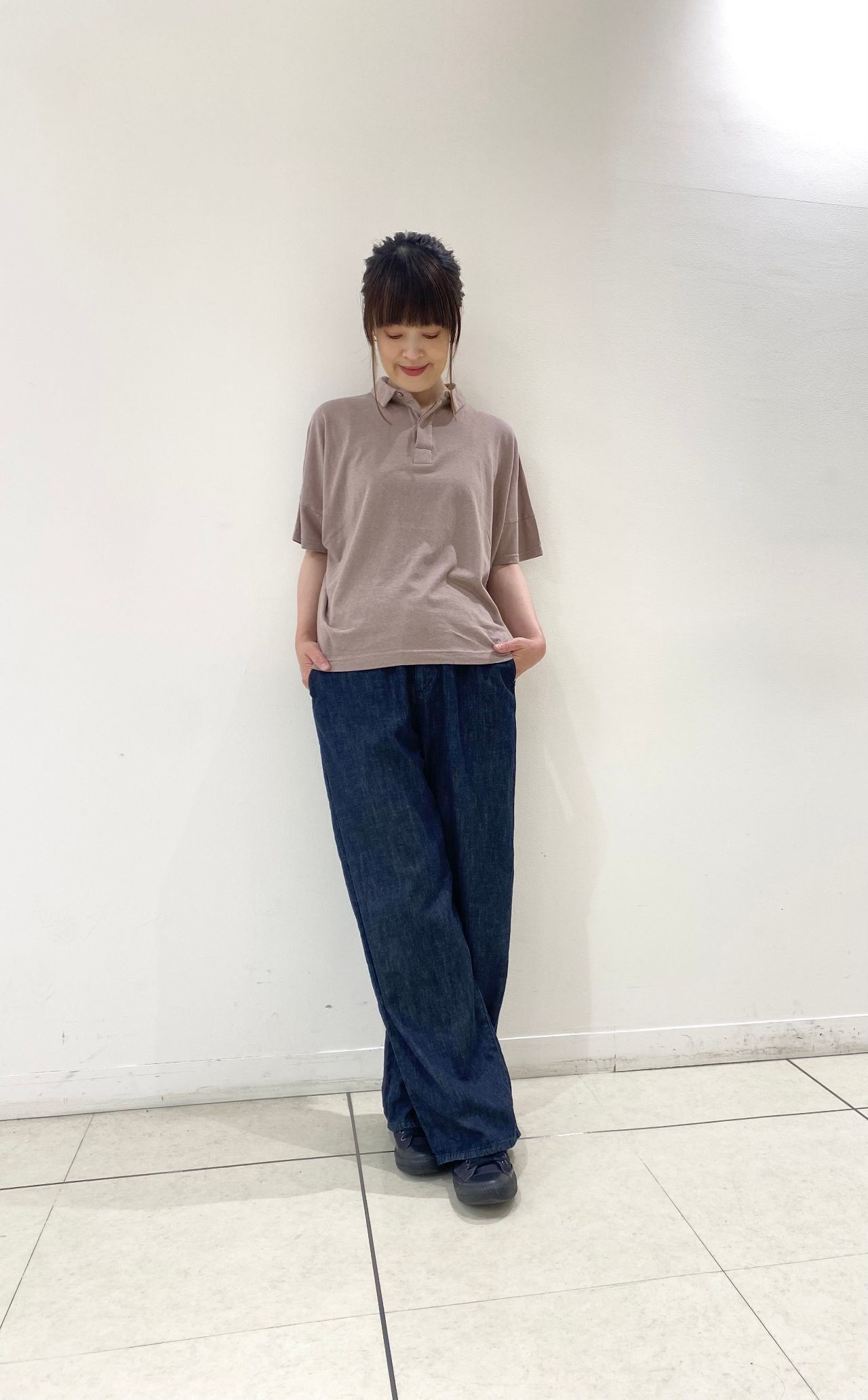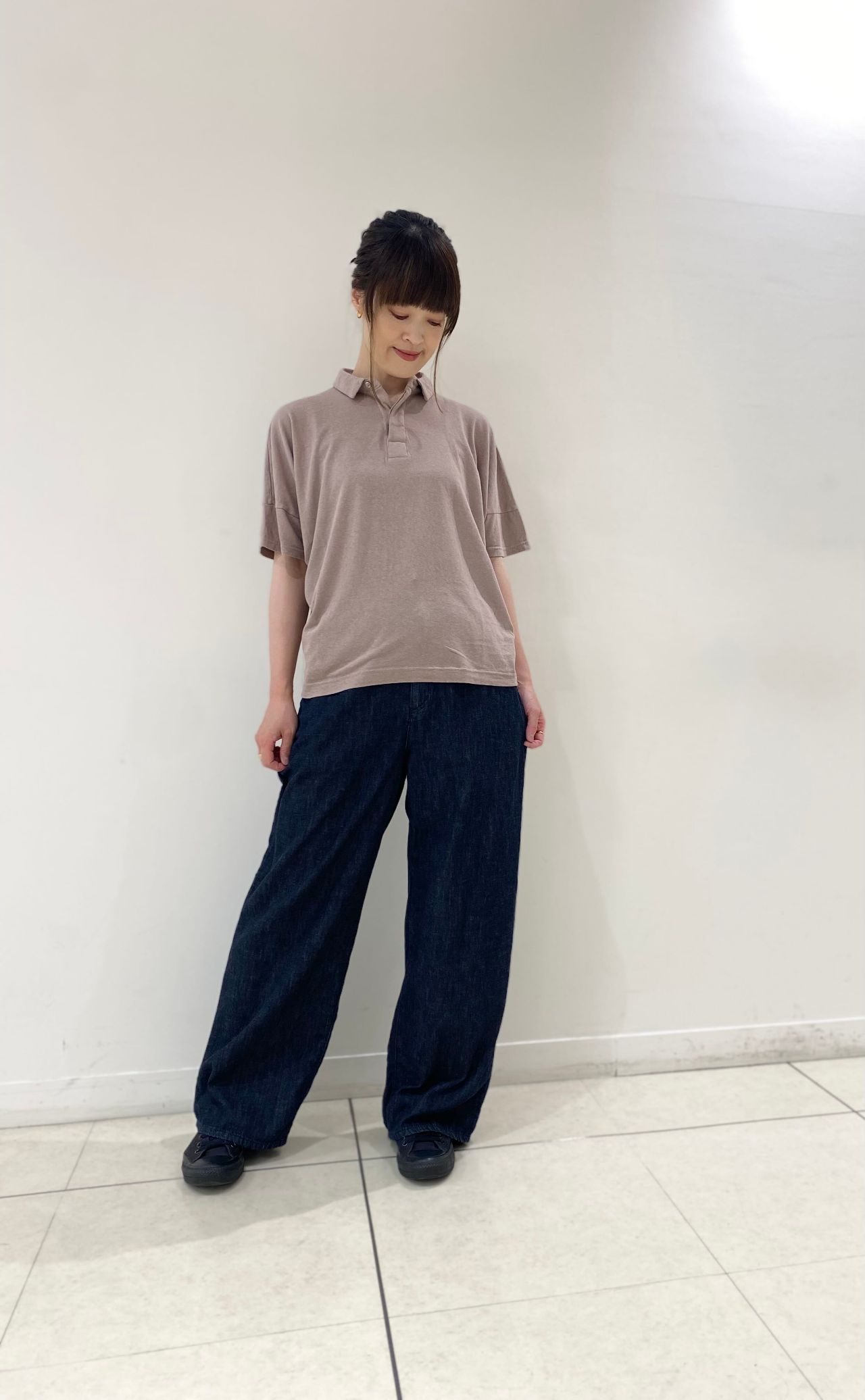 股下は程よくスッキリめのワイドパンツ。レッグラインは程よくリラックス感があり、リラクシーは履き心地。