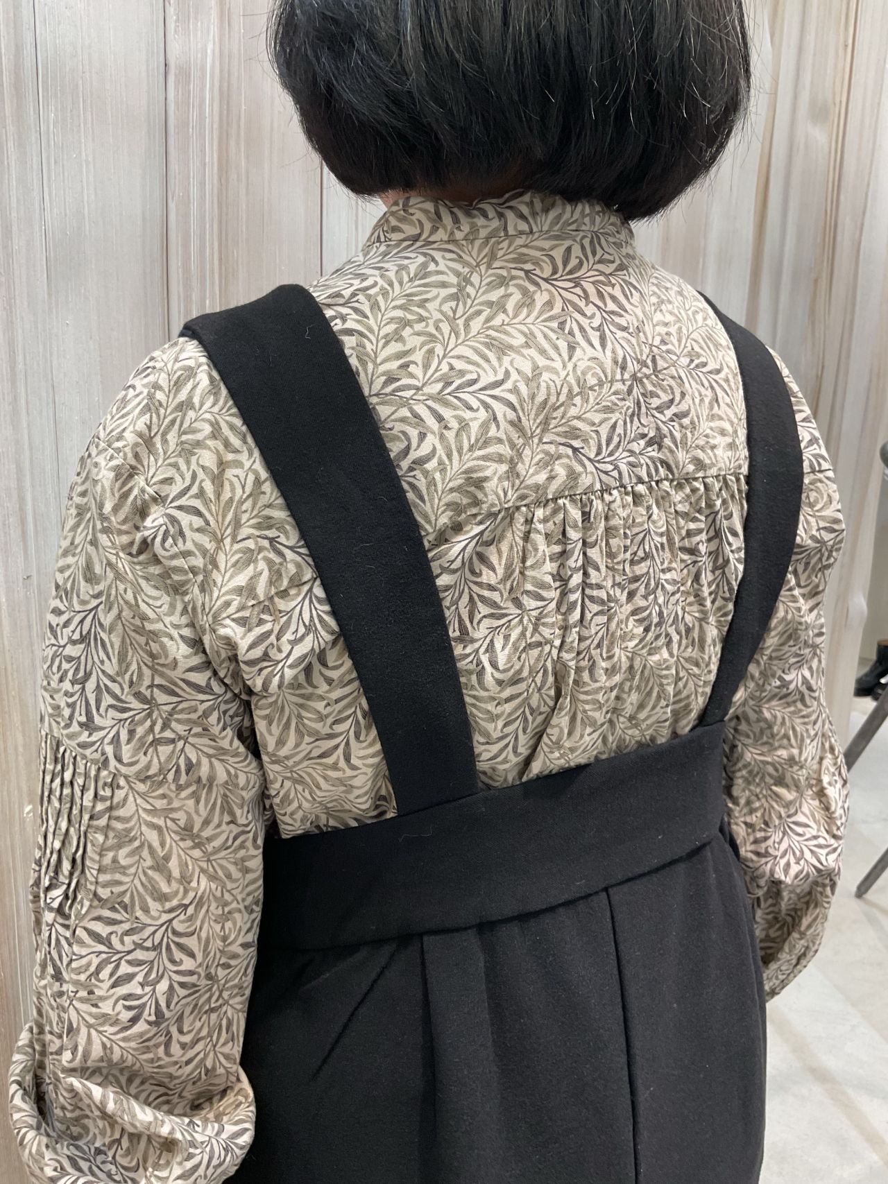 後ろはタックの入ったサロペット型ワンピースになっており前後着用可能のデザイン。
