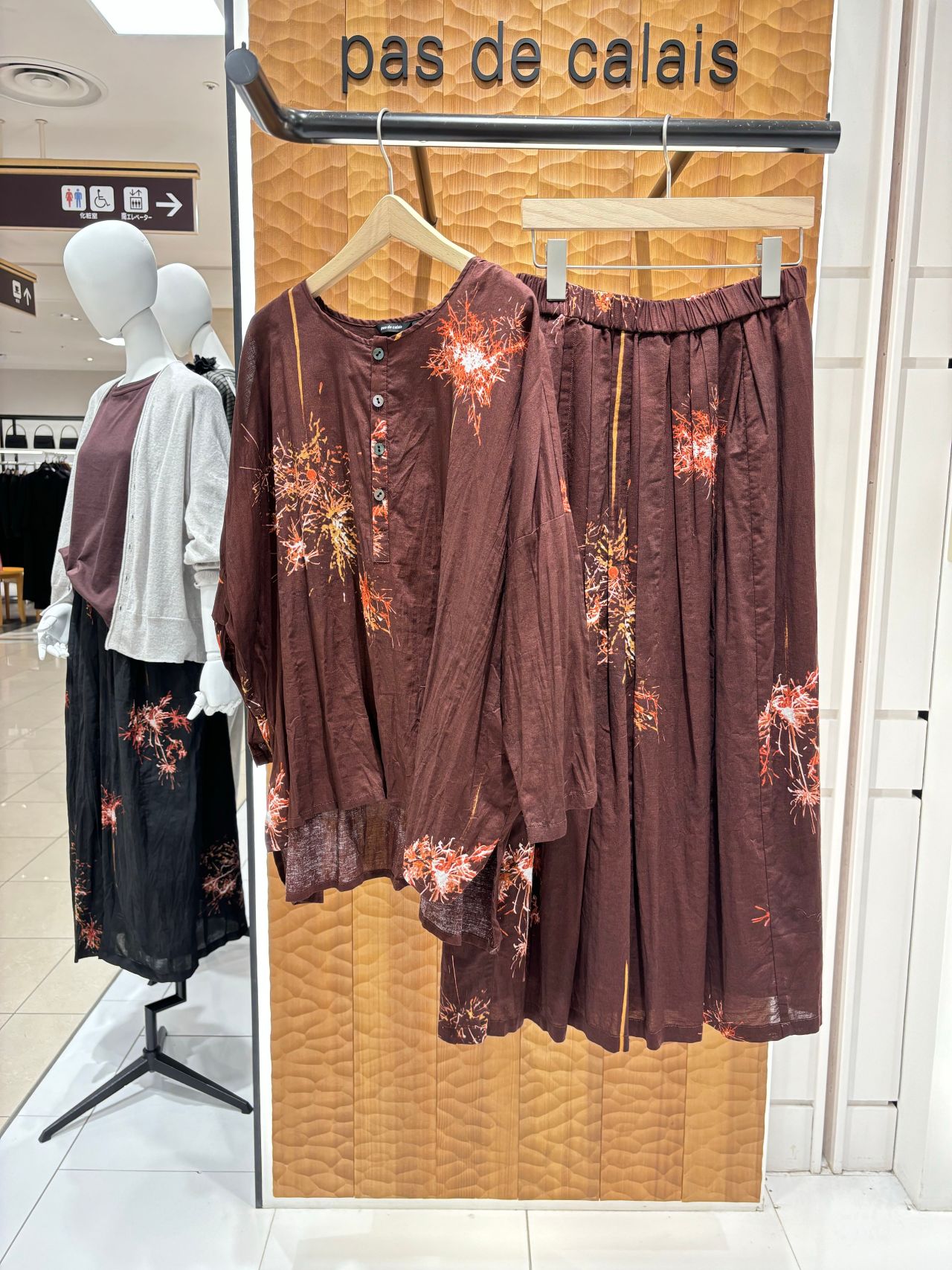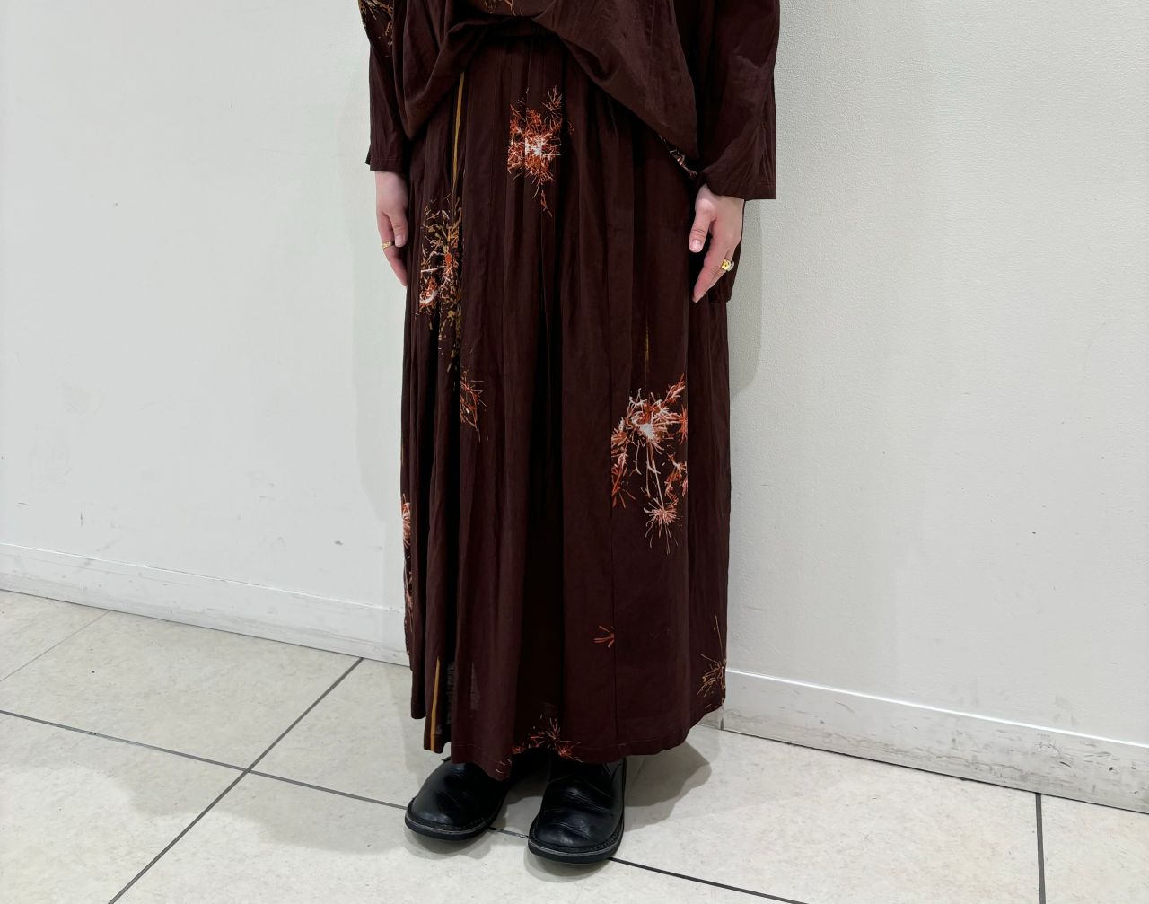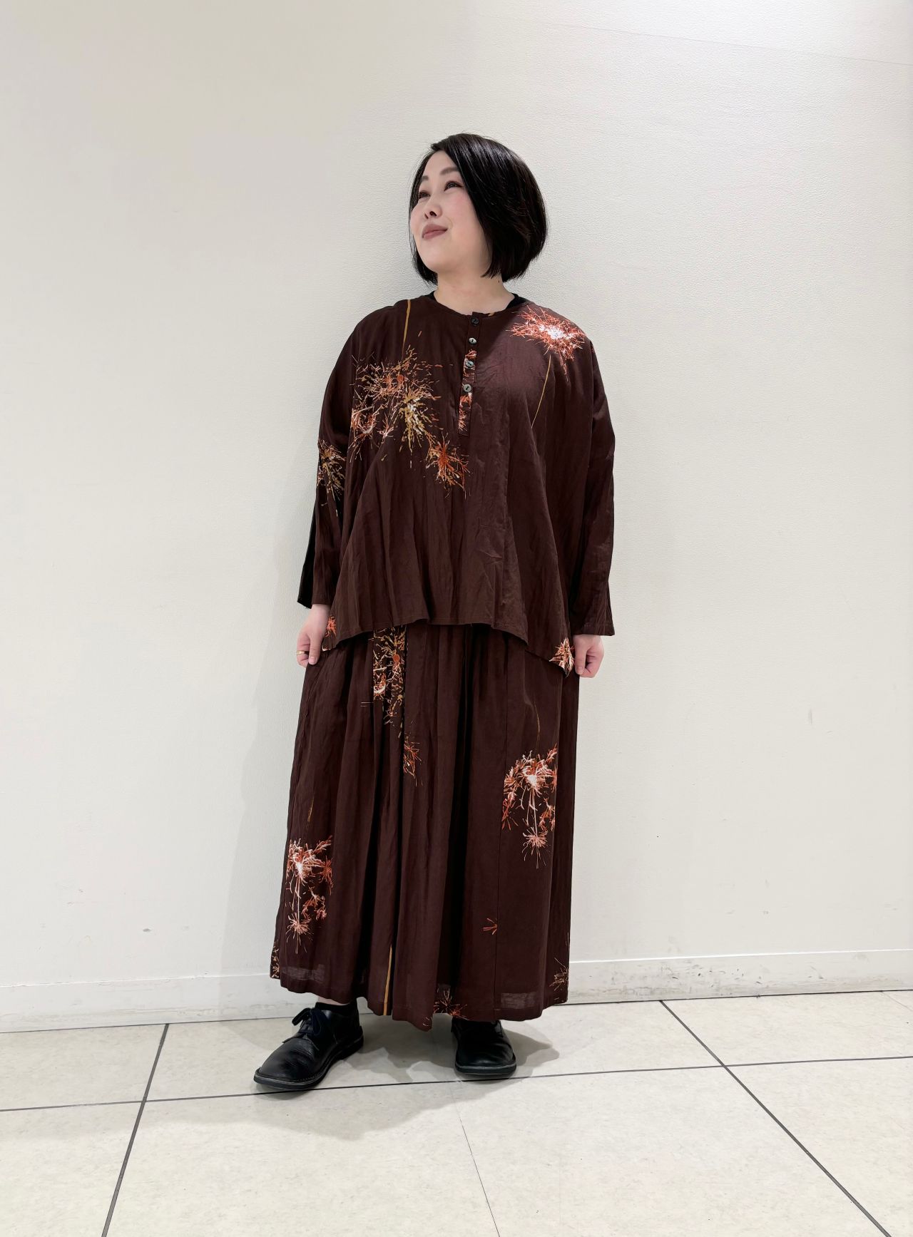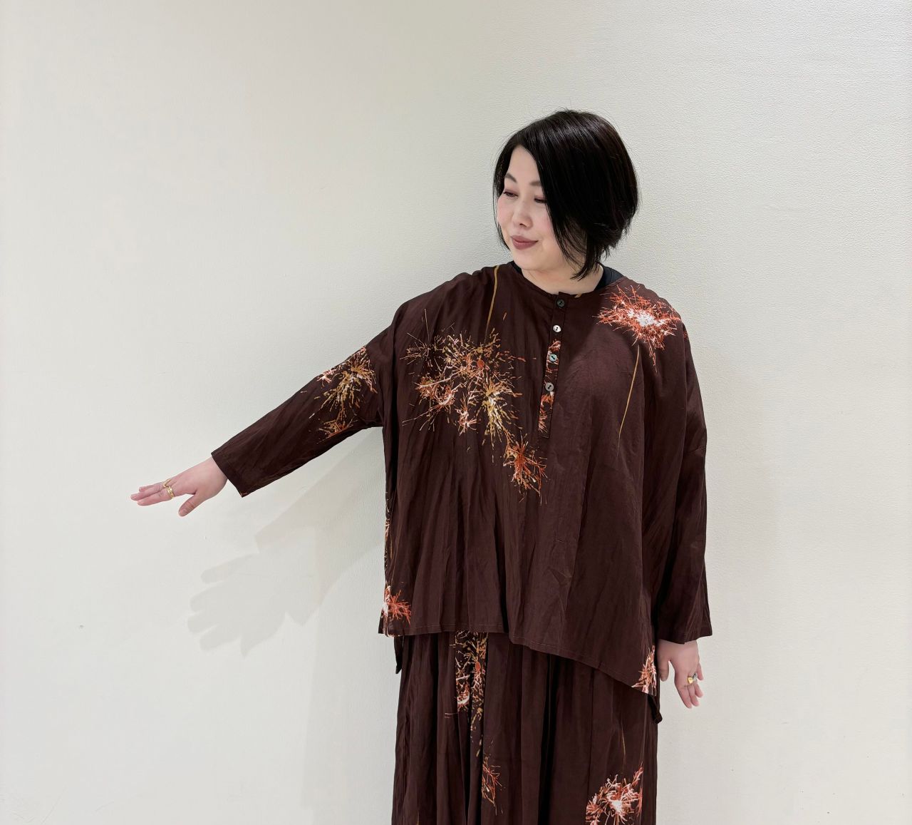 ナチュラル感のある綿麻ボイルにプリントを施しました。今回のテーマである夏の終わりの風物詩である線香 花火からのインスピレーション。茜をイメージした赤い色が印象的。
