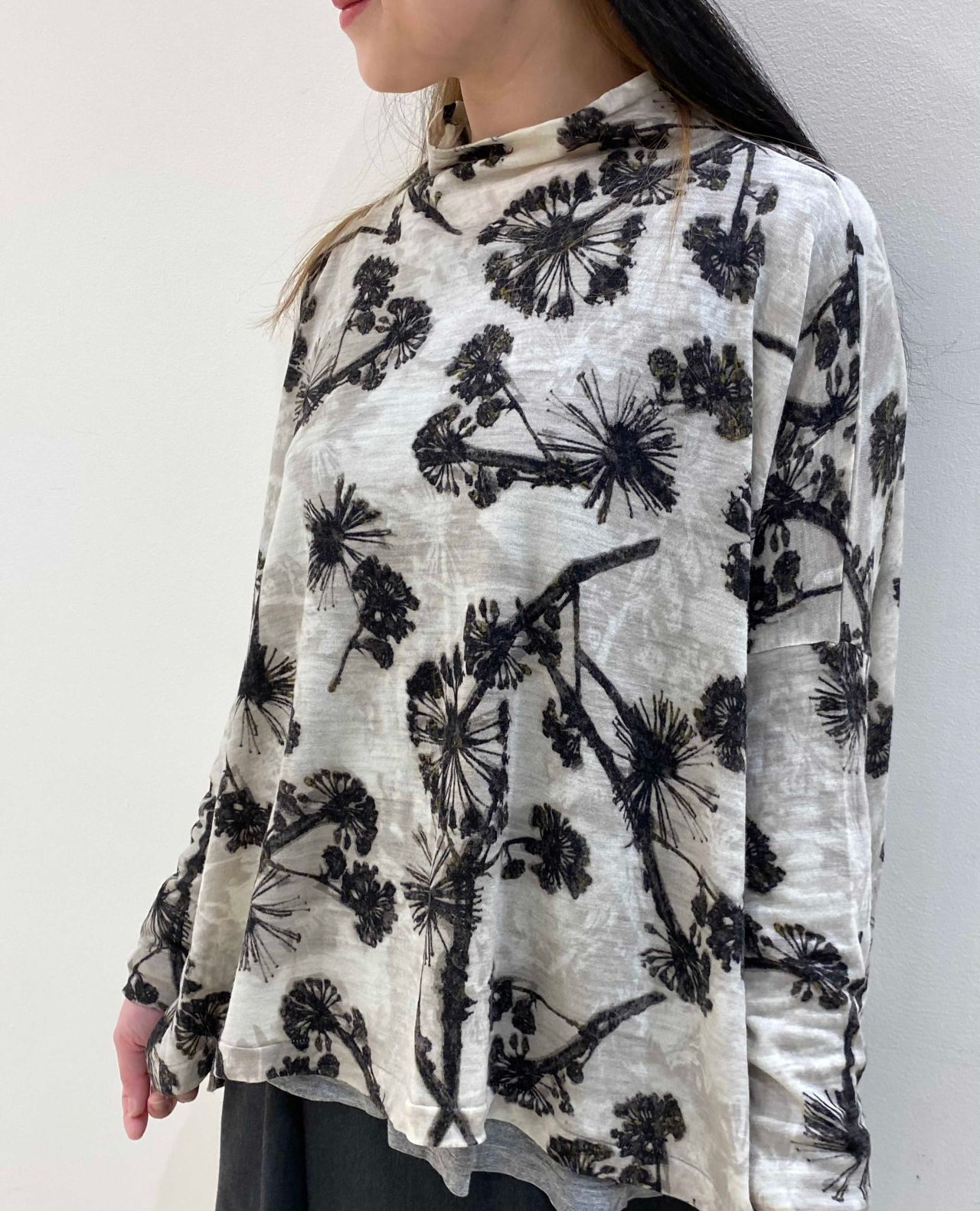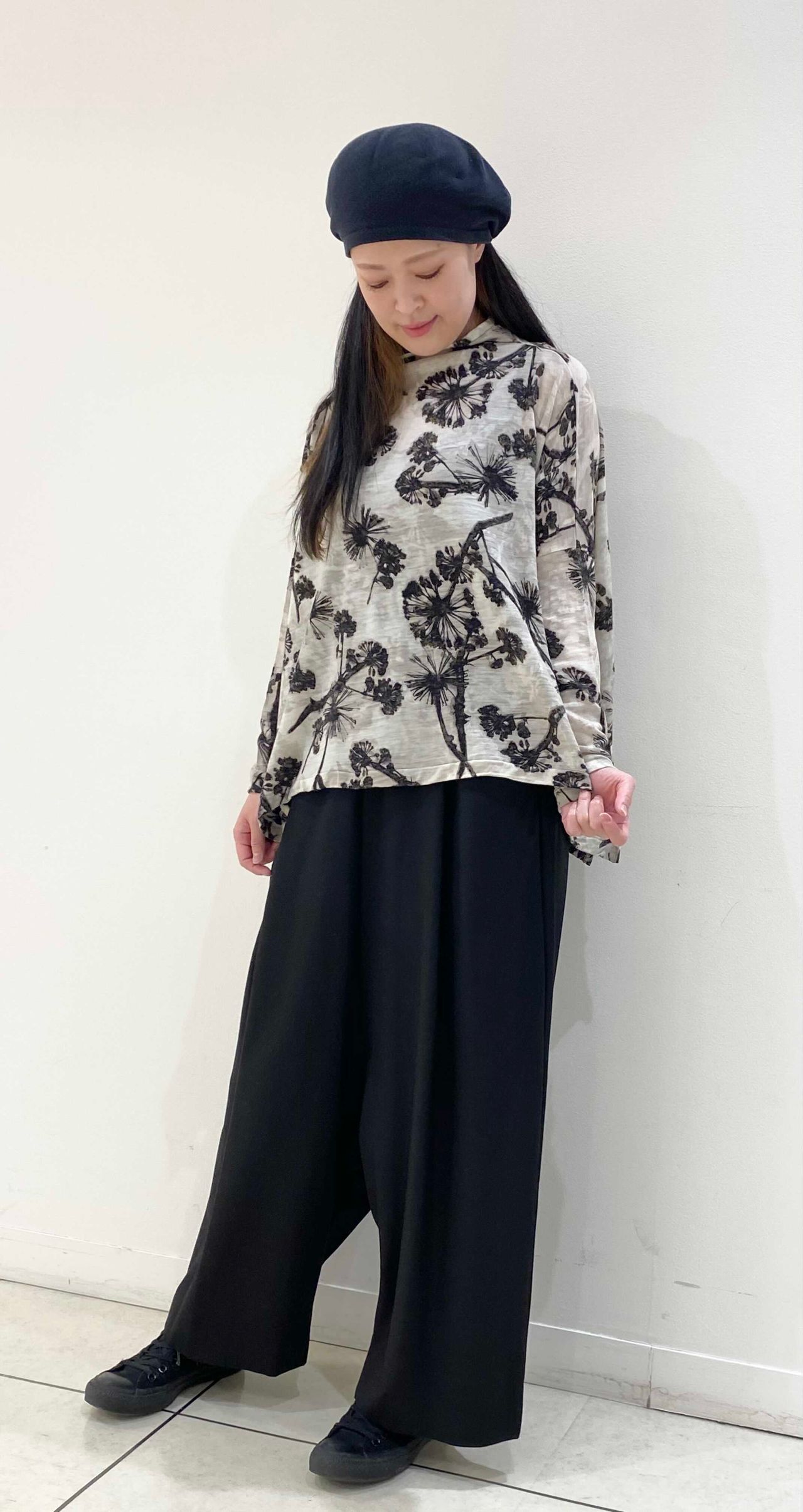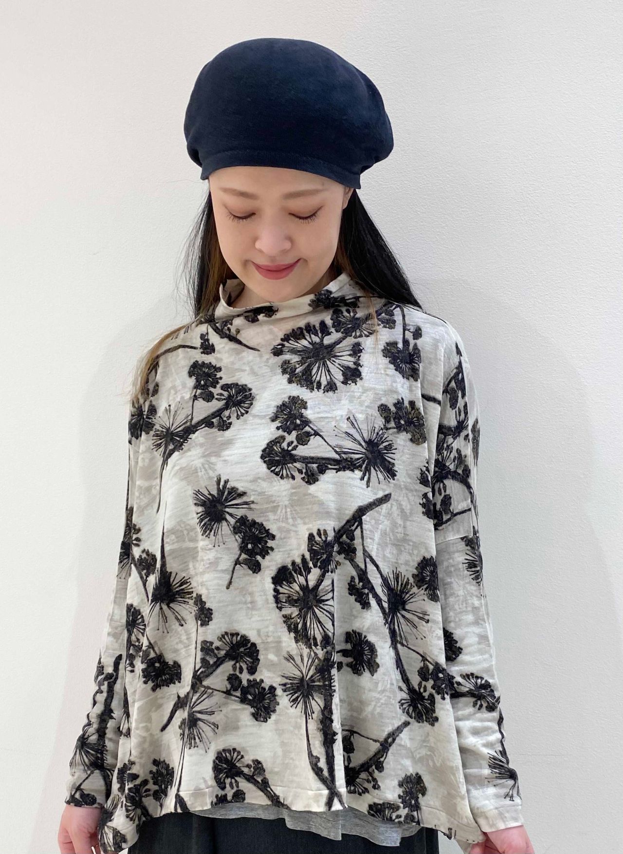 カットソーはフラワープリントが目を引く1枚。
