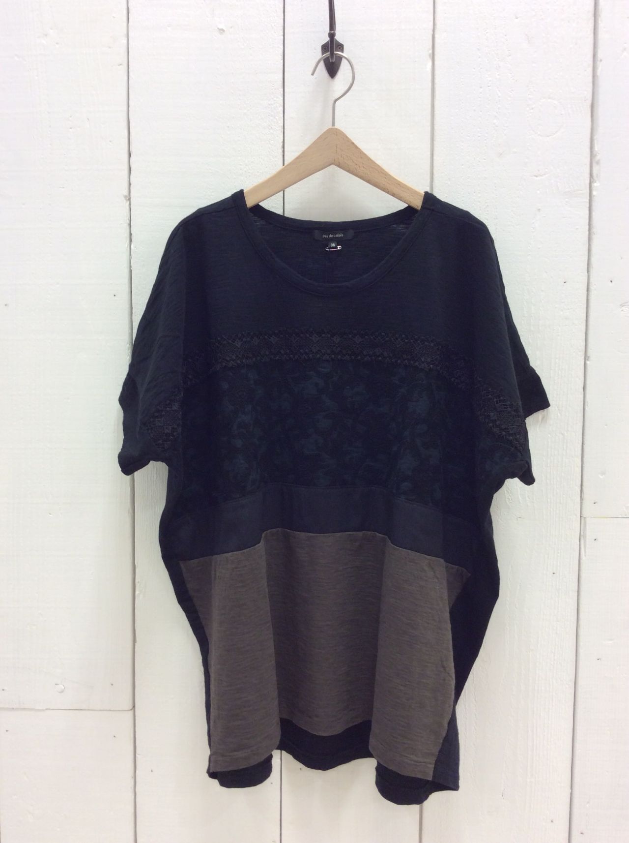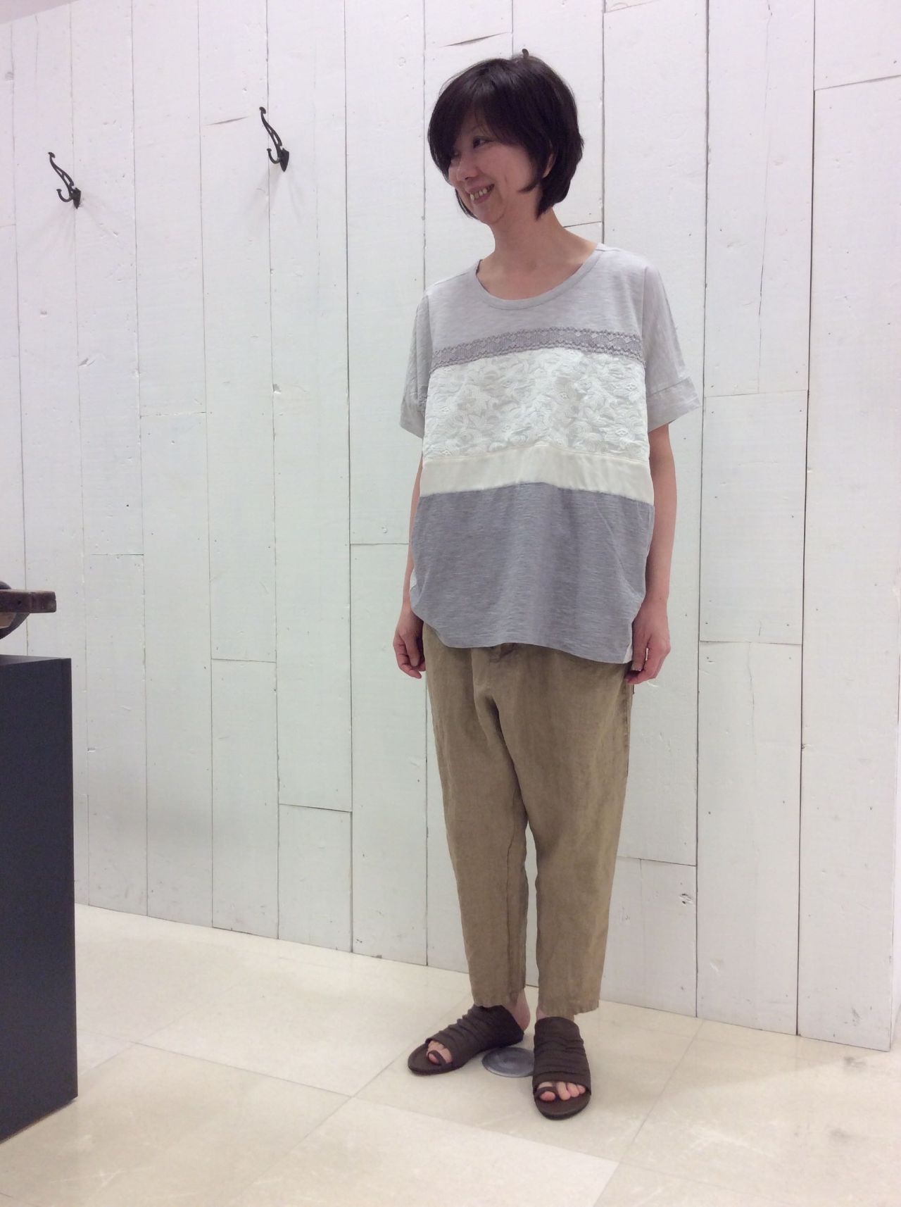 パッチワーク風でレース部分があったり、ムラ染め部分があったり、さらっと着ているのにとても凝っていてオシャレにみえます。