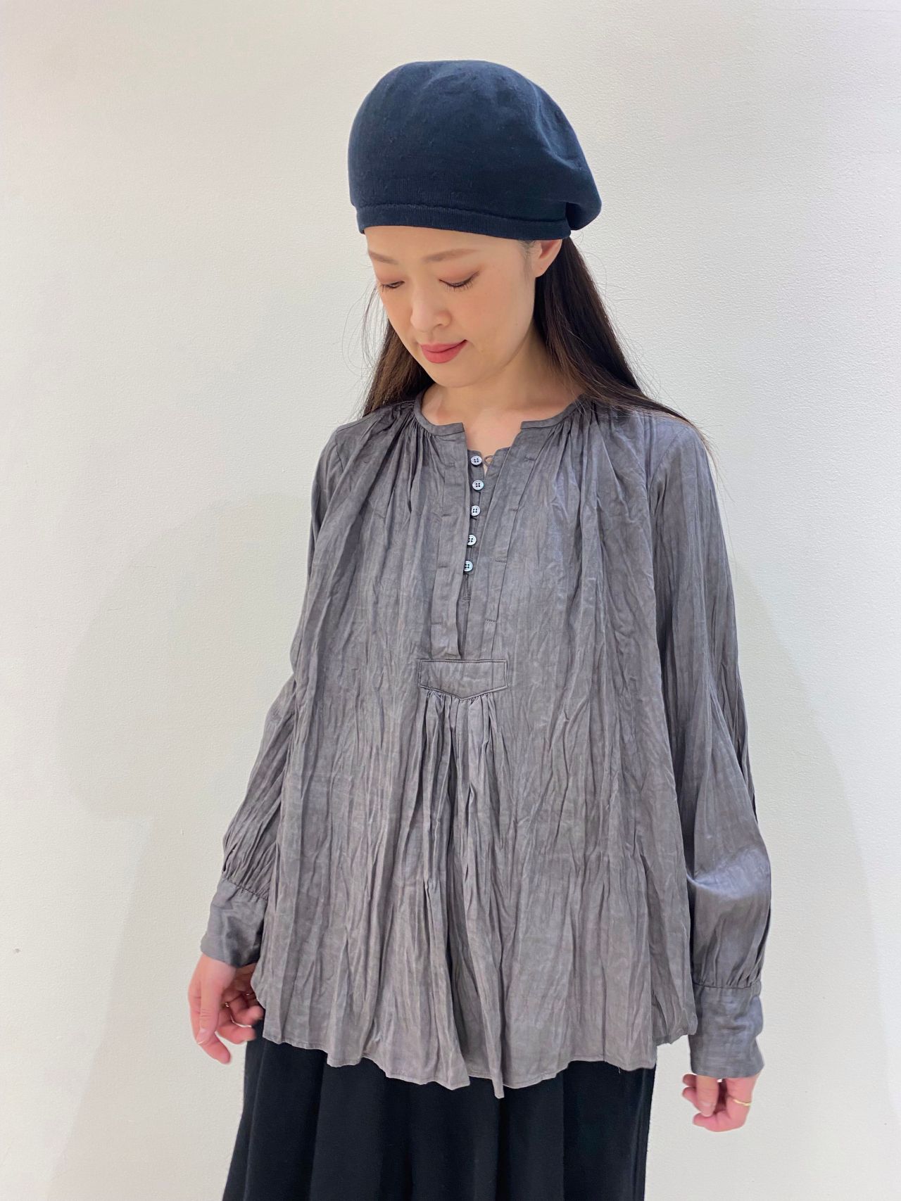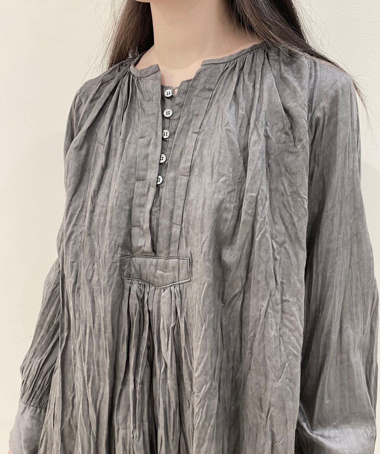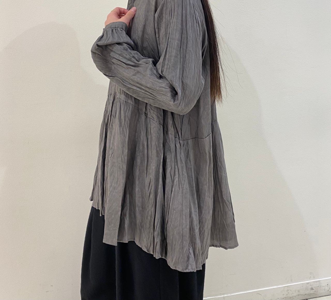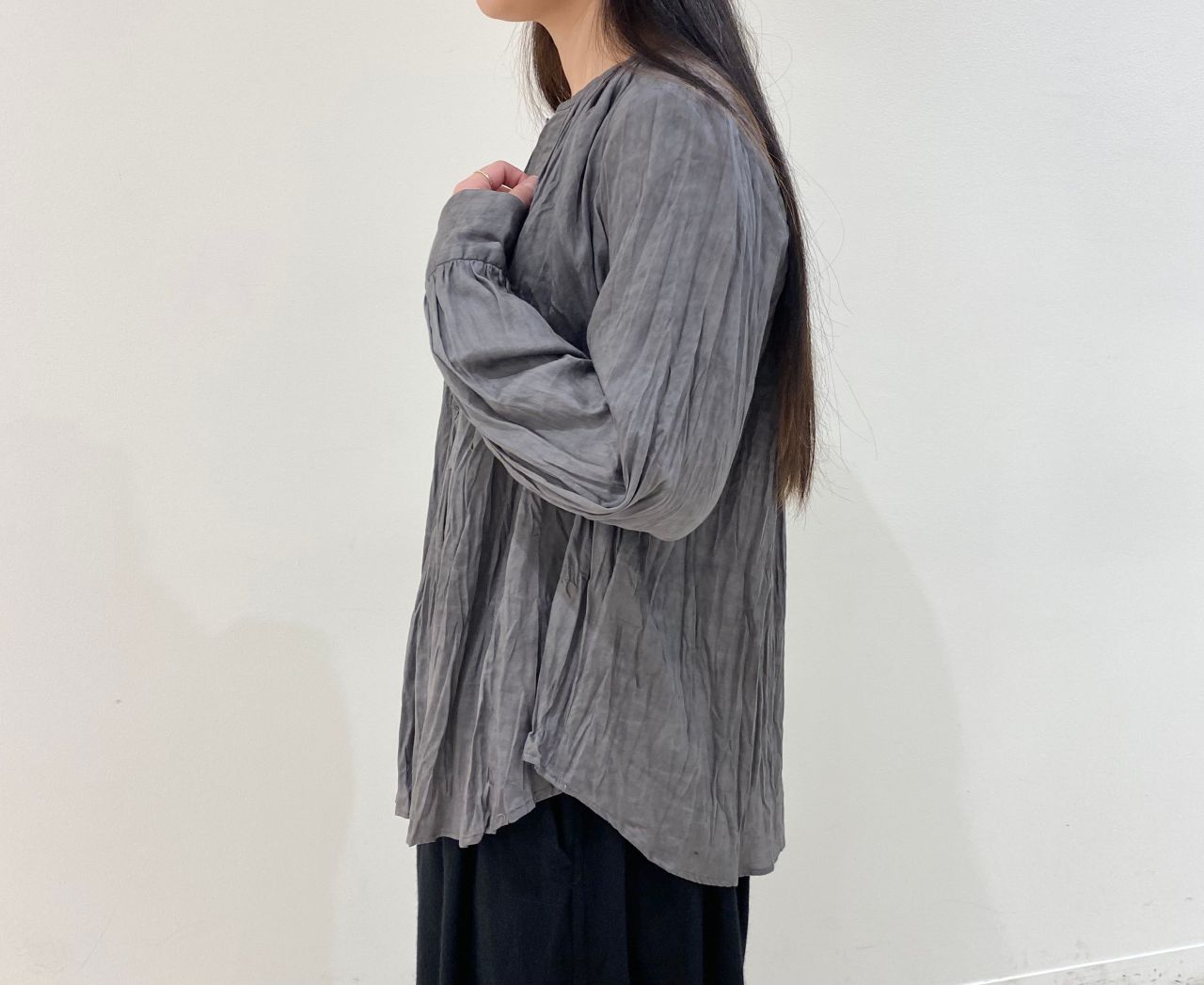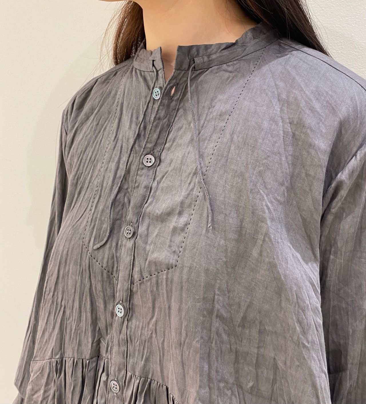 胸元や袖口などに入れたギャザーと、首元の折り返し開き仕様がどこかアンティークな印象になります。