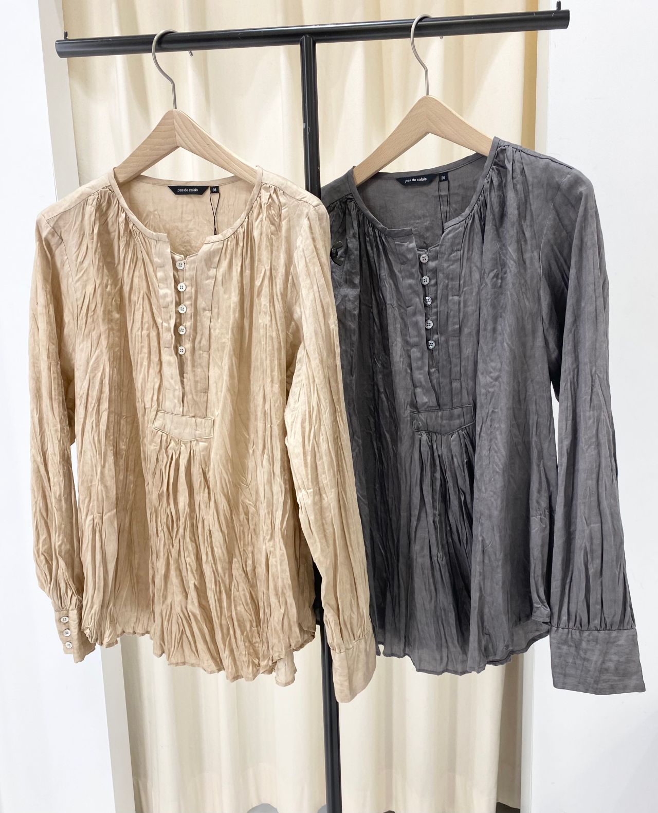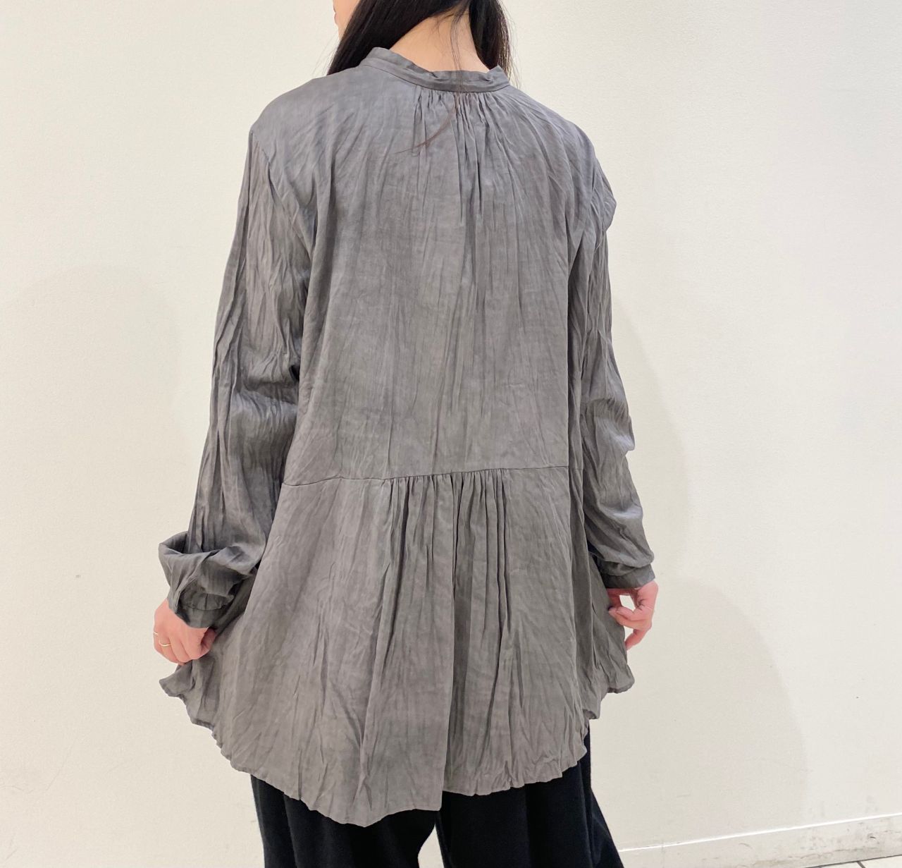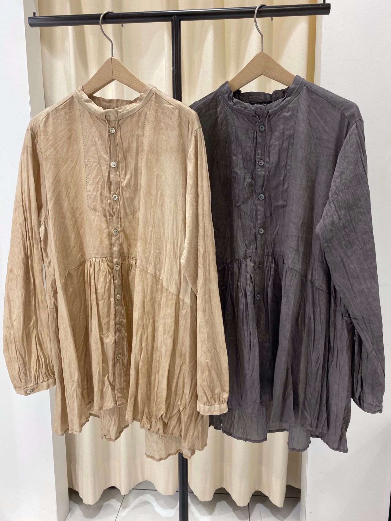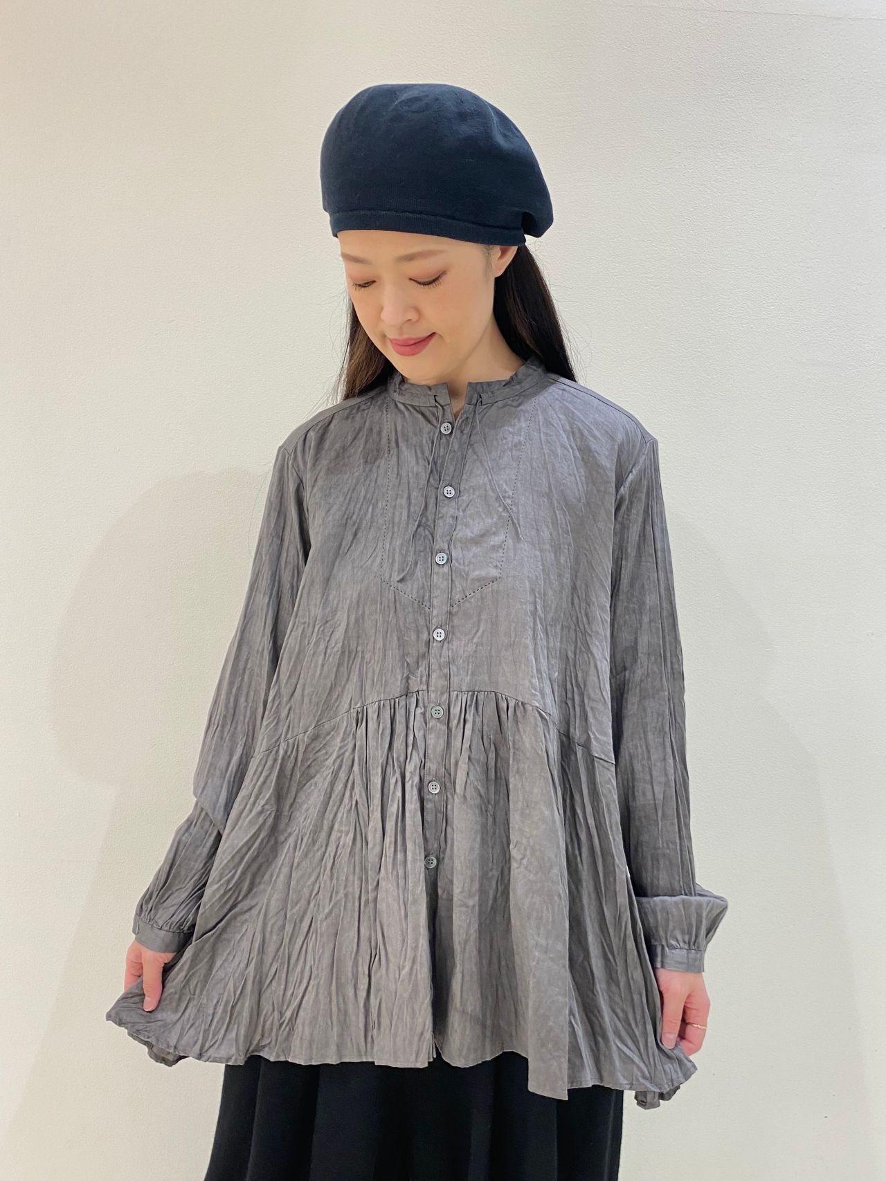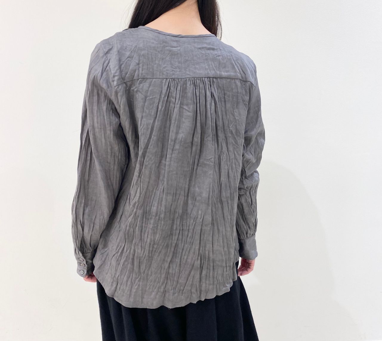 胸元や袖口などに入れたギャザーと、首元の折り返し開き仕様がどこかアンティークな印象になります。