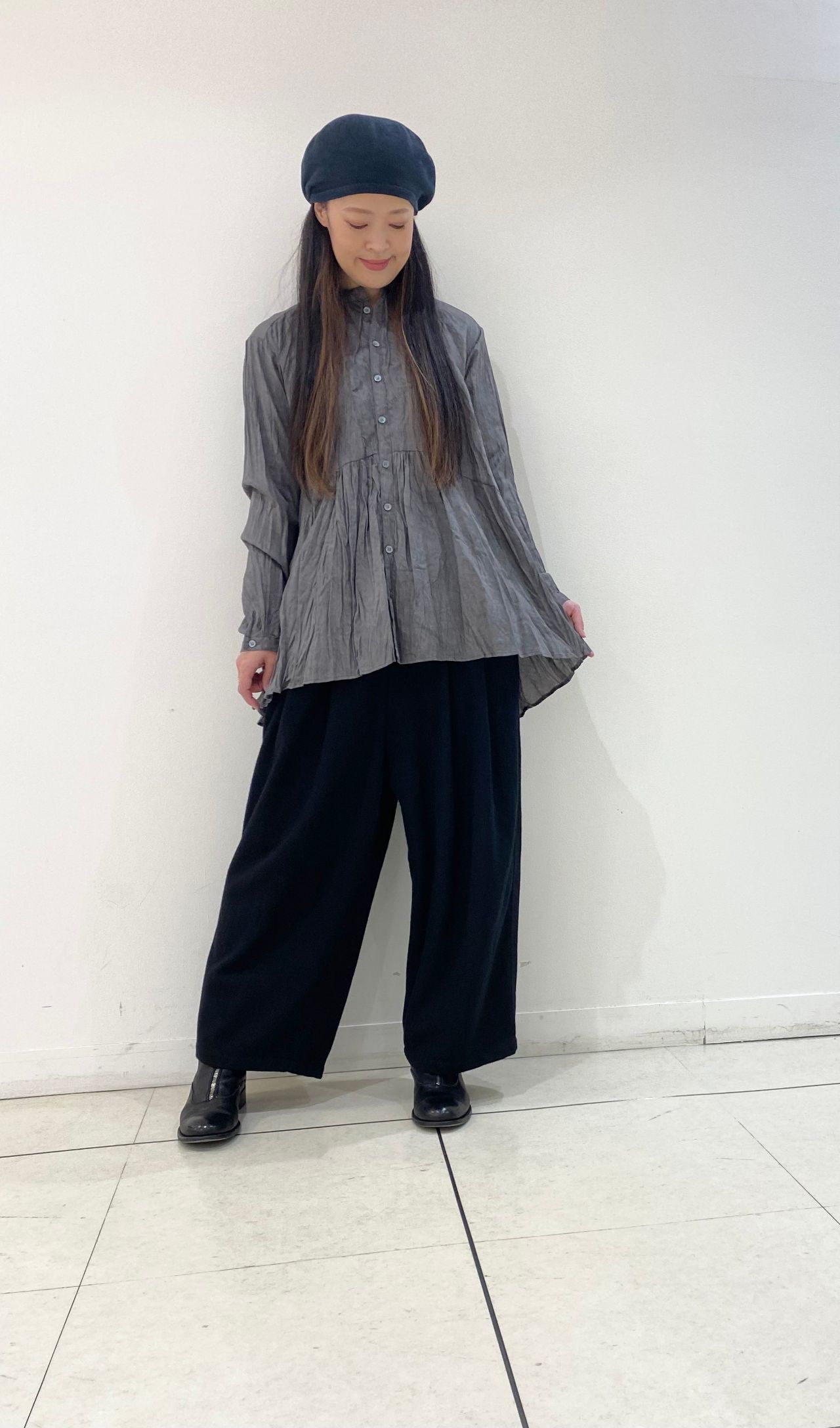 裾にかけてギャザーとフレアーを入れ、Aラインシルエットに仕上げております。