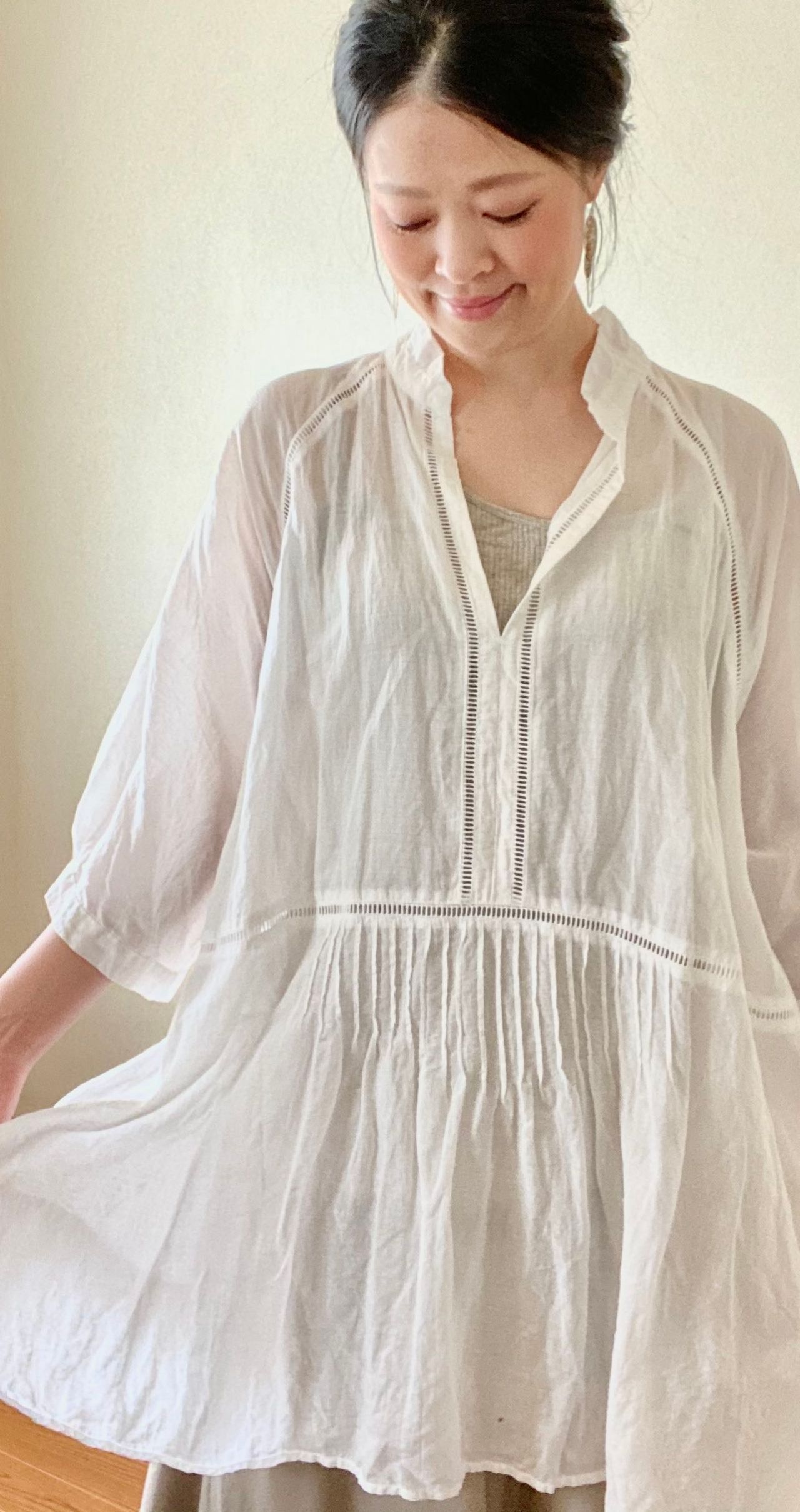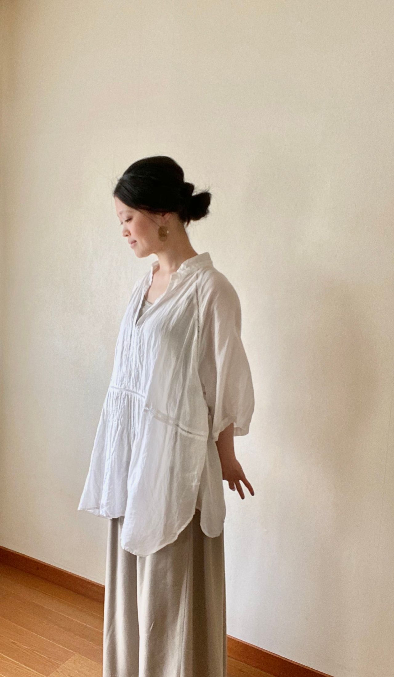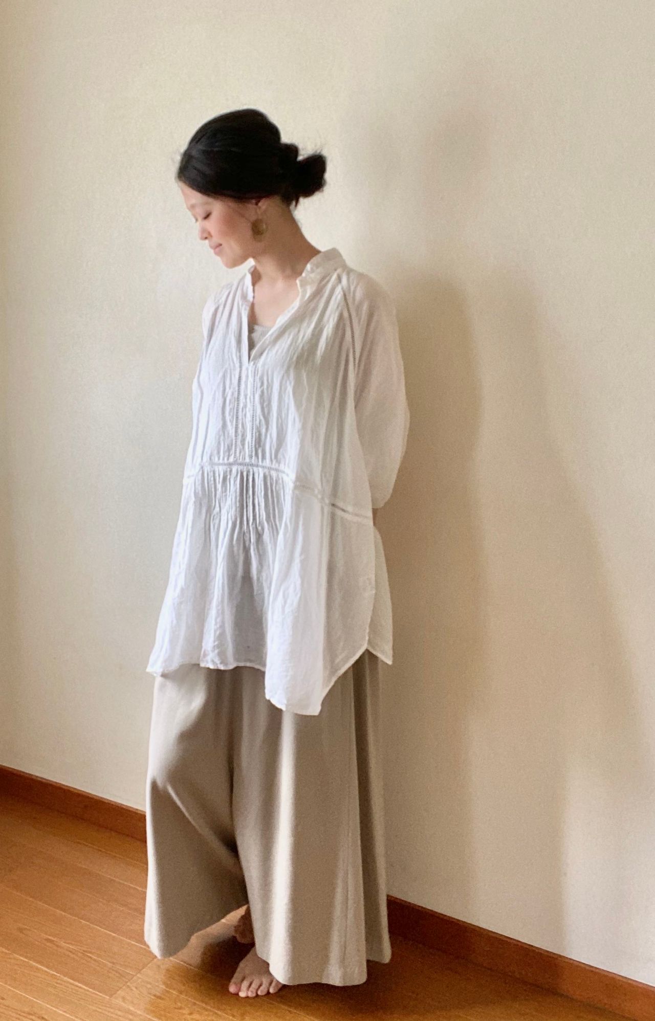 ホワイトのプルオーバーブラウスと合わせてみました。
