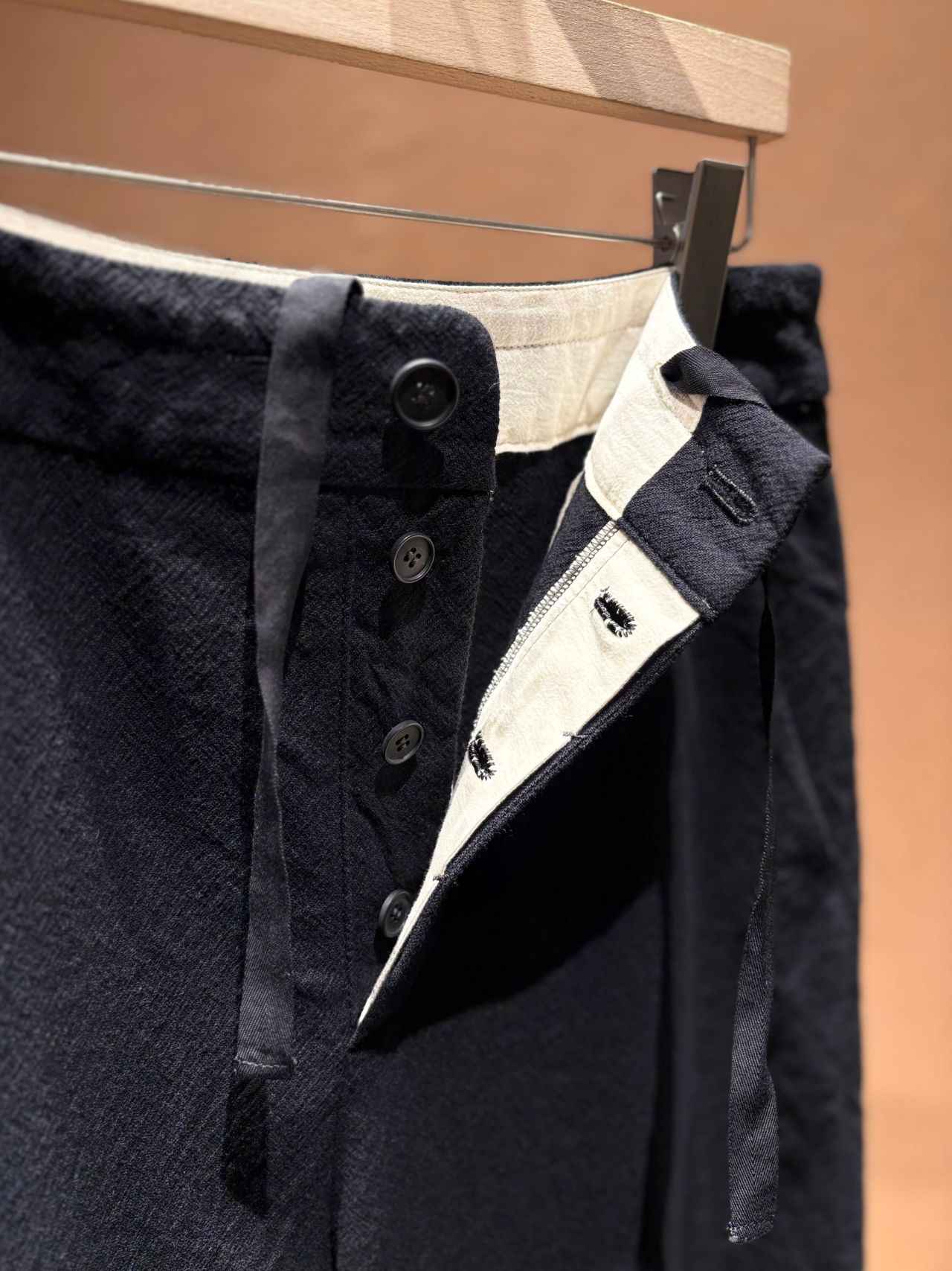 フロントはボタンフライ、ウエストは内側の紐でサイズ調整できるため、ベルトなしでもきれいに決まります。