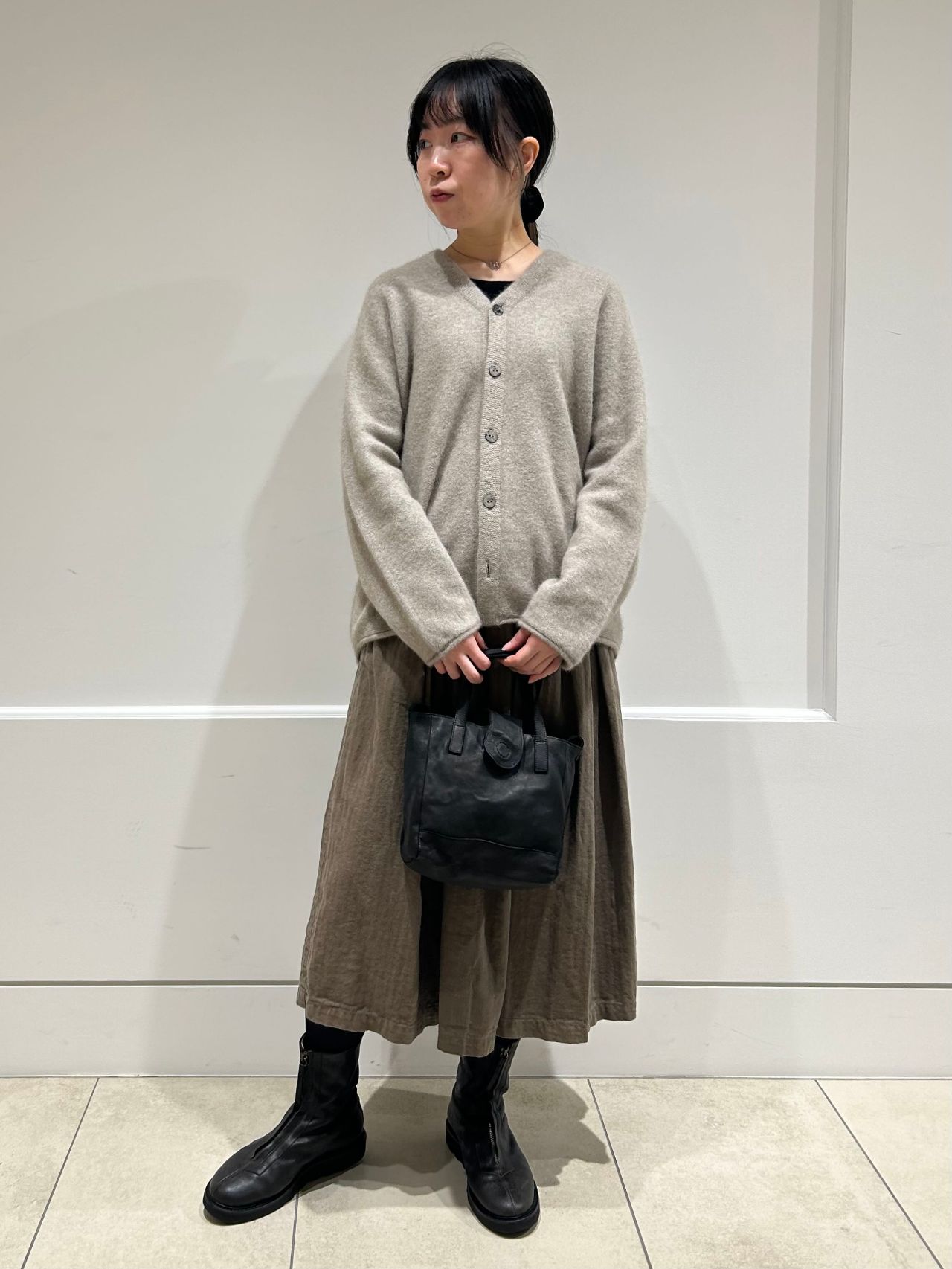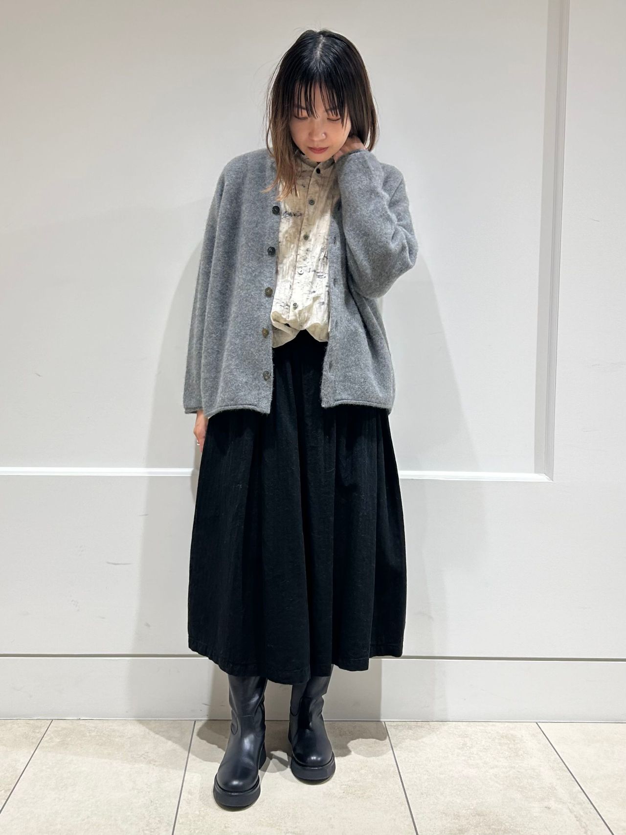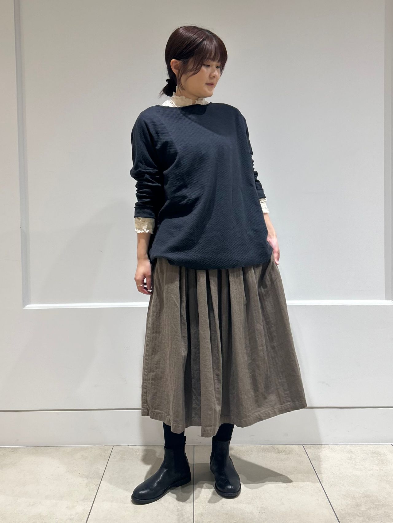 自然なフレアが綺麗なので、シンプルにタートルニットやブラウス、ロングブーツで暖かみある着こなしがおすすめです。