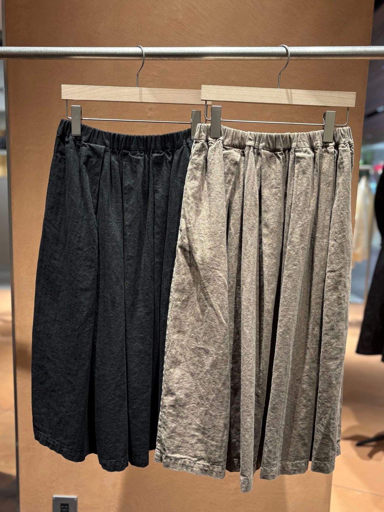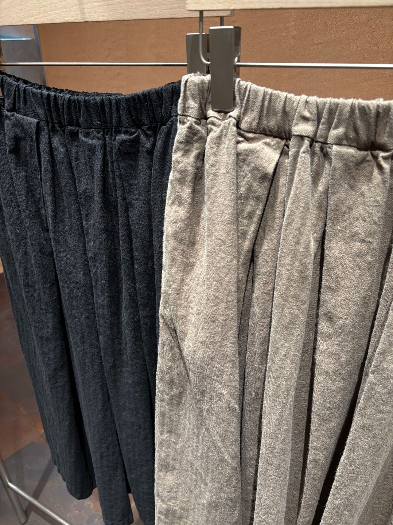 ランダムなタックとギャザーによる適度なボリュームで、分量と動きを出しました。ウエストはゴム仕様+ベルト内側に紐を通した安定感のある仕様で、両サイドのポケットがデイリーに使いやすく実用的です。