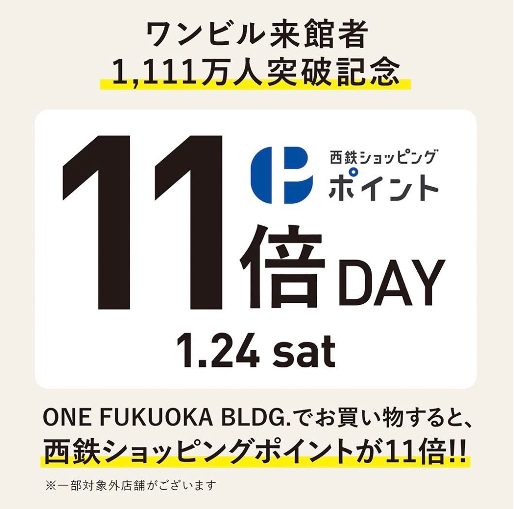ワンビル来館者1,111万人突破を記念し、西鉄ショッピングポイント11倍キャンペーンを行います。