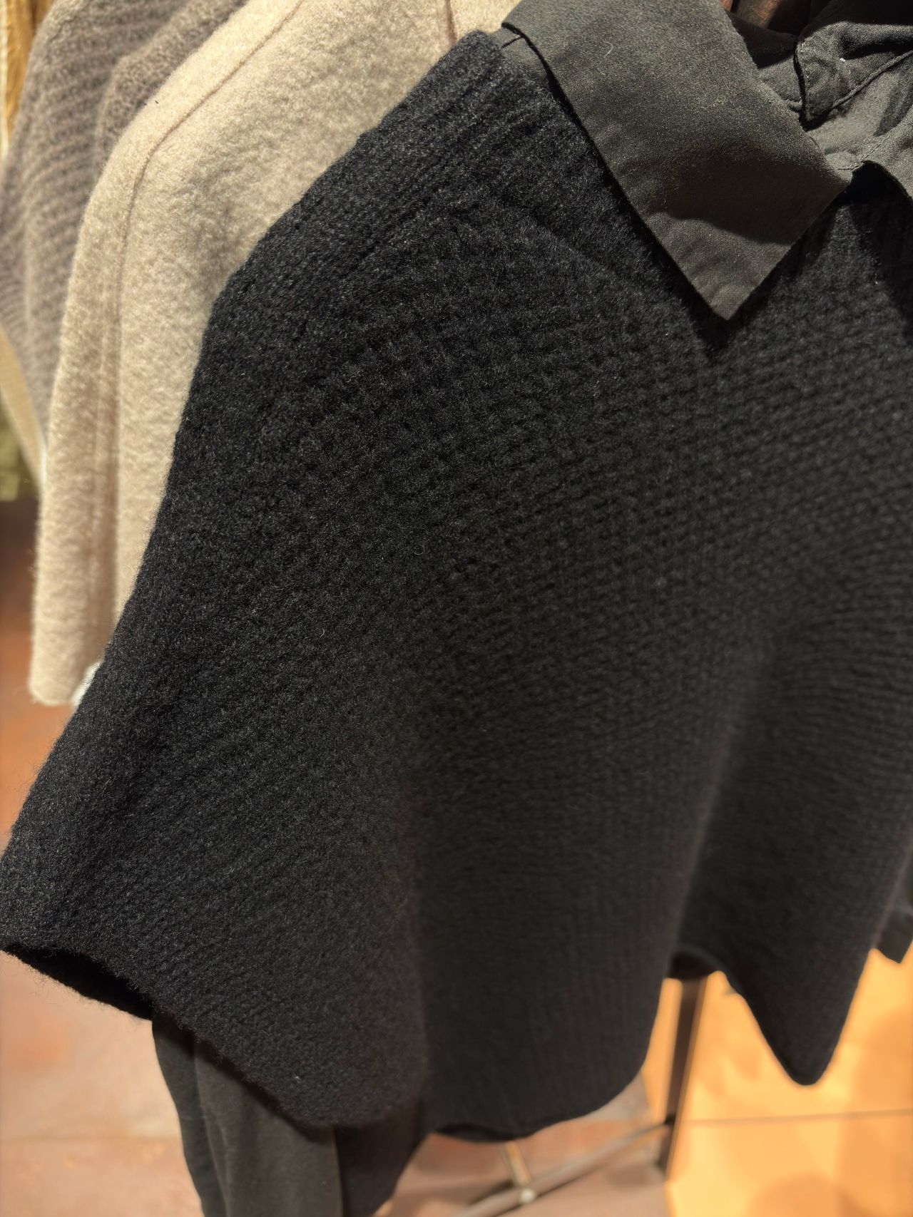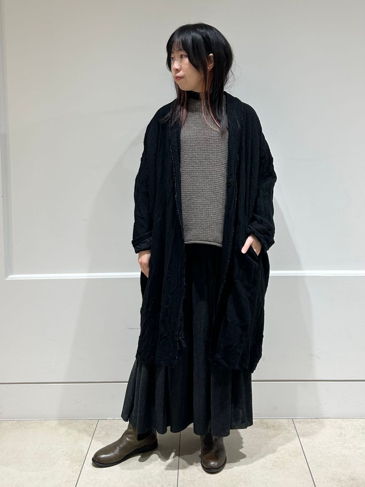 前後差を出した着丈や、裾の太めのリブ編みもポイント。