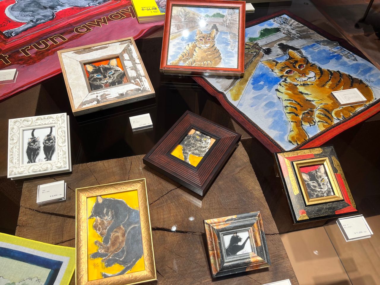 展示会でもひときわ人気を集めた猫プリントアイテムや、作家・栗原君古さんの動物愛を感じる作品が並びます。