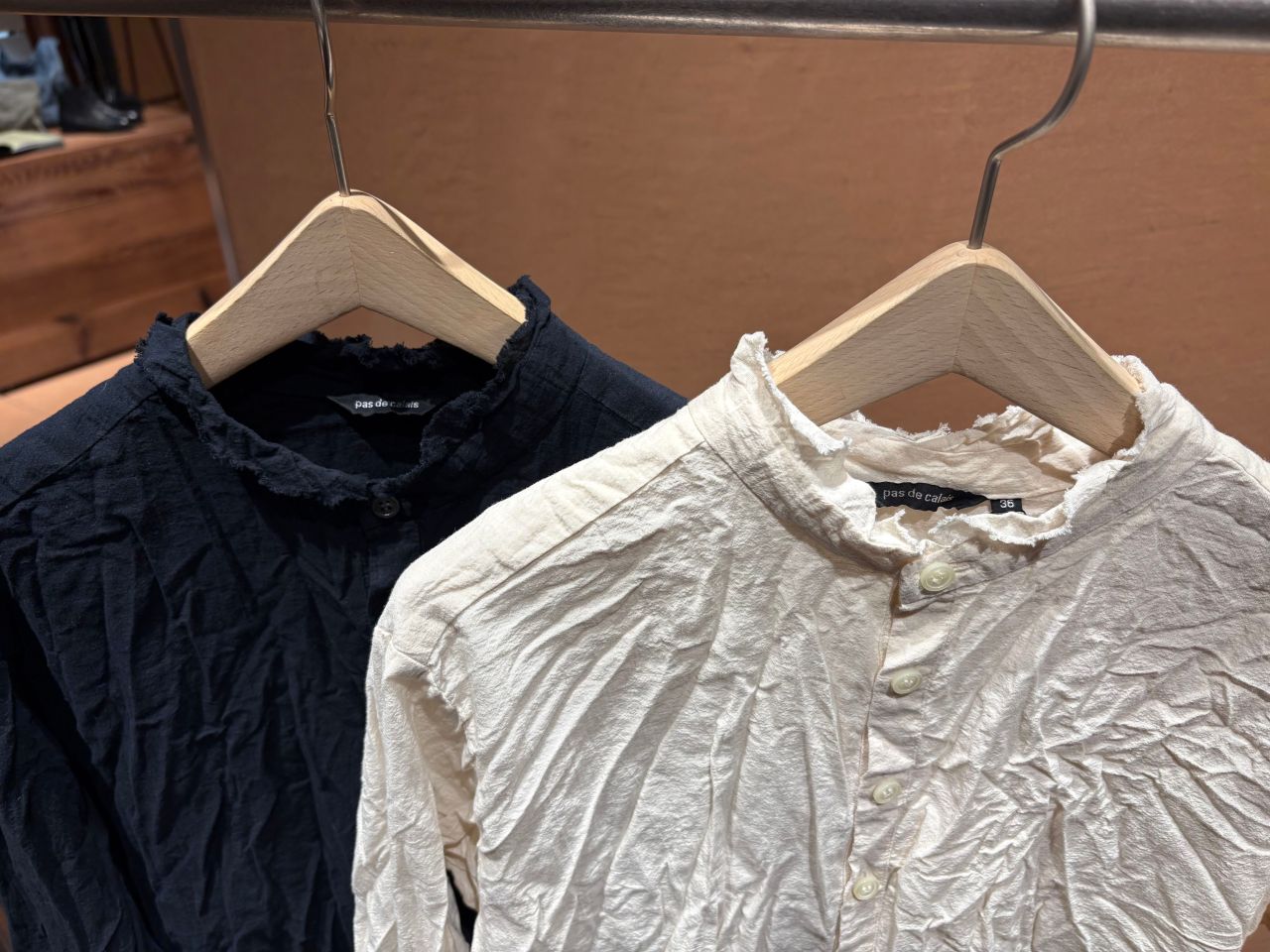 タテ糸にコットン強撚糸を使うことでシャリ感と清涼感、綿麻の混紡糸をヨコ糸に使用してより柔らかさを感じる織物。ワッシャー加工を行って、シボ感と着用時の肌さわりの良さを表現している。