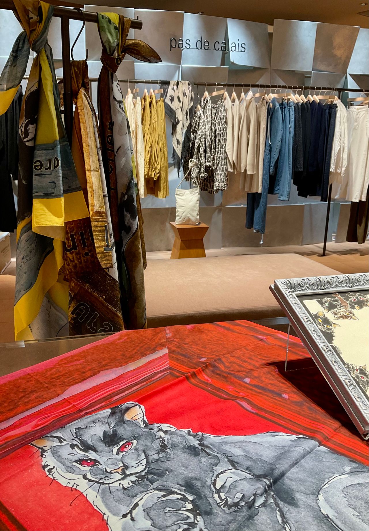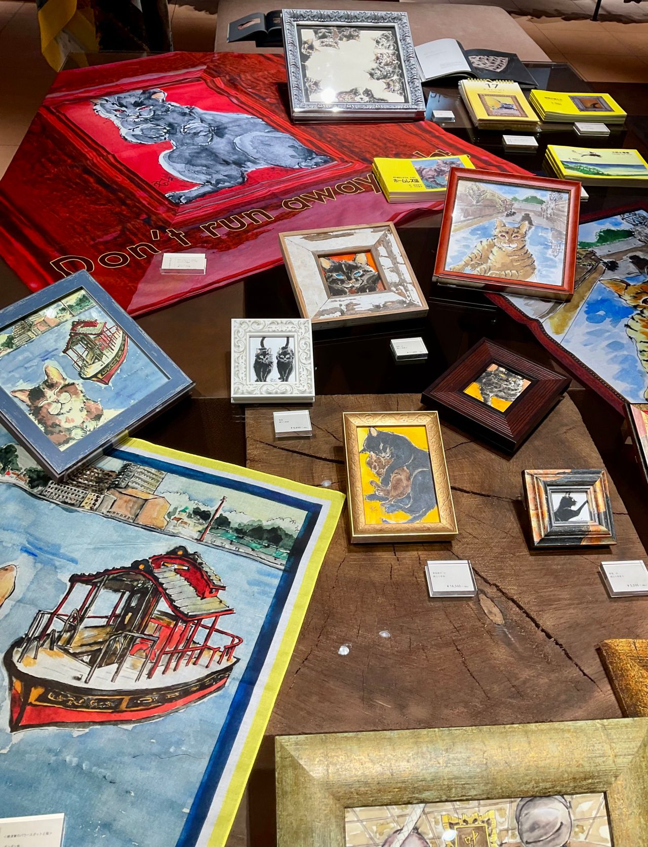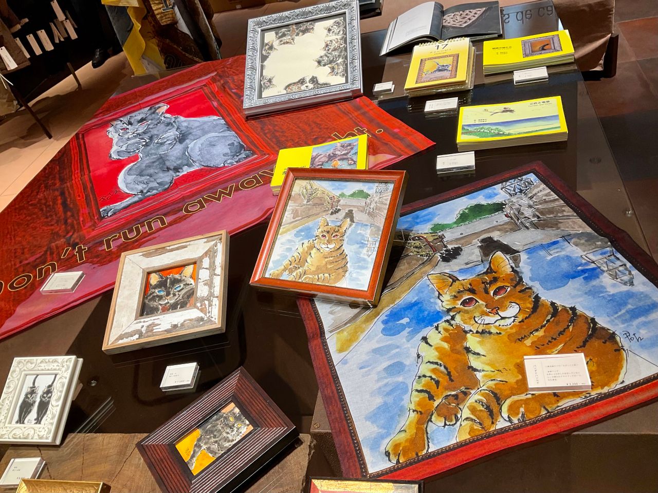 可愛らしい猫たちのカレンダーやスカーフ、原画等が並んでおります。