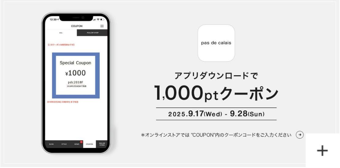 9月17日(水)〜28日(日)の期間中、公式アプリダウンロードで、その場で使えるアプリ会員限定1,000ポイントクーポンをプレゼントいたします。(公式アプリご利用の方も対象となります。)