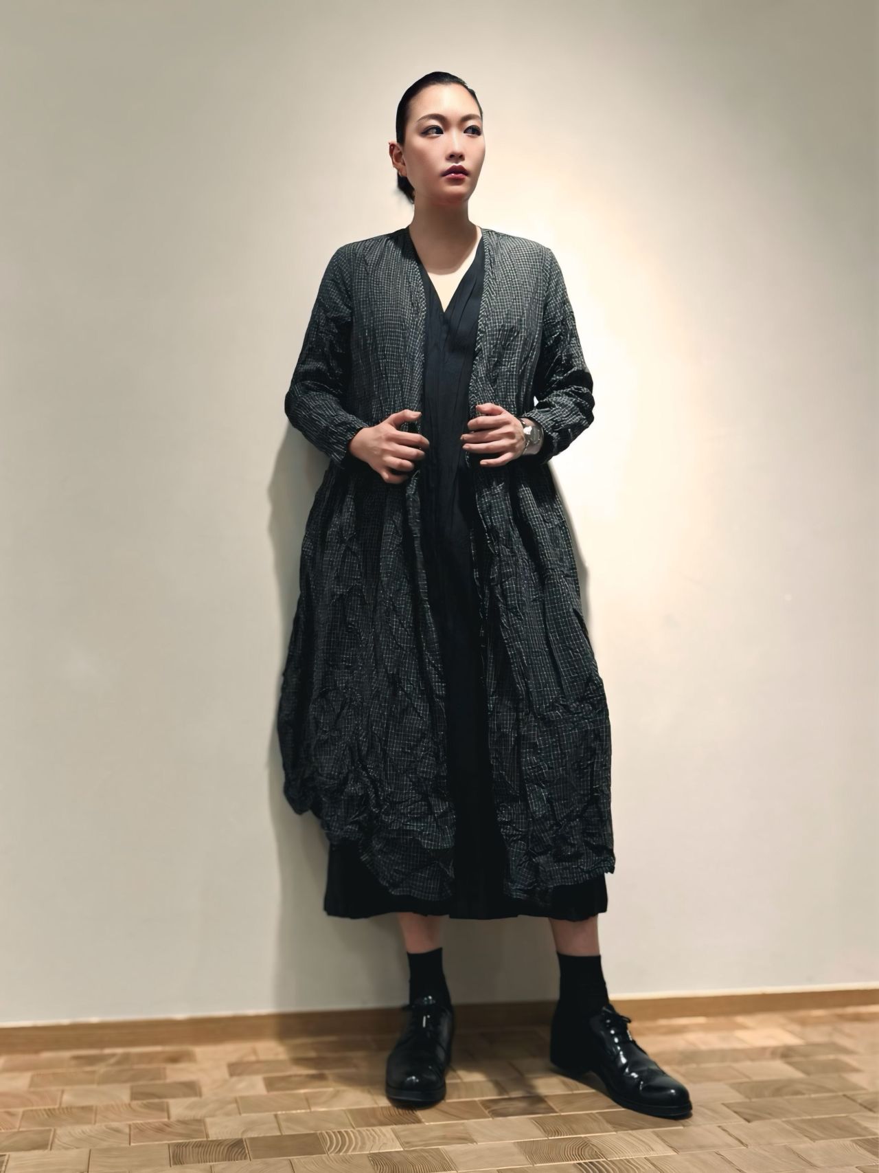 繊細なチェックをシワで崩し、ハンド縦プリーツで律する。