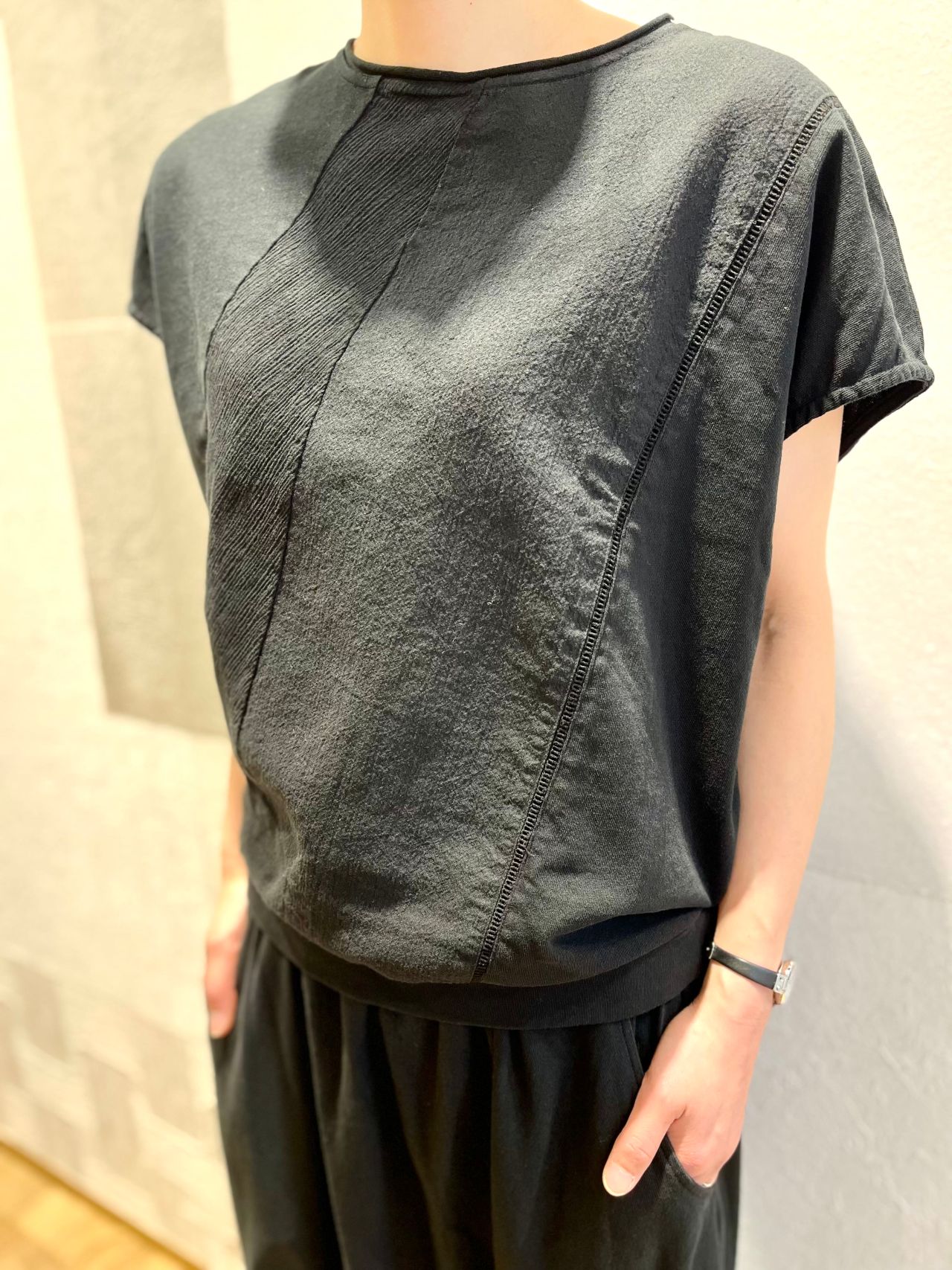 プルオーバーの中央は高島ちぢみで織り上げ、ハシゴレースがさりげなくアクセントに。