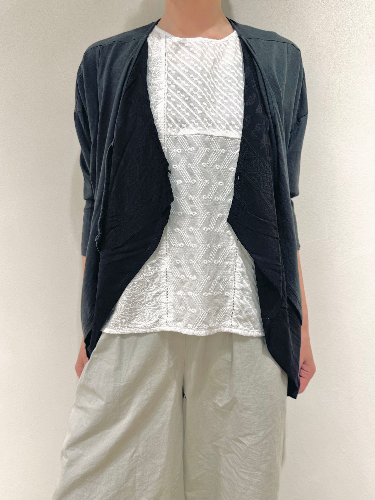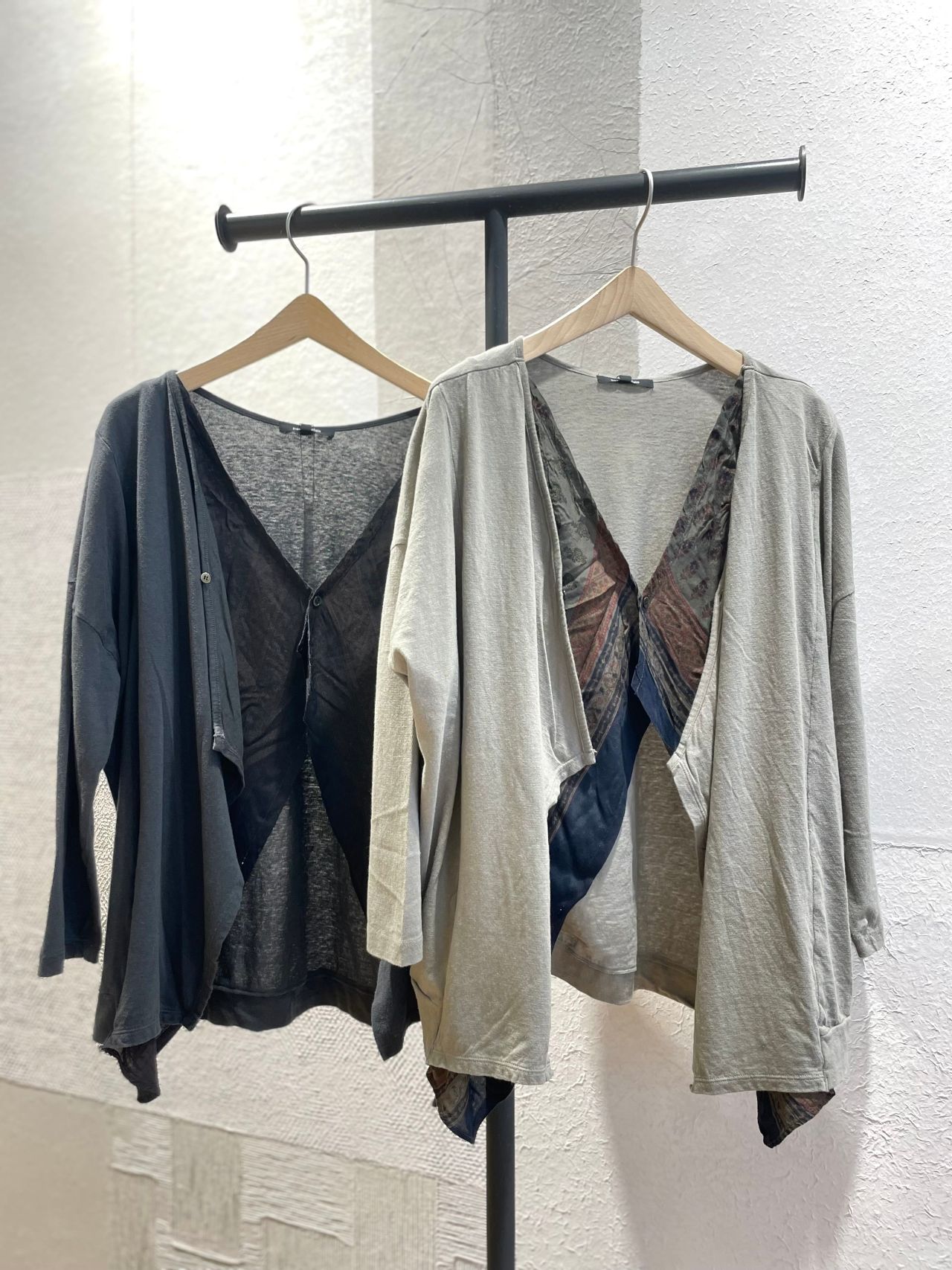 マテリアルミックスのデザインカーディガンです。