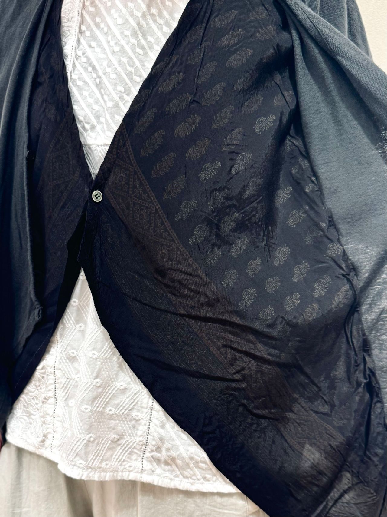 プリント部分でボタンを留めたり、無地部分でボタンを留めたり、着こなし方は自由です。