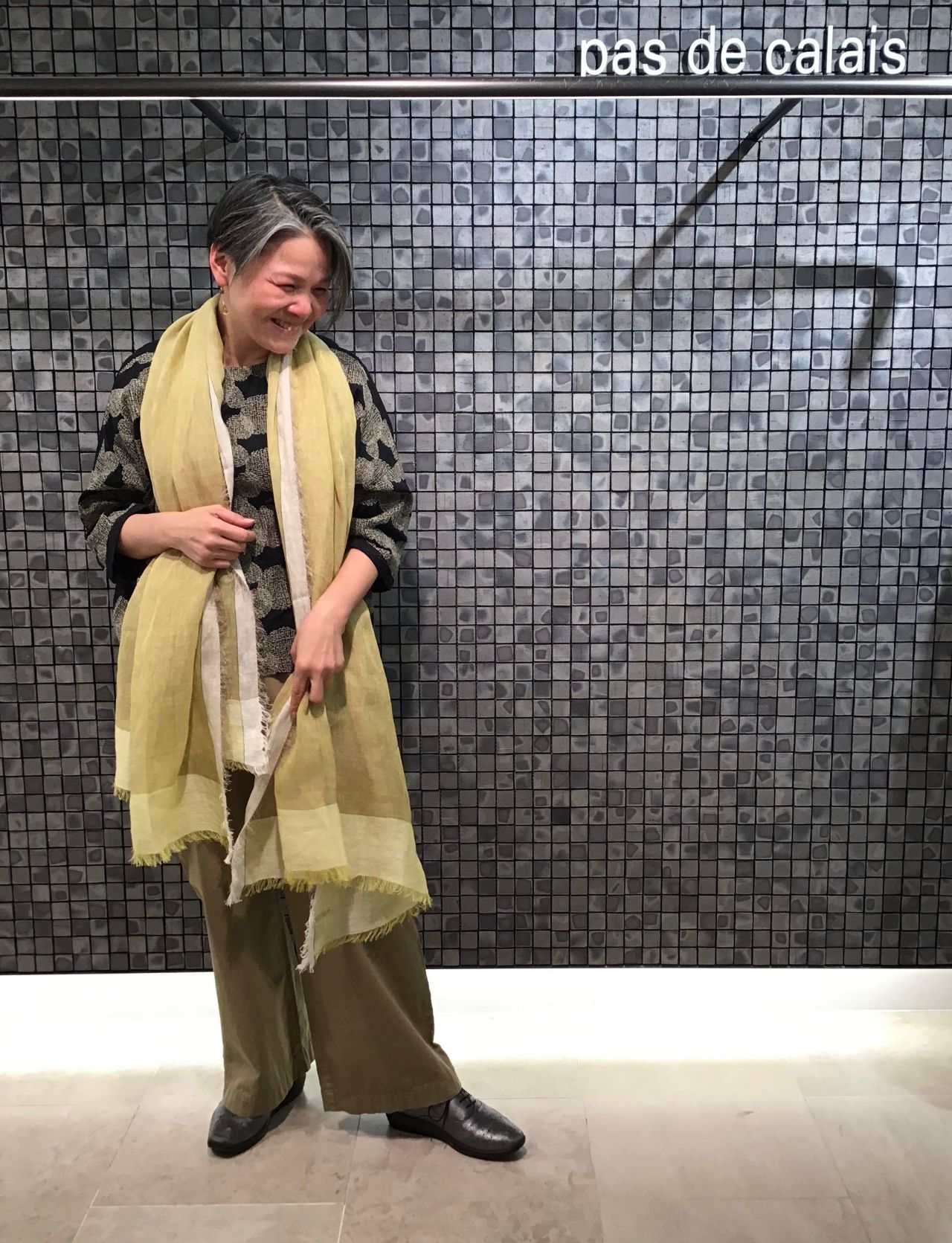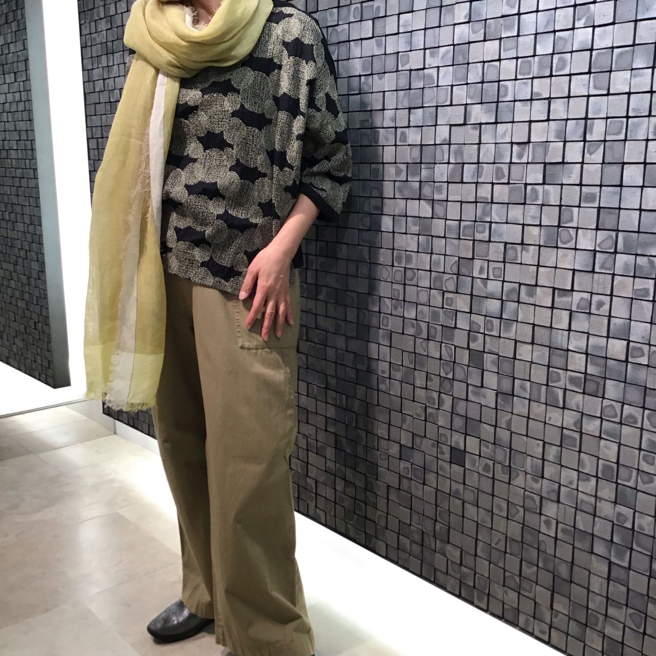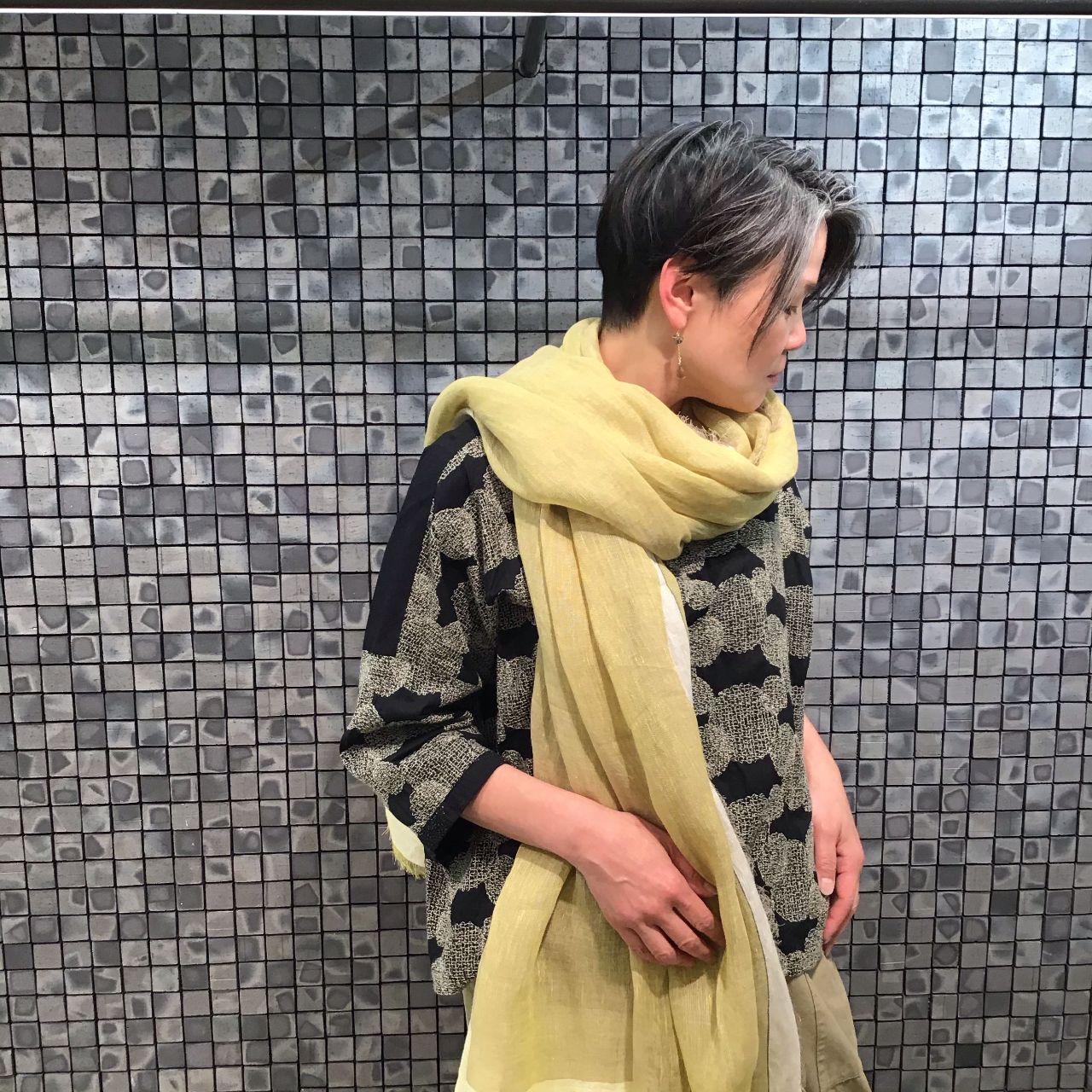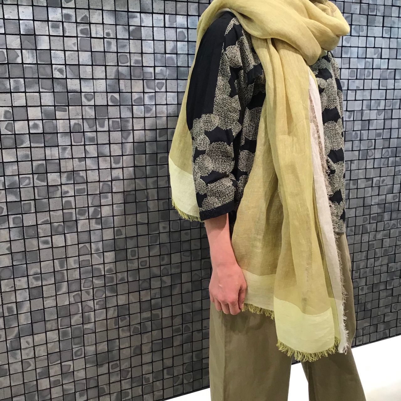 刺繍糸に合わせてイエローのリネンストールをゆるく巻いてみました。