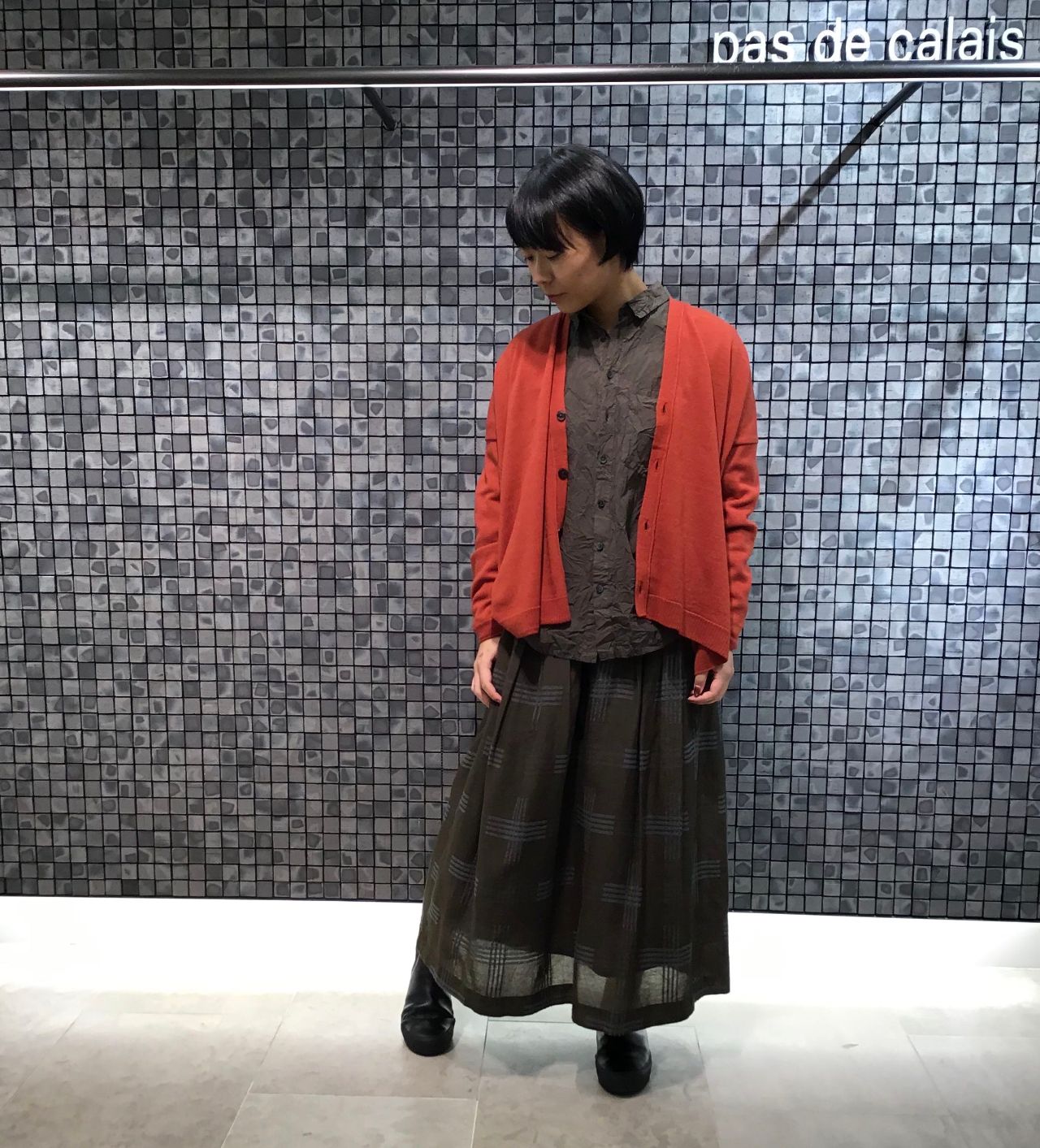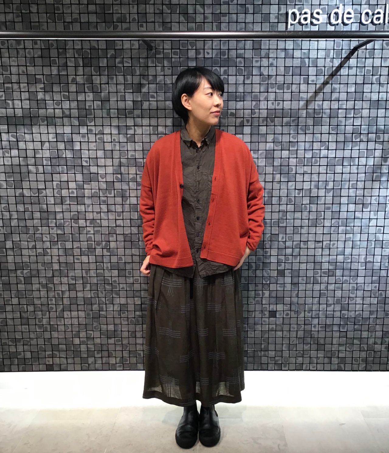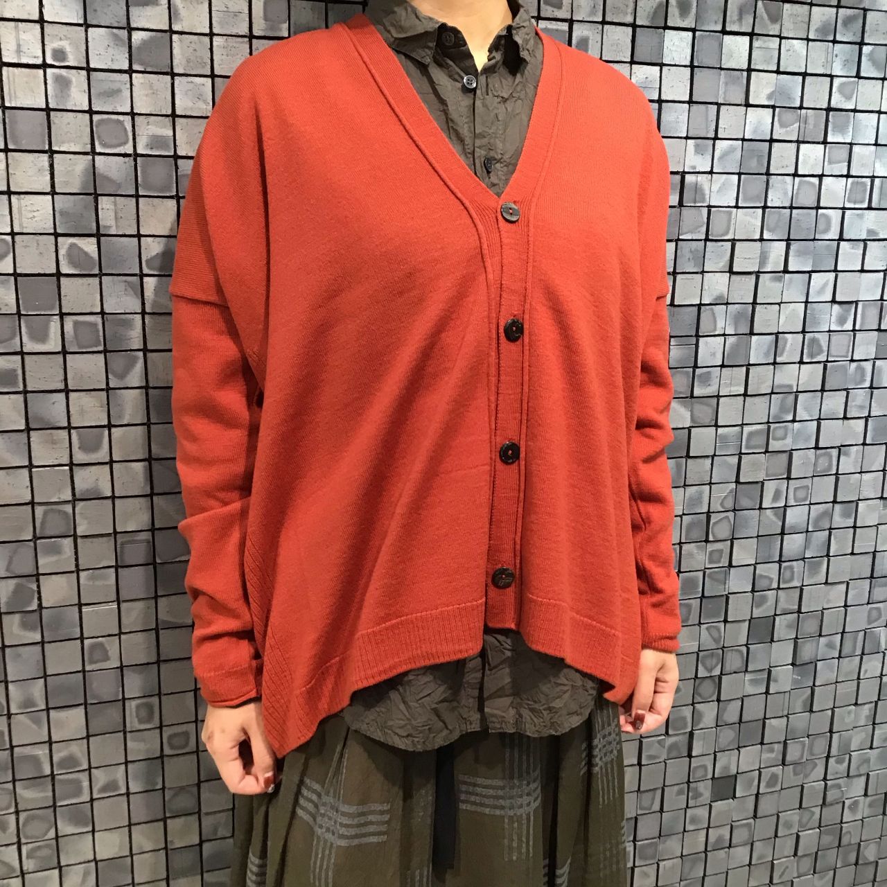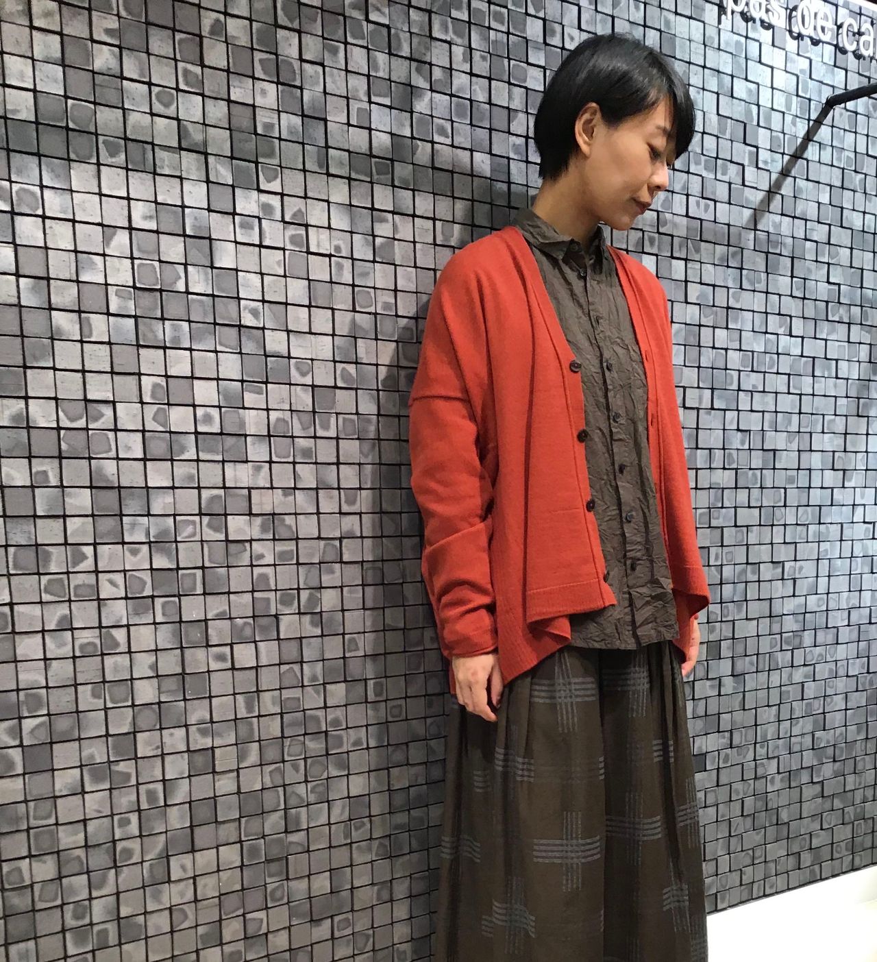 カーディガンを挿し色にするコーディネートはあまりしない私ですが、今回カーキ×オレンジのスタイリングで挑戦してみました。