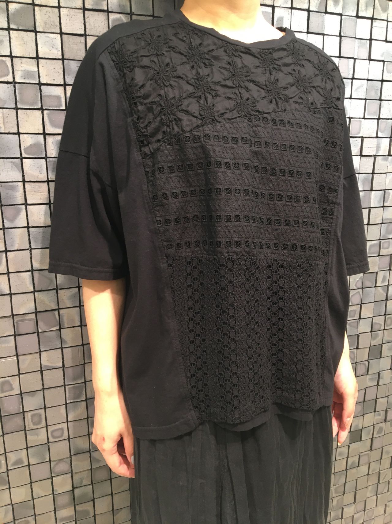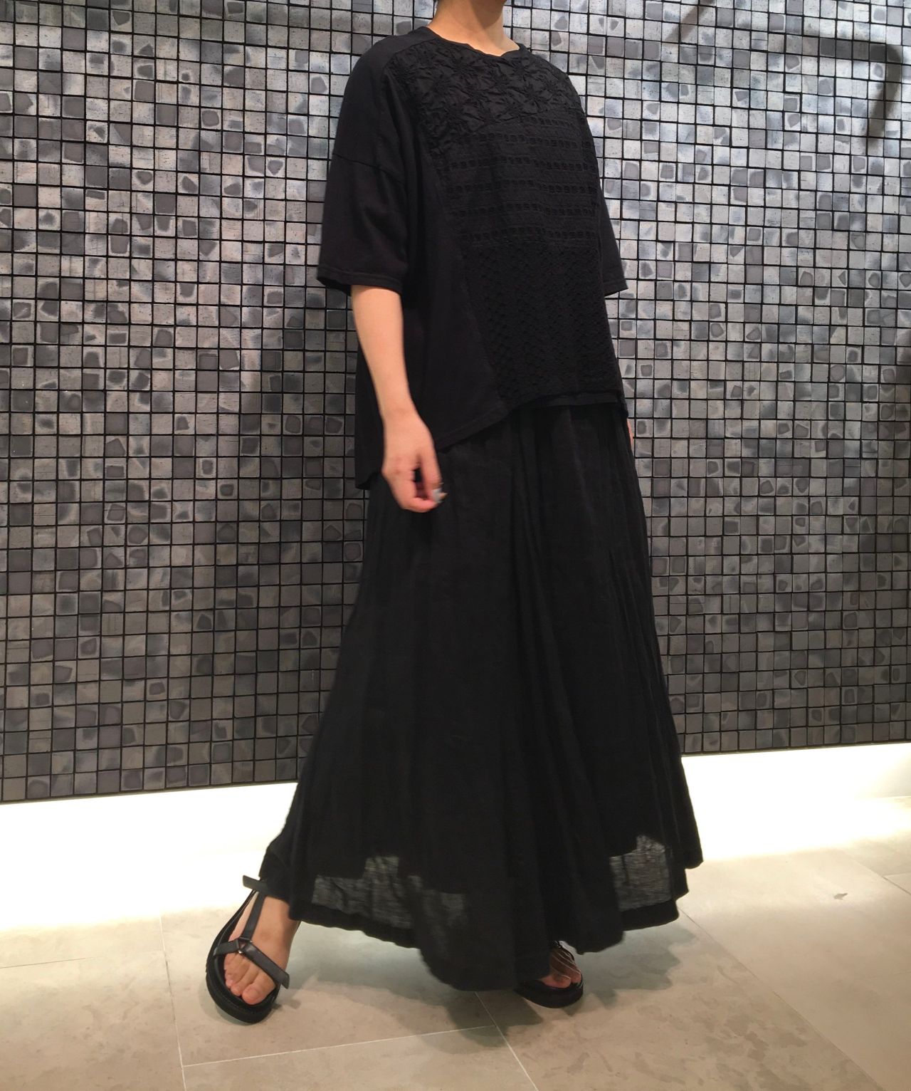黒でも、もったりとしないよう、凹凸あるレースの入ったTシャツをチョイスしました。