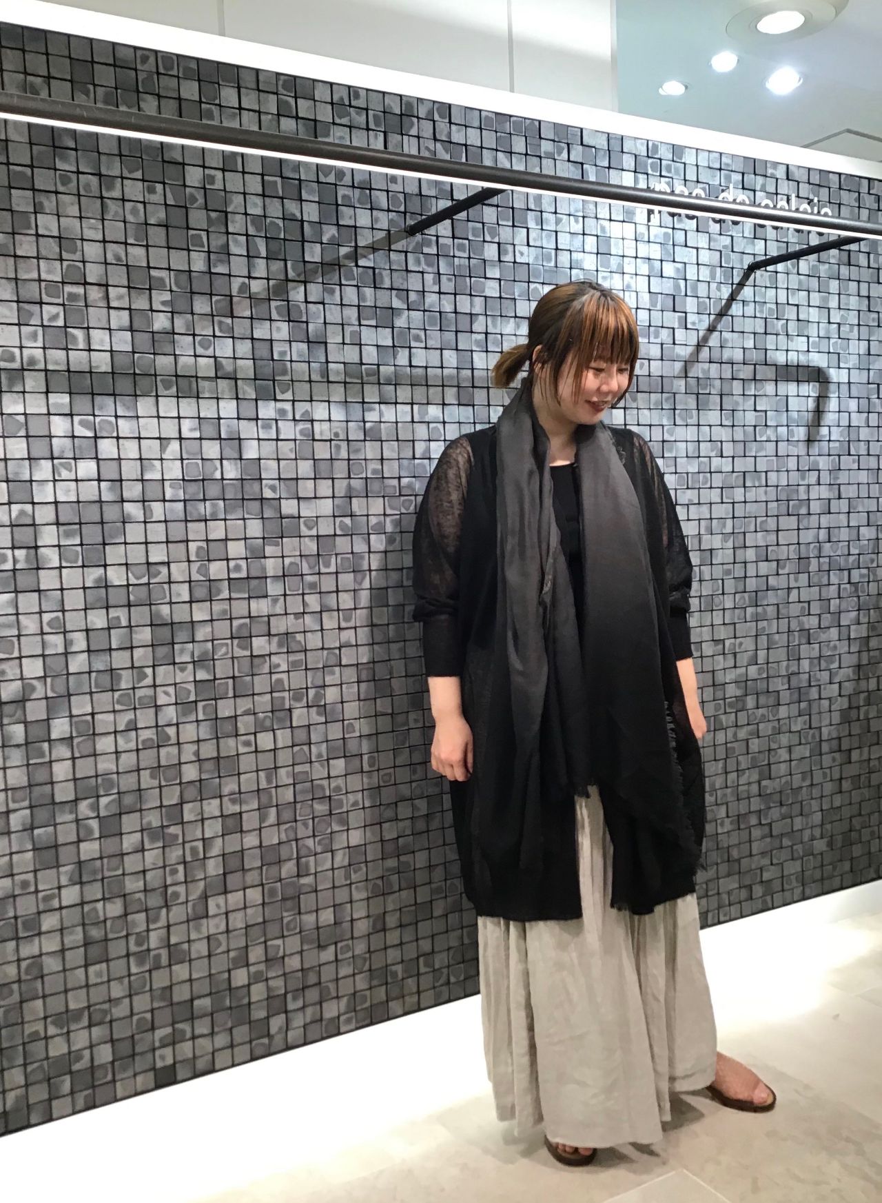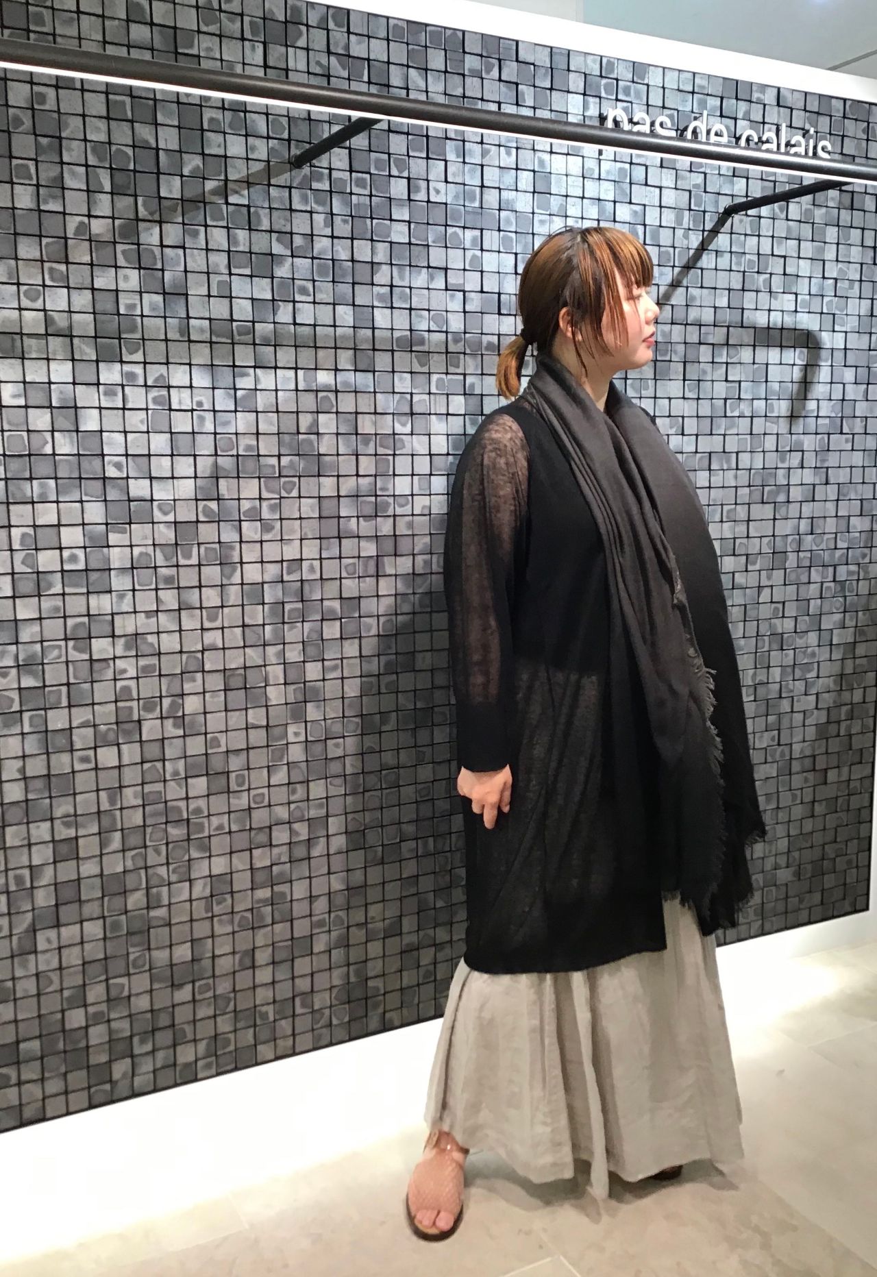 グレージュでまとめたスタイルは黒をポイントにしてみました。