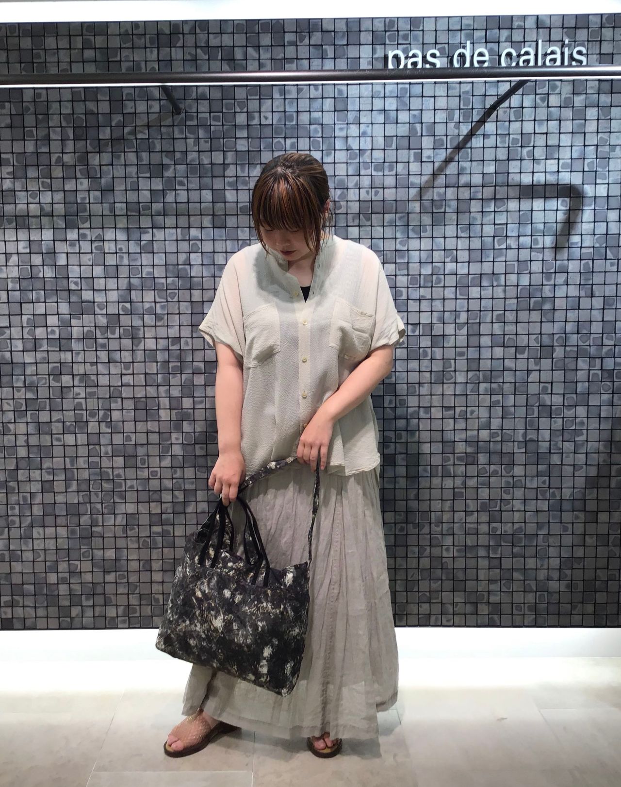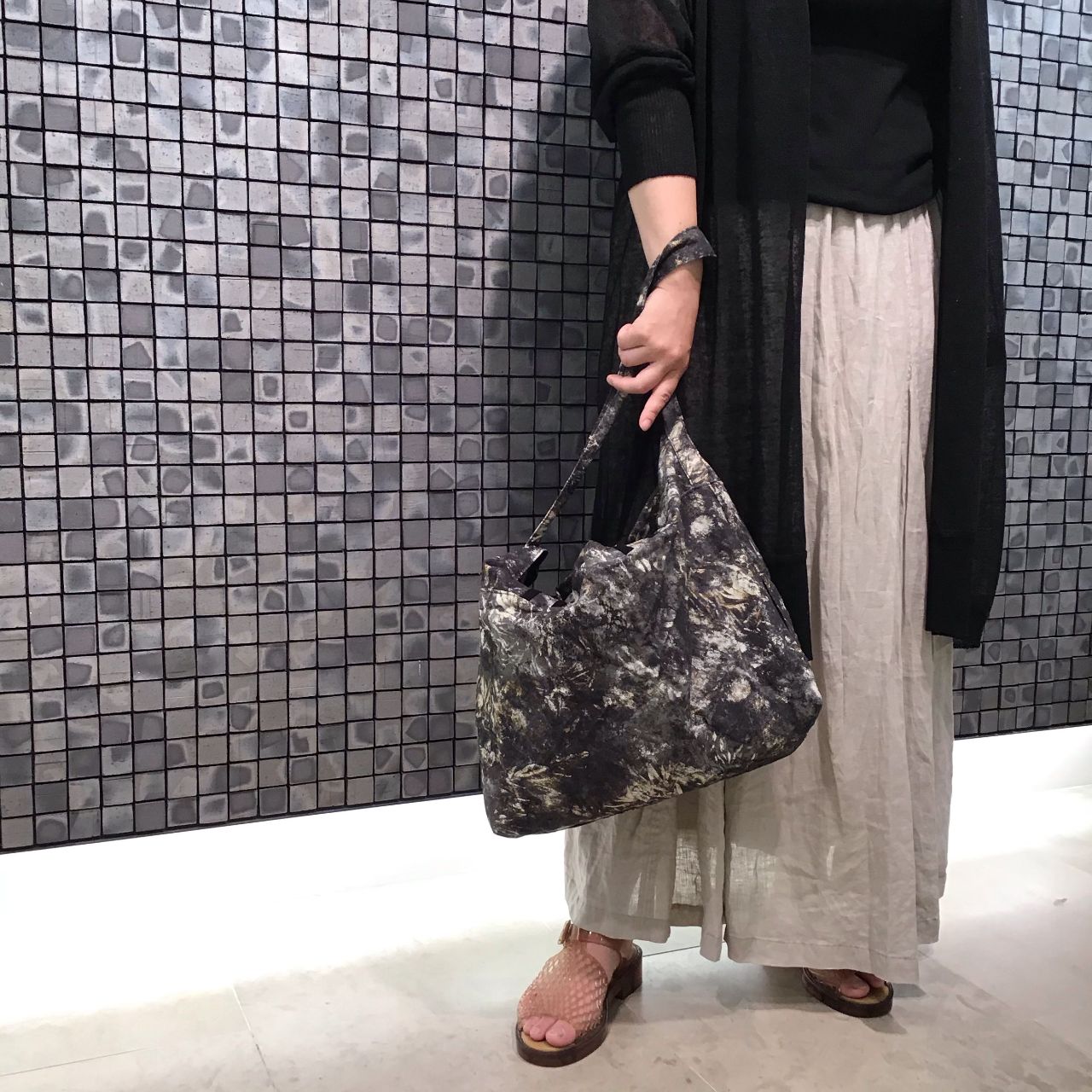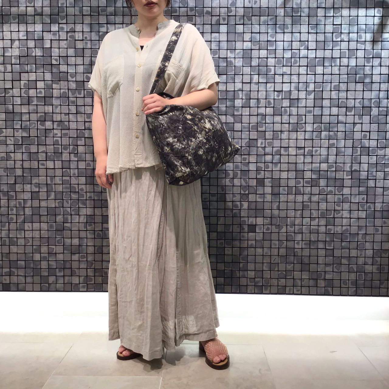 今回はぼかしプリントバッグを主役にコーディネートしました。